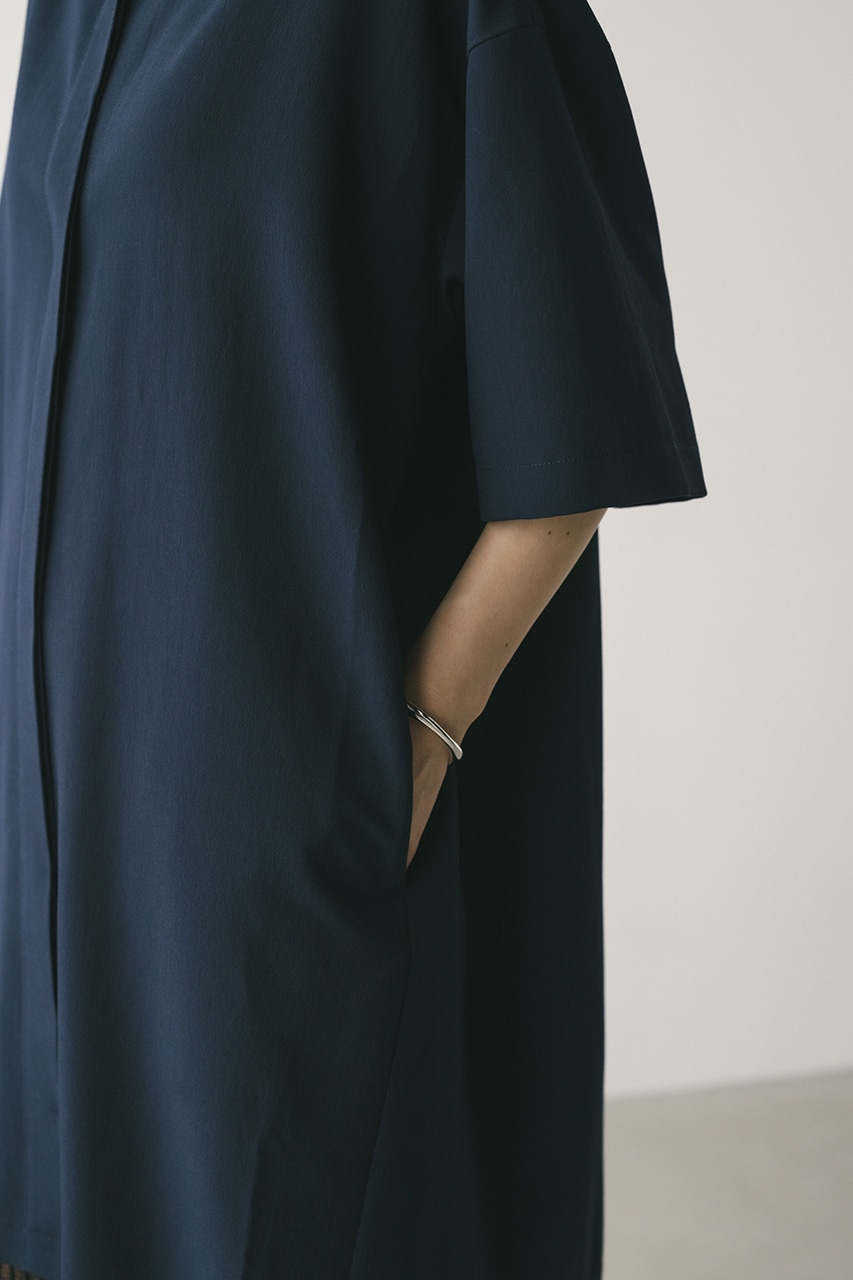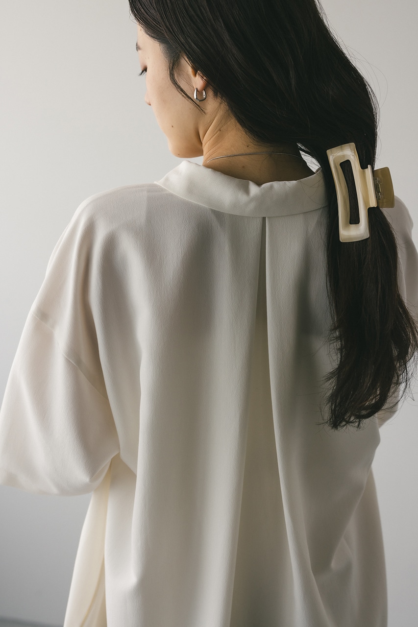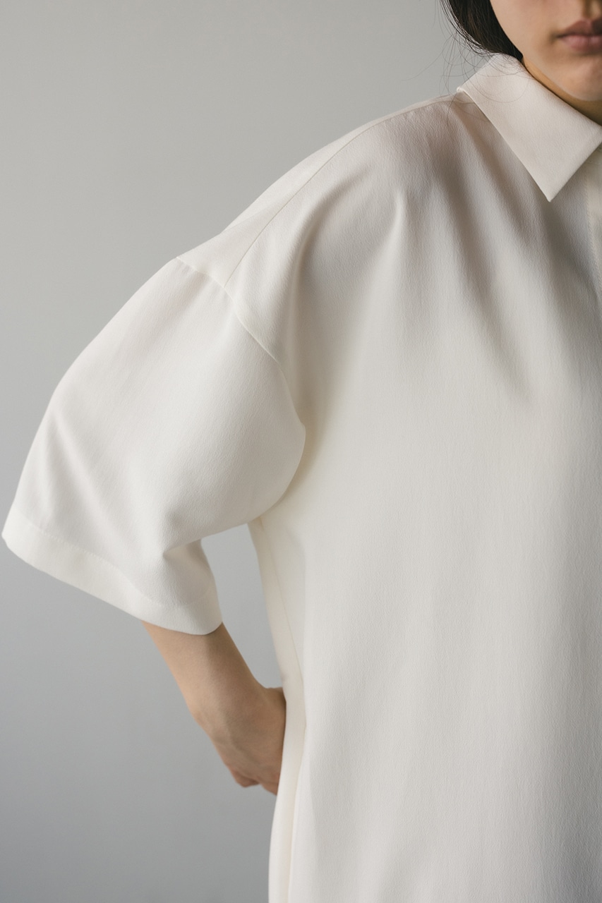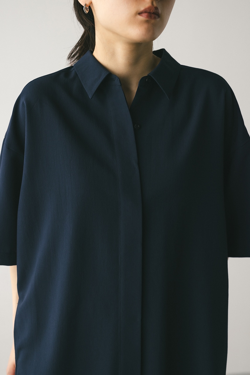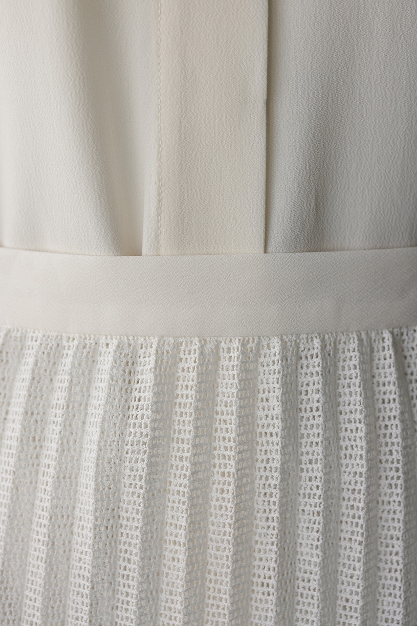 着回し力抜群のハーフスリーブのルーズシャツと格子柄のメッシュレースにプリーツ加工を施したラッププリーツスカートのセットアイテム。脇パネルを前にふったシャツはサイドからでもきれいに見せてくれるシルエットがポイント。ストレッチあり(シャツ)ストレッチなし(スカート)、透け感ややあり(シャツ)/透け感あり(スカート)