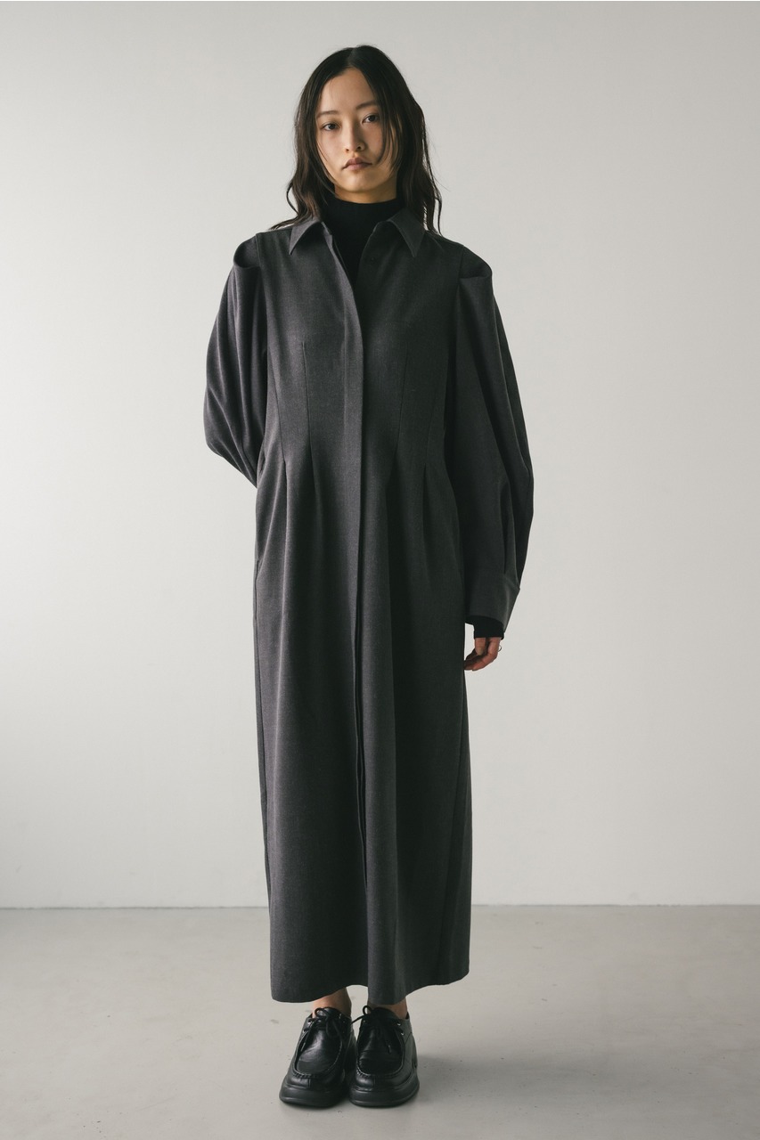袖に入ったタックデザインとやや太目なカーブスリーブがポイントの上品なシャツワンピース。ダーツを施したウエストデザインがスタイルアップに導きます。