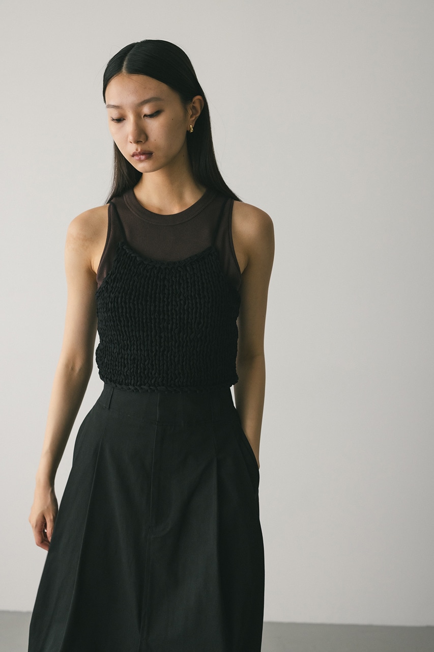 細く裁断したカットソー生地をつなぎあわせて、ハンドメイドで編みたてたビスチェ。カットソーを編んでいるので、ニットにはない独特のざっくりとした表面感と膨らみがあるのがポイントです。肩紐はあえて華奢に大人な印象に仕上げています。一枚ではもちろん、Tシャツなどとレイヤードして着用していただくのもおすすめです。ストレッチあり、透け感なし。