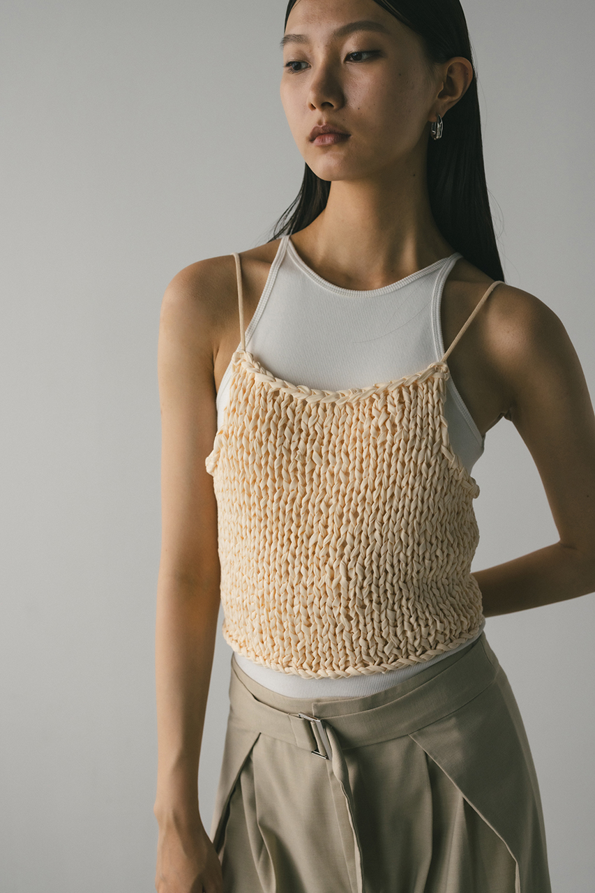 細く裁断したカットソー生地をつなぎあわせて、ハンドメイドで編みたてたビスチェ。カットソーを編んでいるので、ニットにはない独特のざっくりとした表面感と膨らみがあるのがポイントです。肩紐はあえて華奢に大人な印象に仕上げています。一枚ではもちろん、Tシャツなどとレイヤードして着用していただくのもおすすめです。ストレッチあり、透け感なし。
