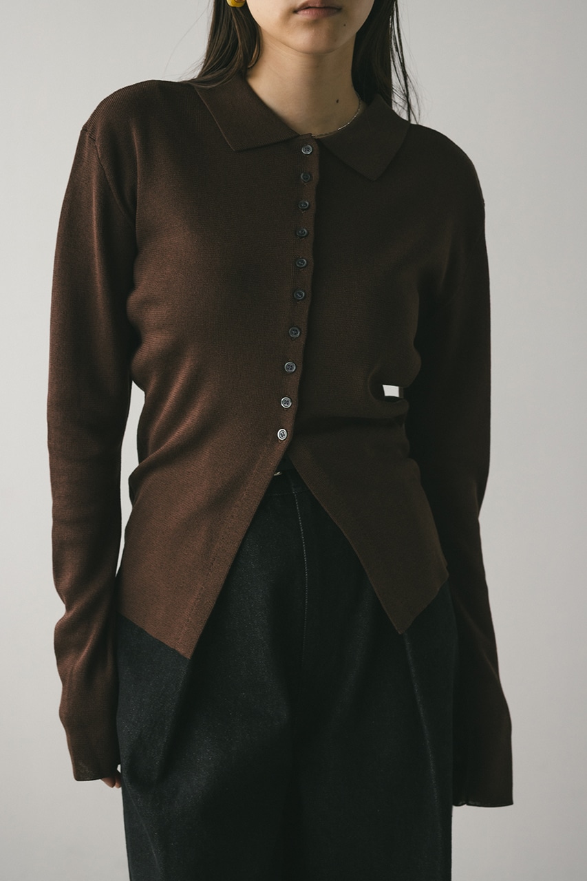 前後2WAYで着用可能なニットポロ。なめらかでさらりとした糸を使用。ビスコース混の微光沢が上品な印象に見せてくれます。総針に編み立てにしているのでボディーラインもひびきにくい一枚です。ストレッチあり、透け感なし。