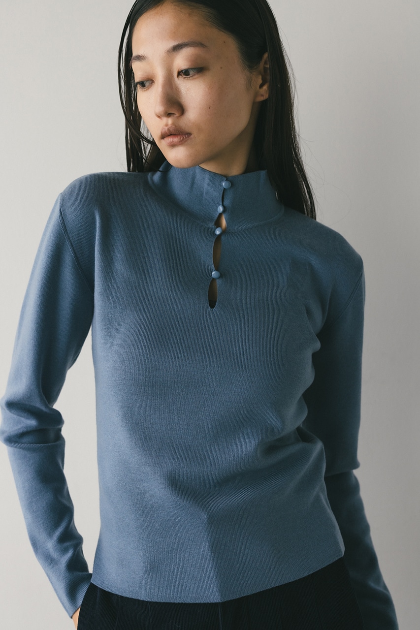 フロントの涙開きが女性らしい抜け感をプラスしてくれる美シルエットのニットトップ。ネック部分はボタンを閉めるとハイネック、開けると襟ネックと2WAYで着用いただけます。ストレッチ糸をプレーティングして仕上げているので身体に程よくフィットし、着心地の良い一枚。ストレッチあり、透け感なし。