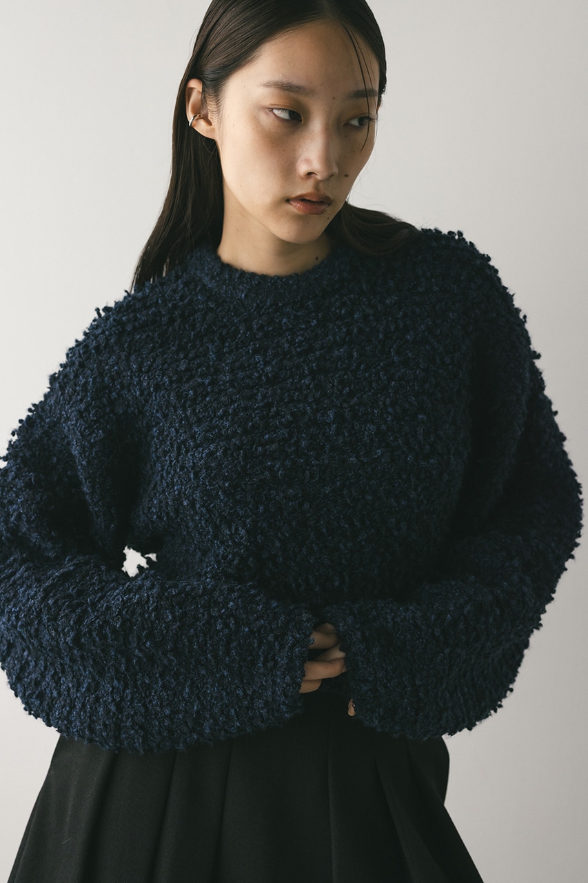 ざっくりとした凹凸のある生地が存在感のあるニット。シンプルな形ながらもスラブニットならではの絶妙なカラーリングがポイント。袖口と裾に細いゴムを入れる事で丸いフォルムシルエットに。程よく厚みがあるのであえてショルダ―パネルを後ろに倒して肩回りをすっきりと見せてくれるデザインに仕上げました。ストレッチあり、透け感なし。