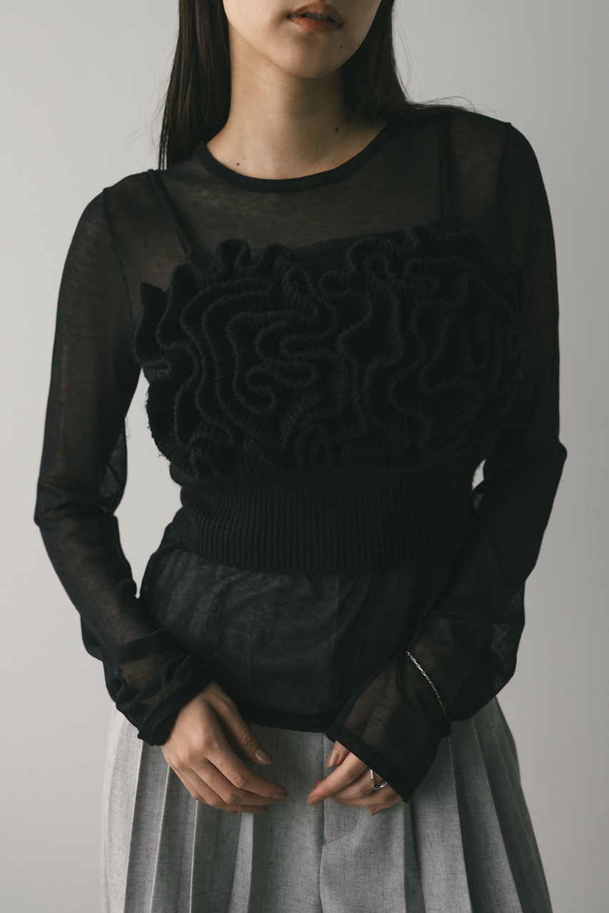 ランダムに付けたニットフリルがポイントのニットビスチェ。立体感のある可愛いフリルは、動きのでるようにランダム感とフリルのつけ位置にこだわったデザイン。脇部分はあえてフリルをはずし、脇はうごきやすく、フリルの幅を狭くすることで着痩せ見えするように仕上げました。ニットやシャツとレイヤードして着用していただくのがおすすめです。ストレッチあり、透け感なし。