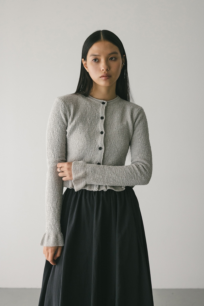 袖口と裾のフリルデザインがポイントのデザインニット。ループ糸をアムンゼンで編むことでシワになりにくく、独特な表面感に仕上げました。