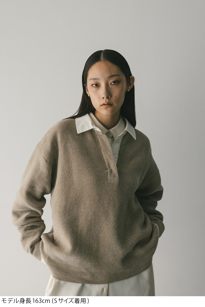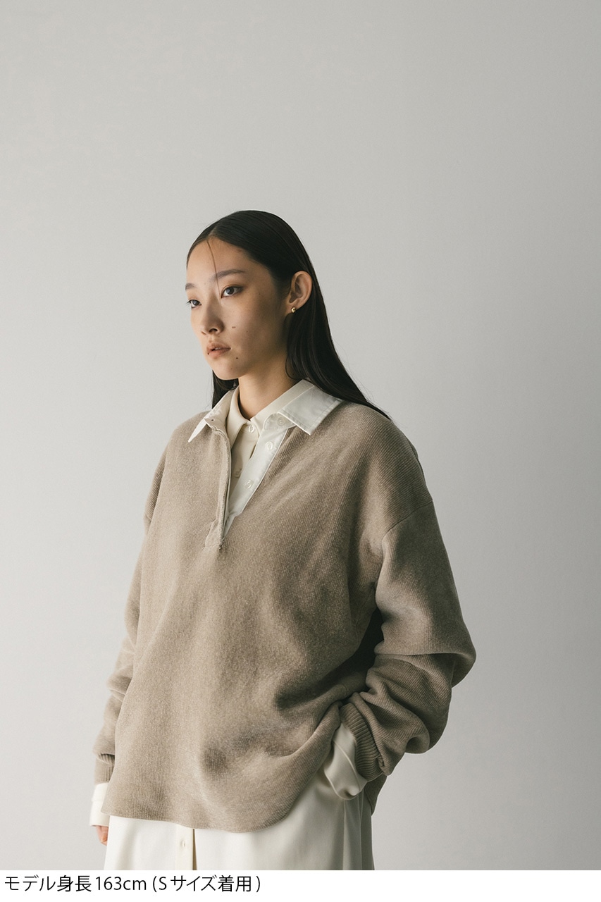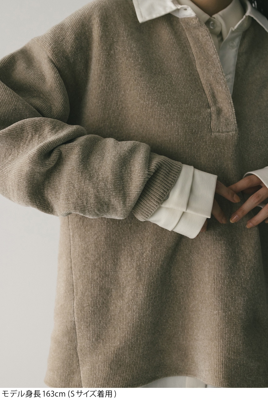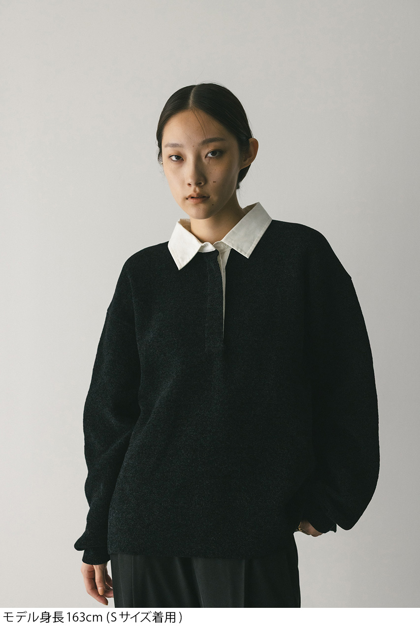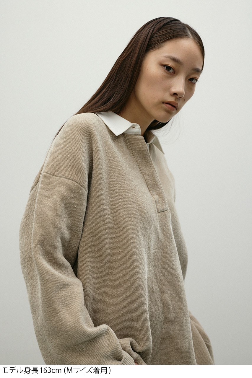 ニットで編み上げたベロアライクな質感がポイントのラガーニットトップ。毛足の短いモール糸を使用し、厚みのでるよう接結編みで仕上げた非常に高級見えする一枚。接結編みにすることで程よく厚みを出しつつ、ニットでも形崩れしにくいふんわりとした柔らかい肌触りに仕上げました。ラグビージャージのコットン衿などオーセンティックなディテールを活かしつつ、肩位置を落としたドロップショルダーデザインで、大人のトレンドスタイルに導きます。ストレッチあり、透け感なし。