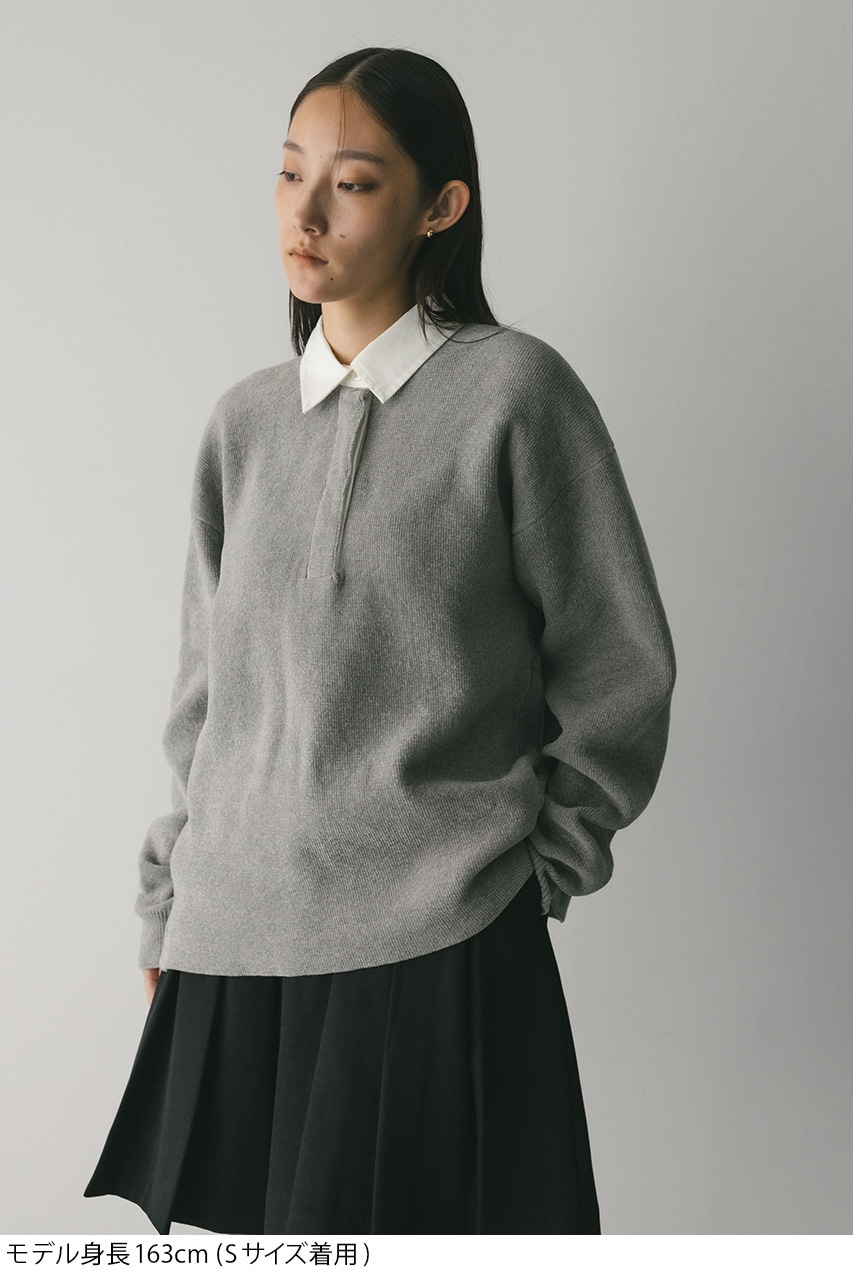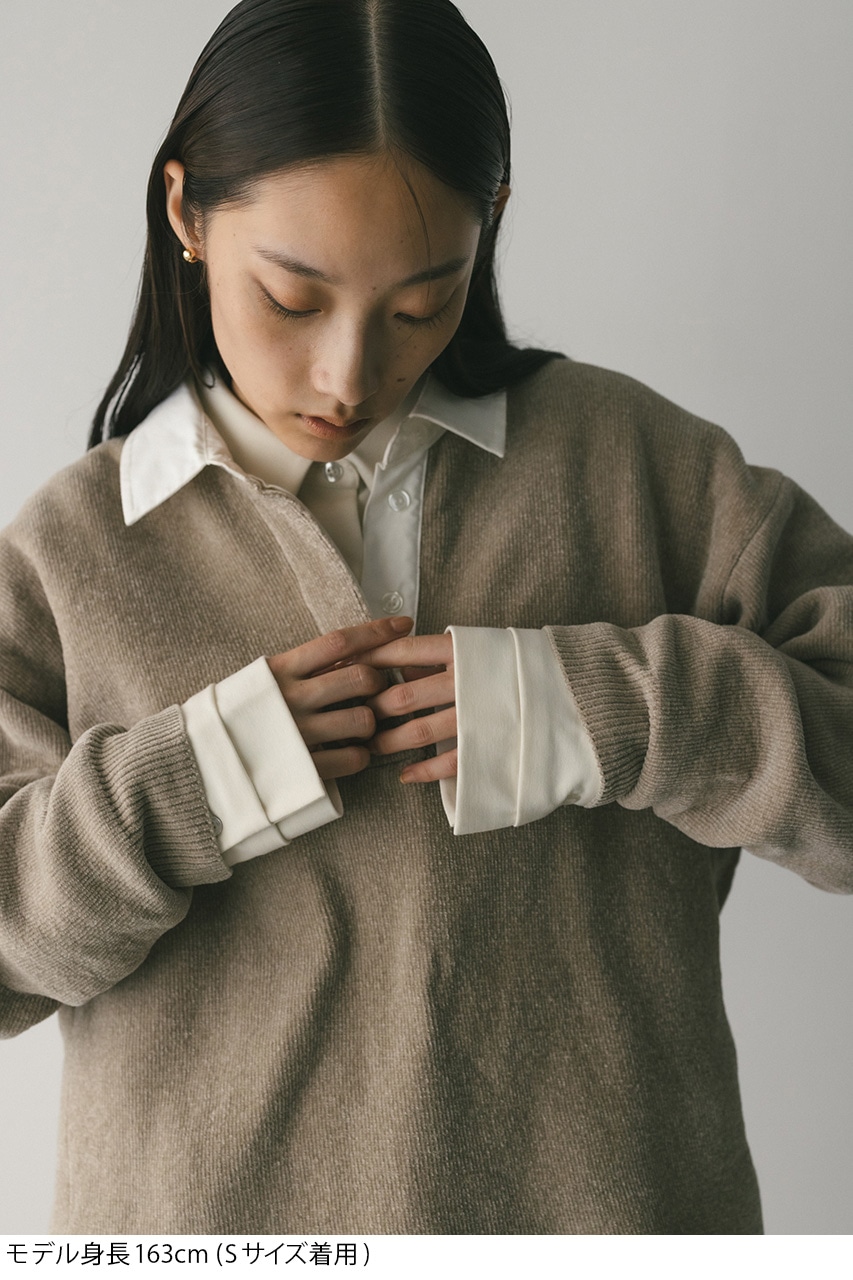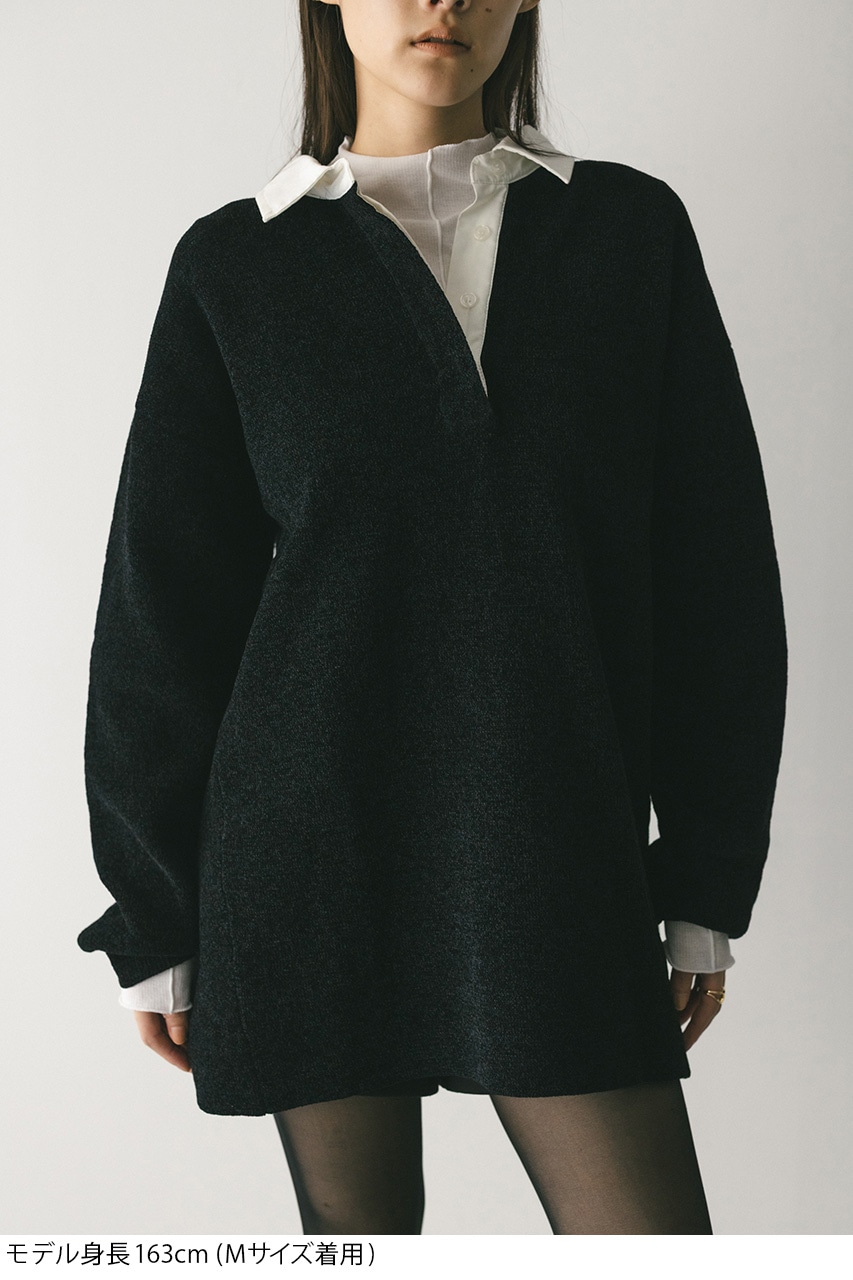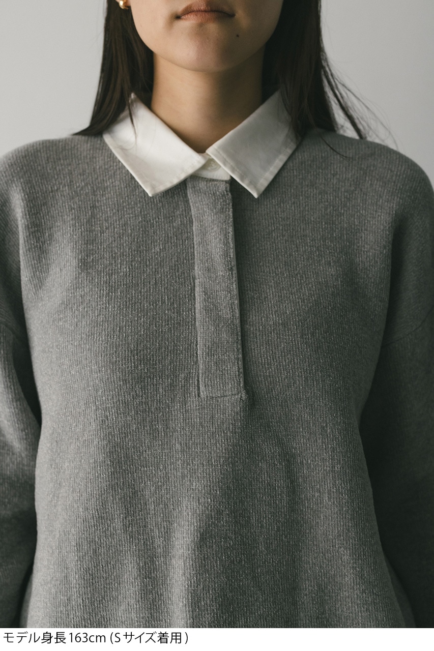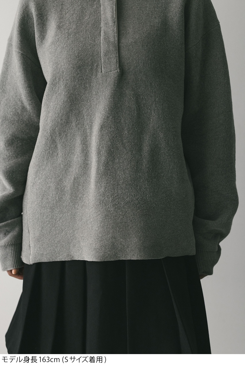 ニットで編み上げたベロアライクな質感がポイントのラガーニットトップ。毛足の短いモール糸を使用し、厚みのでるよう接結編みで仕上げた非常に高級見えする一枚。接結編みにすることで程よく厚みを出しつつ、ニットでも形崩れしにくいふんわりとした柔らかい肌触りに仕上げました。ラグビージャージのコットン衿などオーセンティックなディテールを活かしつつ、肩位置を落としたドロップショルダーデザインで、大人のトレンドスタイルに導きます。ストレッチあり、透け感なし。