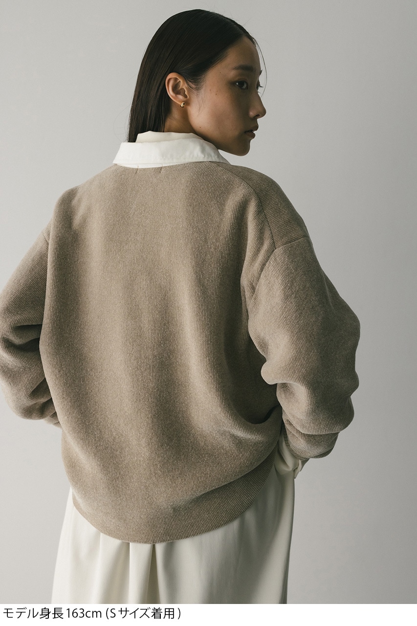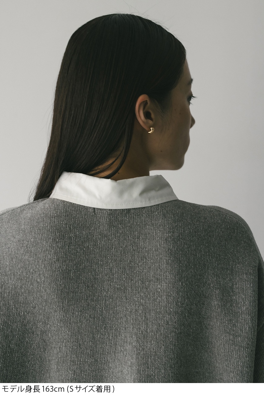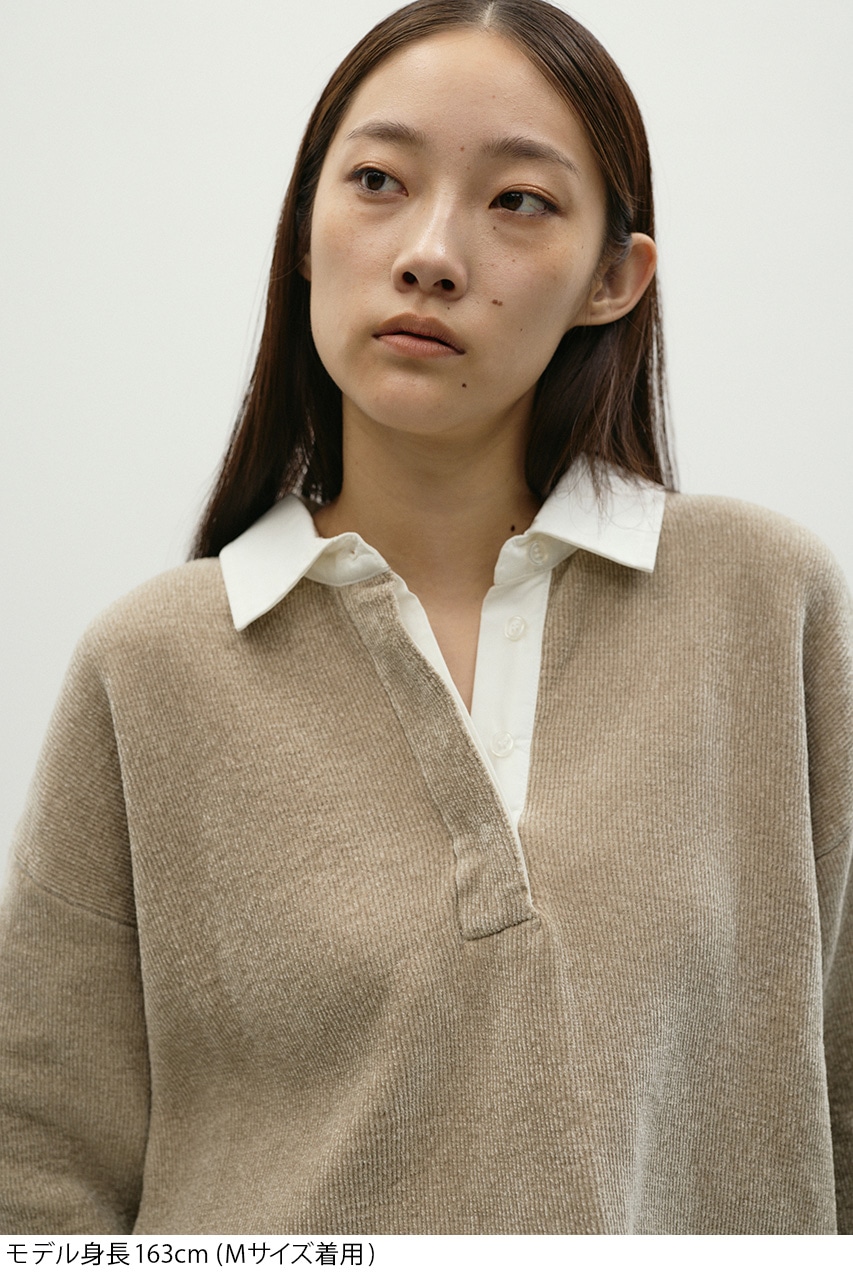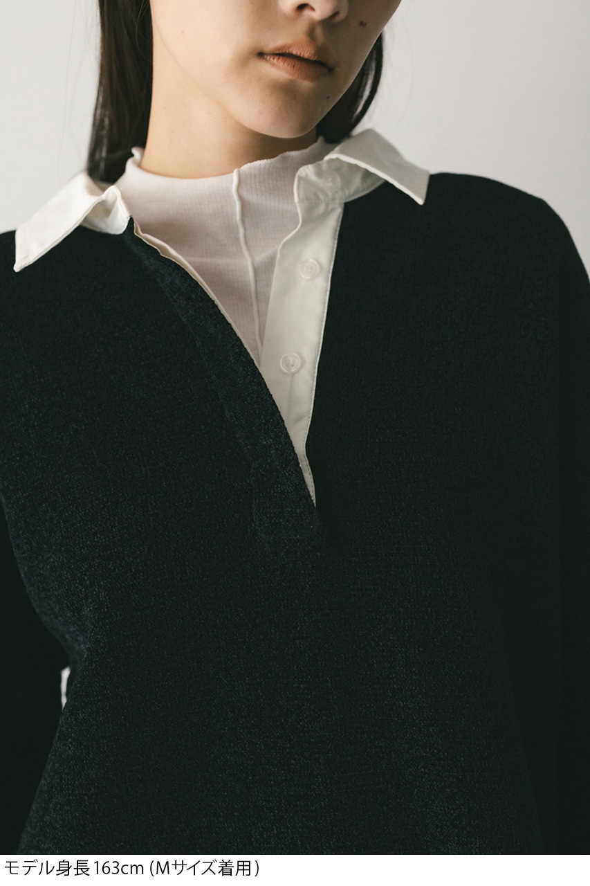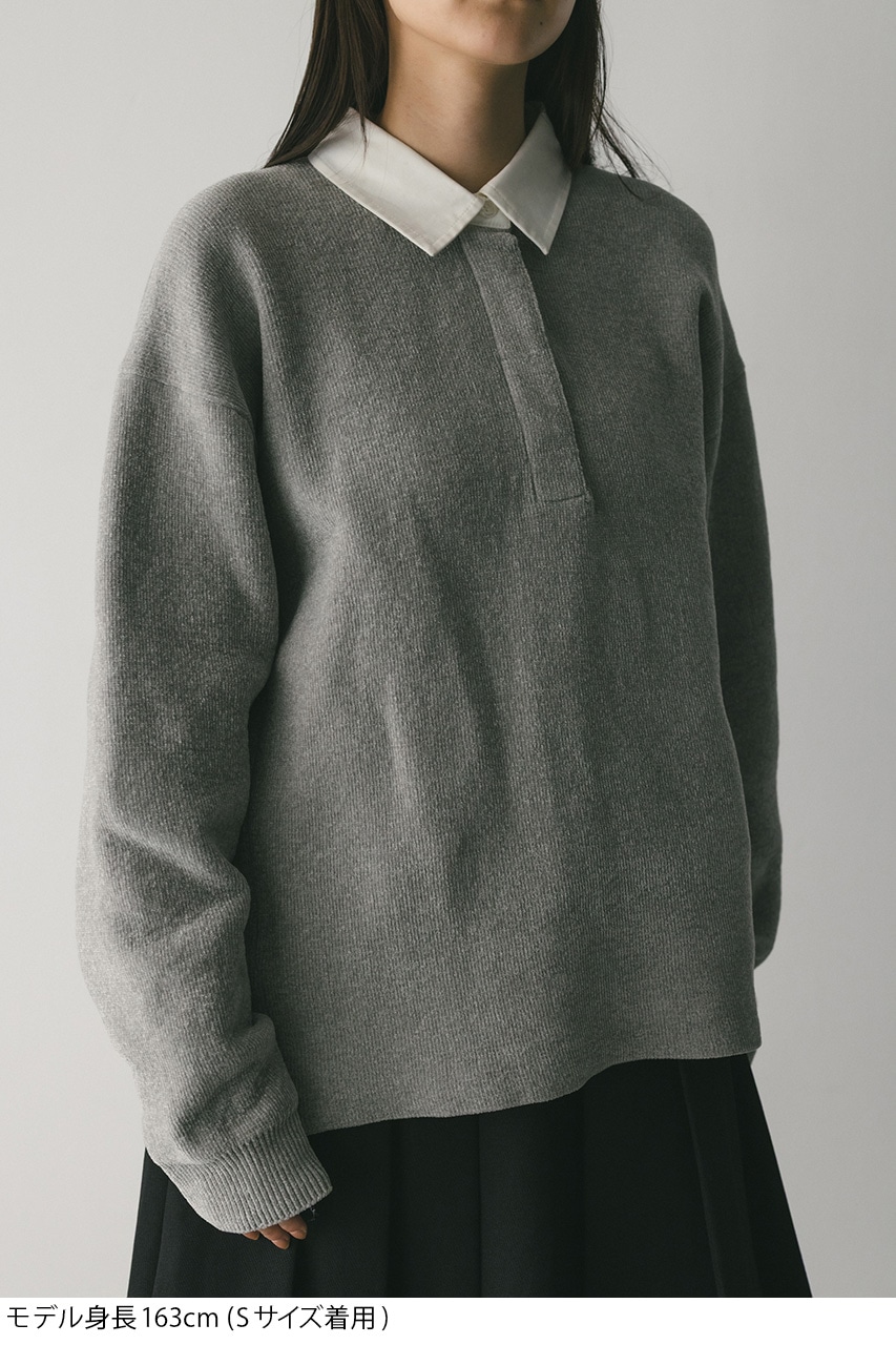 ニットで編み上げたベロアライクな質感がポイントのラガーニットトップ。毛足の短いモール糸を使用し、厚みのでるよう接結編みで仕上げた非常に高級見えする一枚。接結編みにすることで程よく厚みを出しつつ、ニットでも形崩れしにくいふんわりとした柔らかい肌触りに仕上げました。ラグビージャージのコットン衿などオーセンティックなディテールを活かしつつ、肩位置を落としたドロップショルダーデザインで、大人のトレンドスタイルに導きます。ストレッチあり、透け感なし。