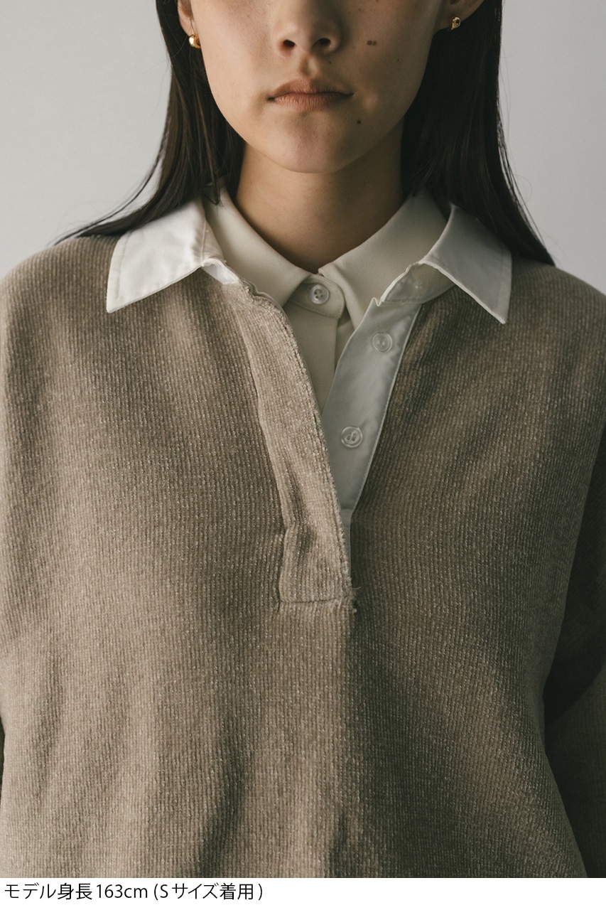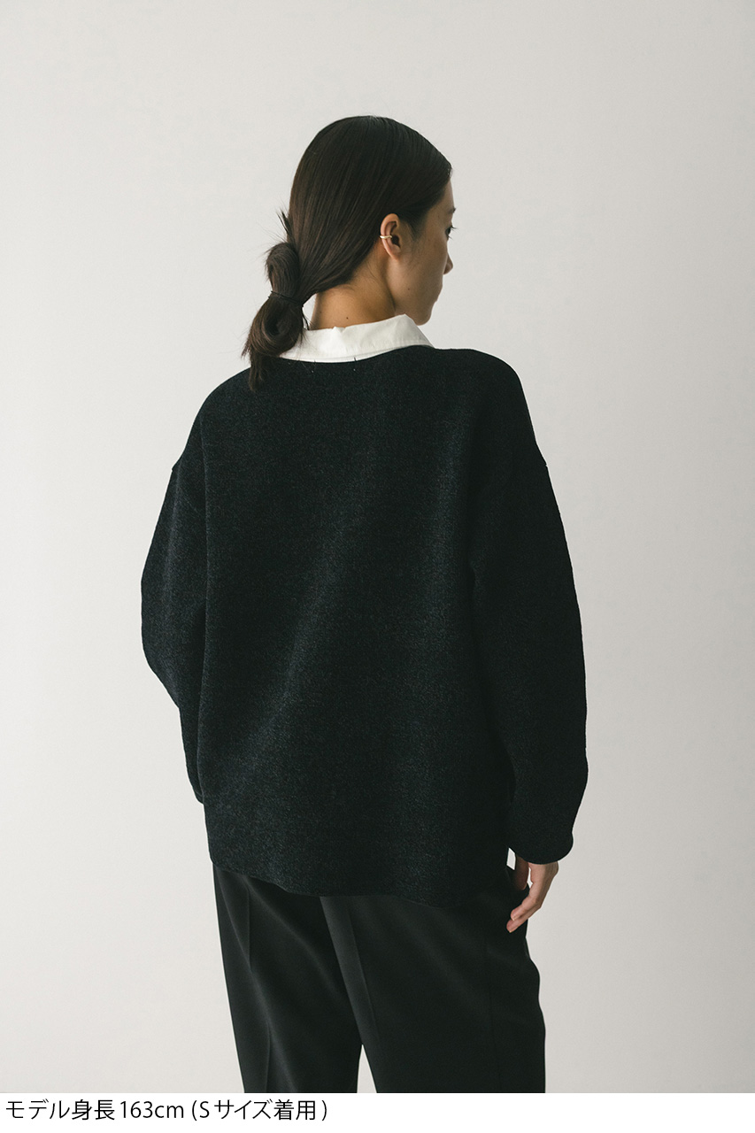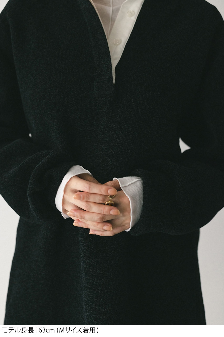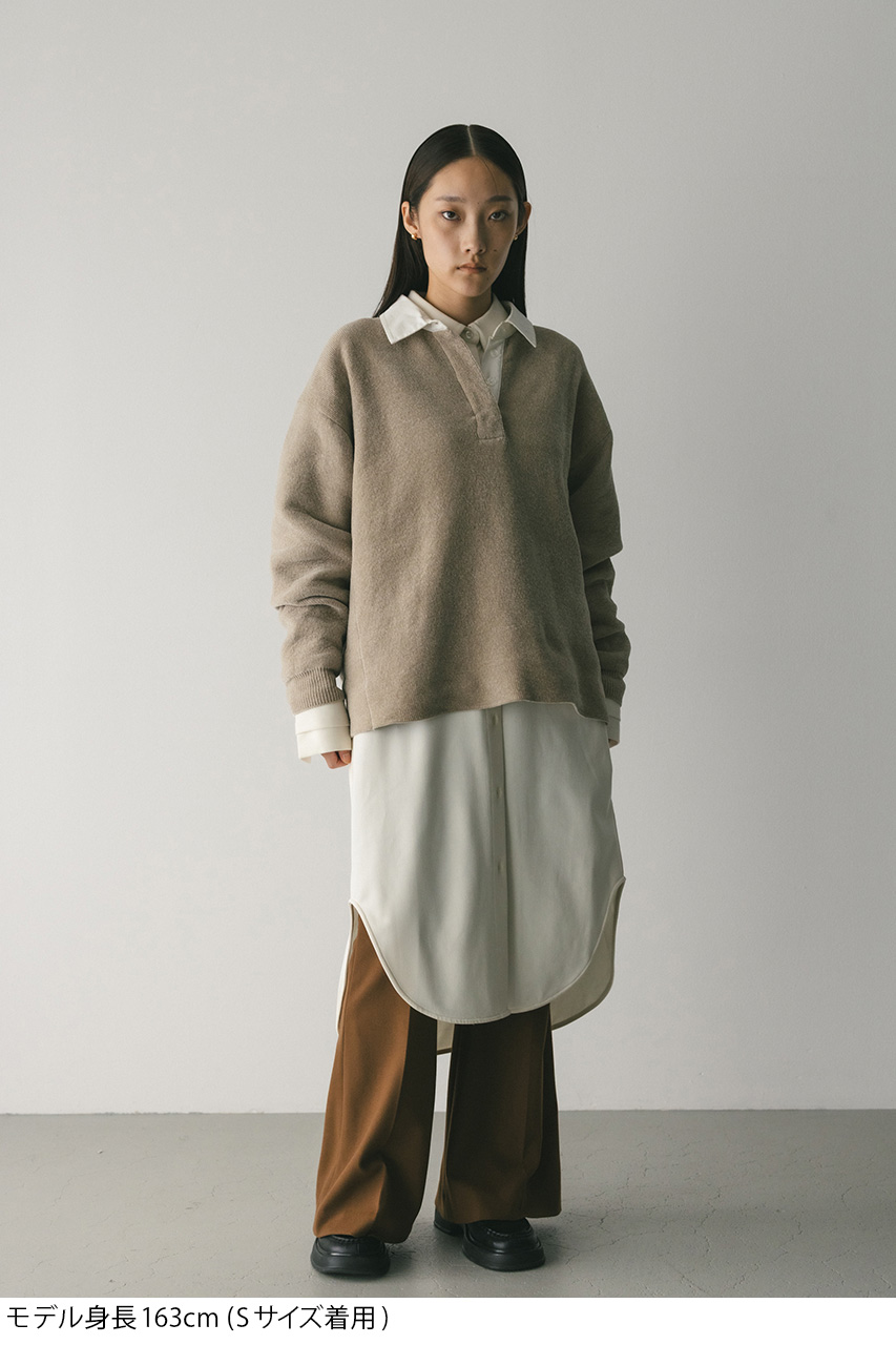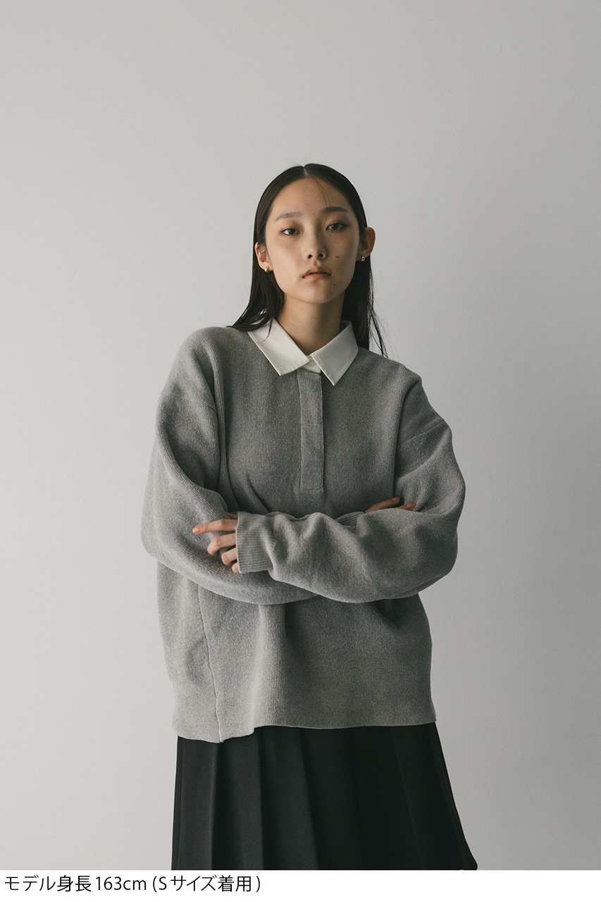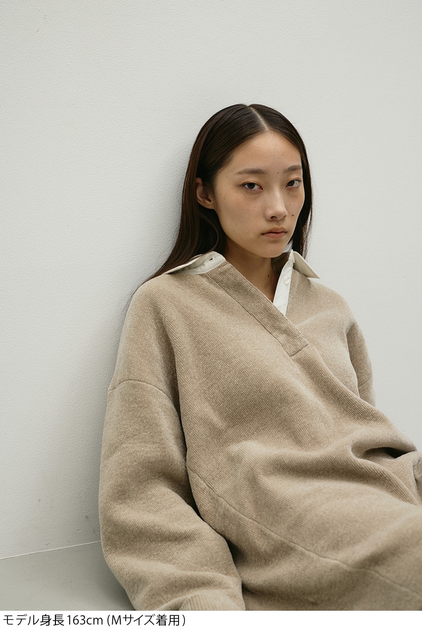 ニットで編み上げたベロアライクな質感がポイントのラガーニットトップ。毛足の短いモール糸を使用し、厚みのでるよう接結編みで仕上げた非常に高級見えする一枚。接結編みにすることで程よく厚みを出しつつ、ニットでも形崩れしにくいふんわりとした柔らかい肌触りに仕上げました。ラグビージャージのコットン衿などオーセンティックなディテールを活かしつつ、肩位置を落としたドロップショルダーデザインで、大人のトレンドスタイルに導きます。ストレッチあり、透け感なし。