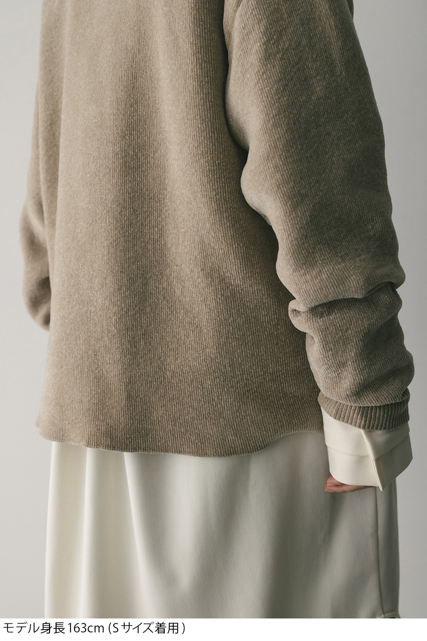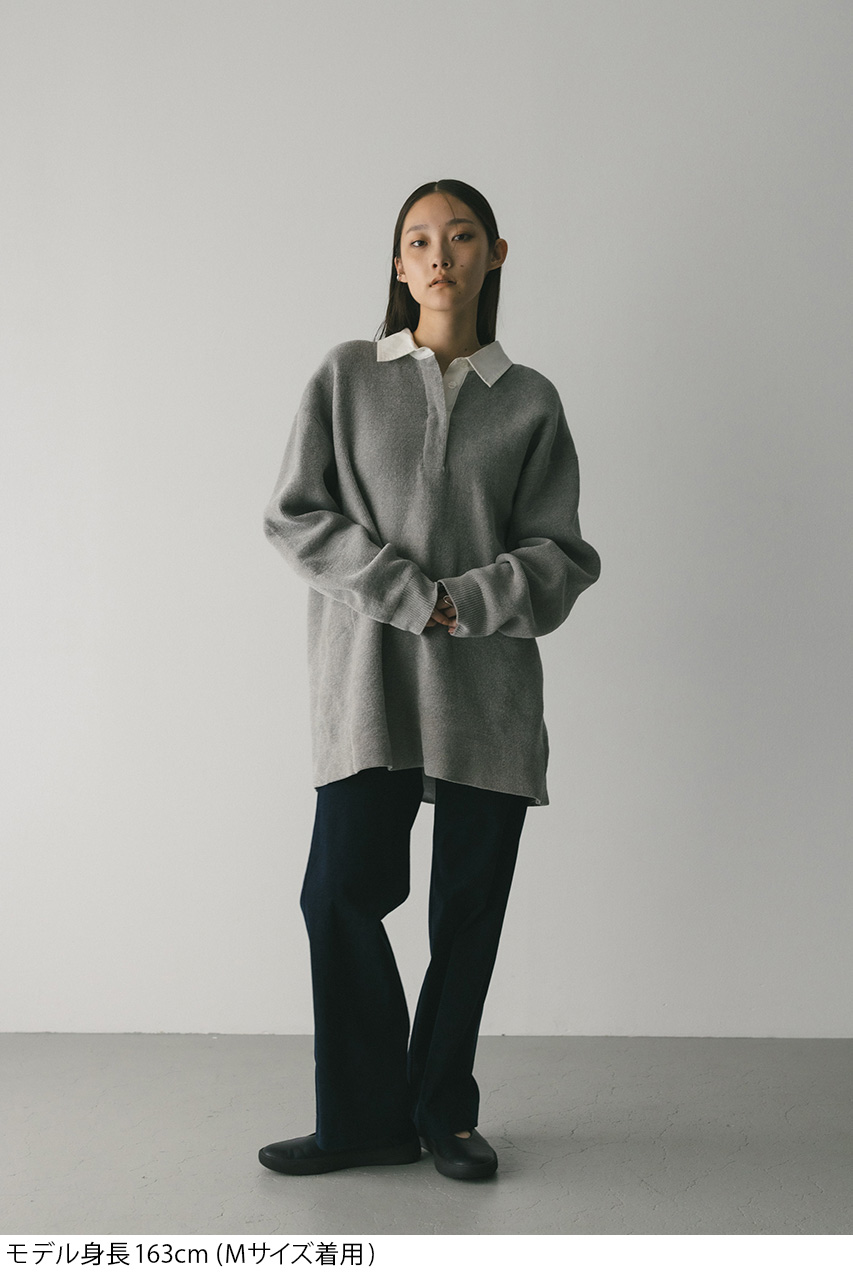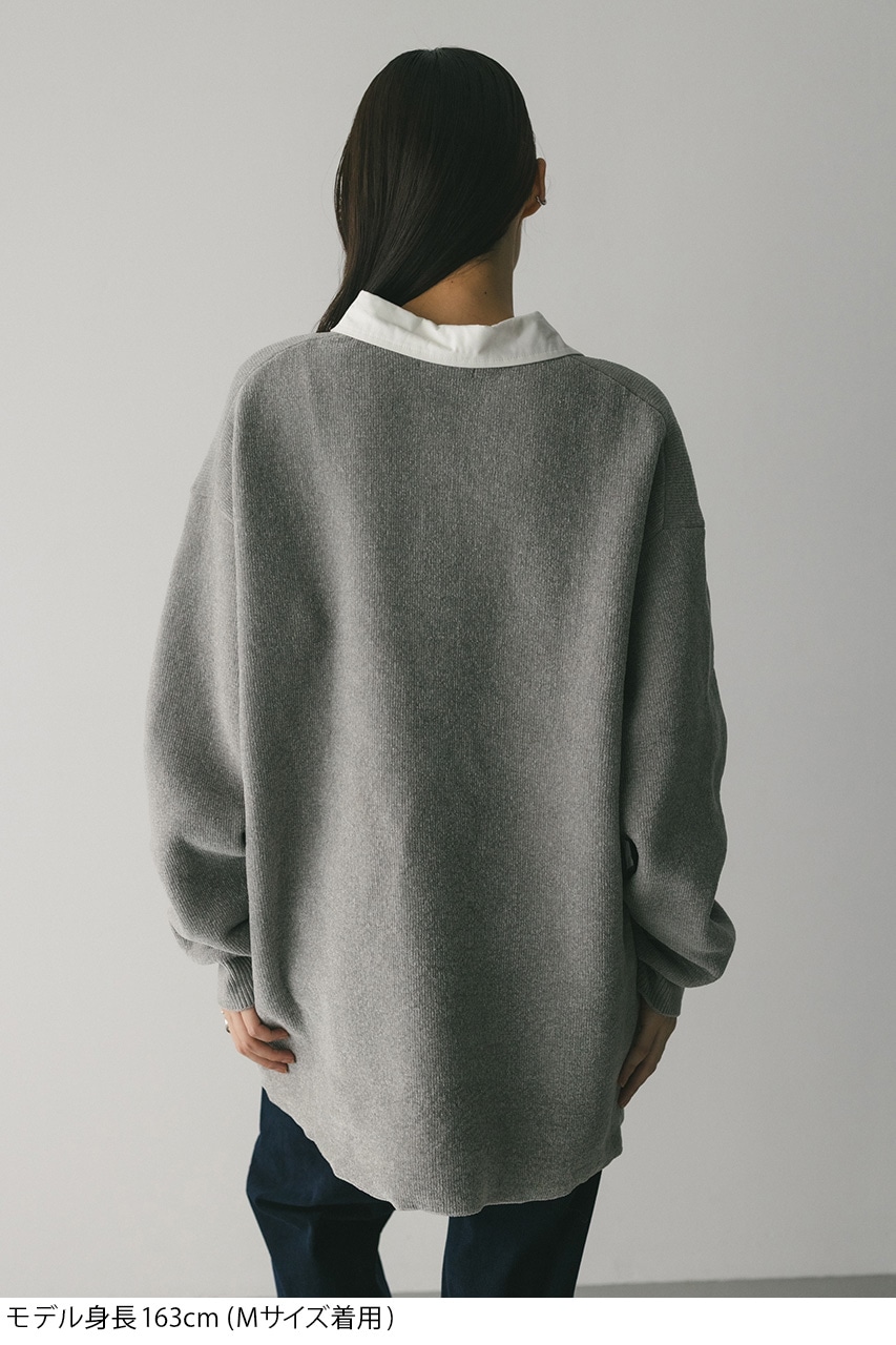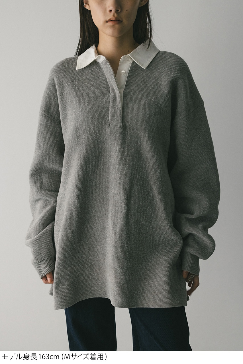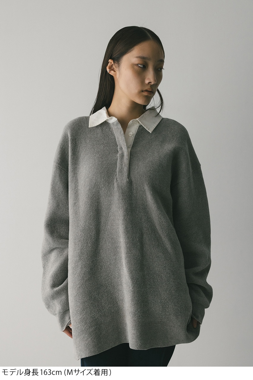 ニットで編み上げたベロアライクな質感がポイントのラガーニットトップ。毛足の短いモール糸を使用し、厚みのでるよう接結編みで仕上げた非常に高級見えする一枚。接結編みにすることで程よく厚みを出しつつ、ニットでも形崩れしにくいふんわりとした柔らかい肌触りに仕上げました。ラグビージャージのコットン衿などオーセンティックなディテールを活かしつつ、肩位置を落としたドロップショルダーデザインで、大人のトレンドスタイルに導きます。ストレッチあり、透け感なし。