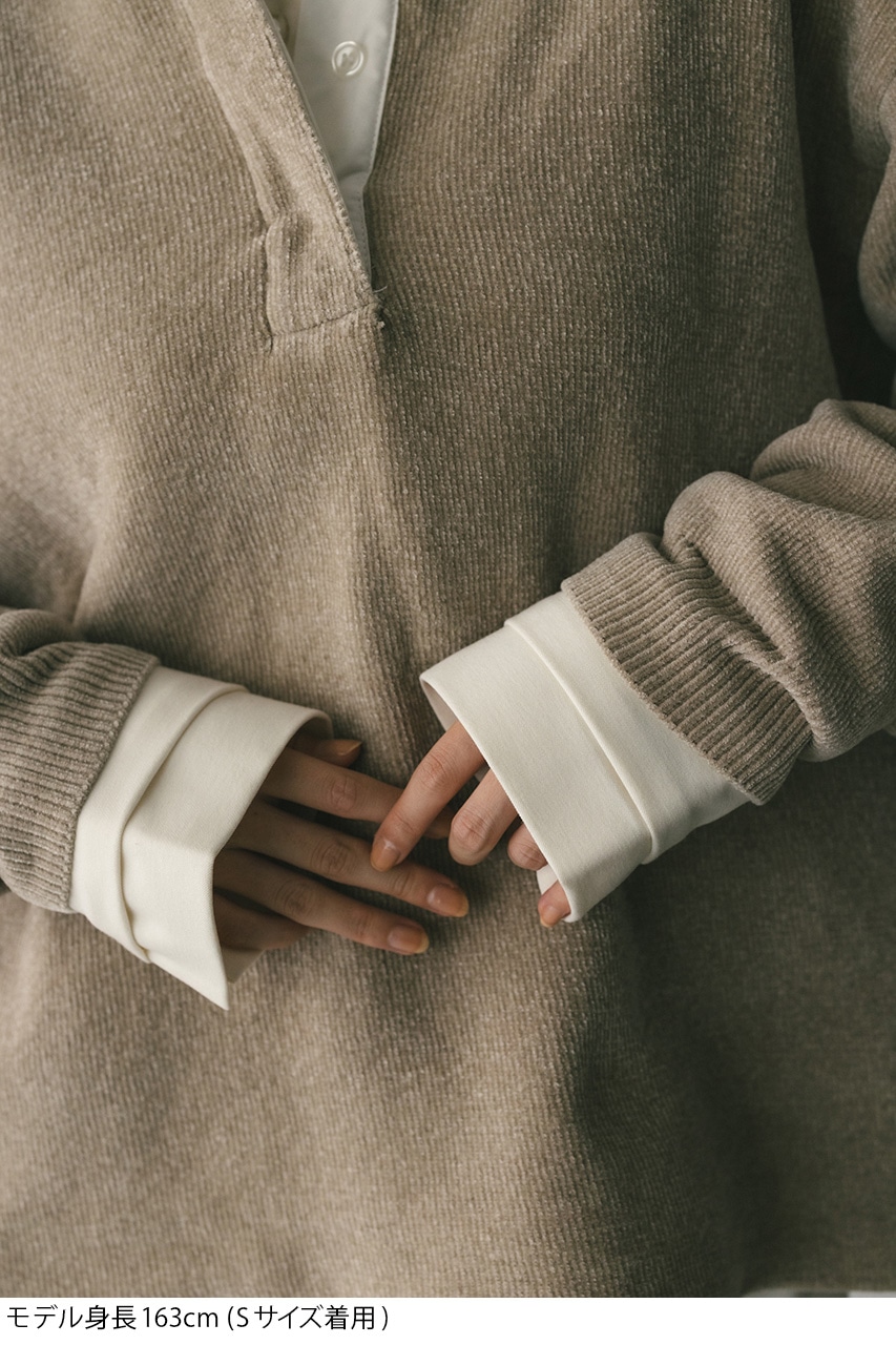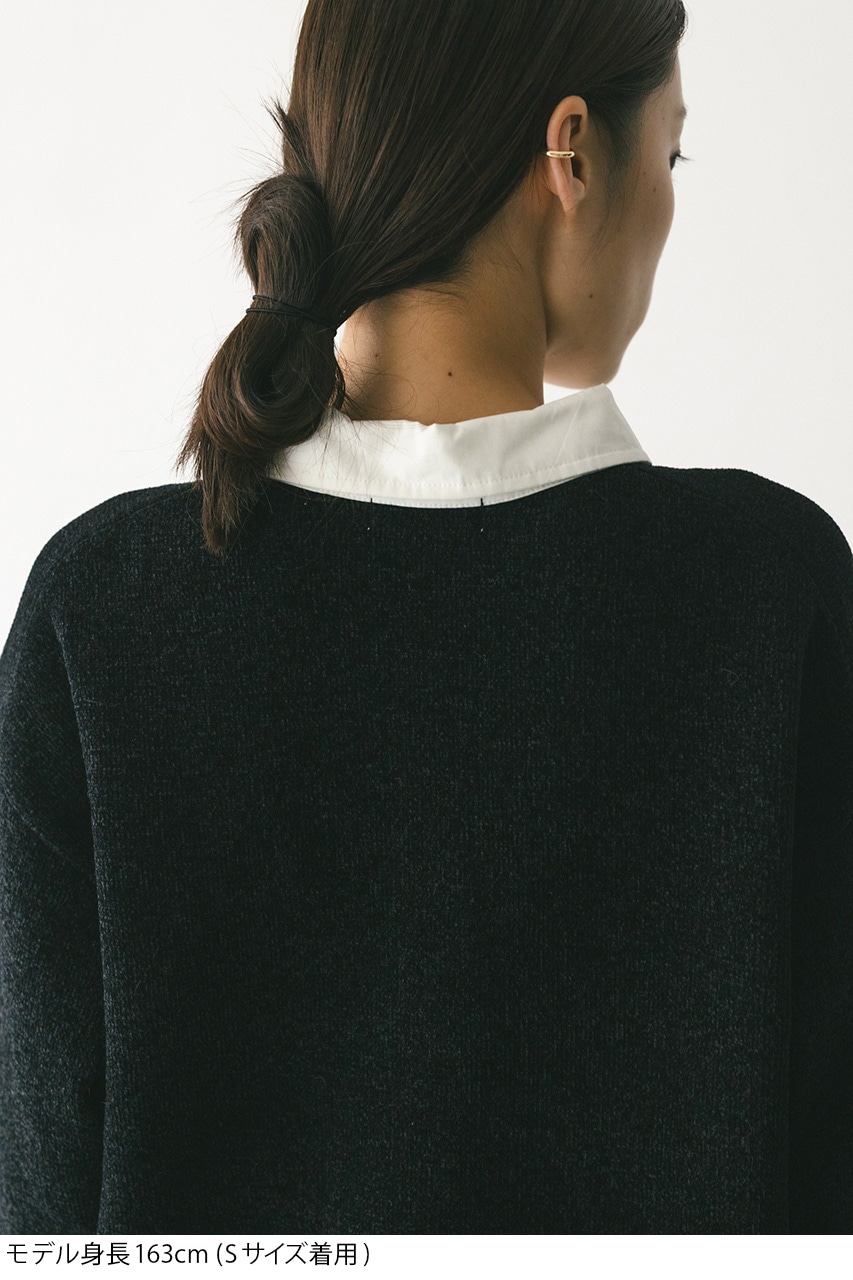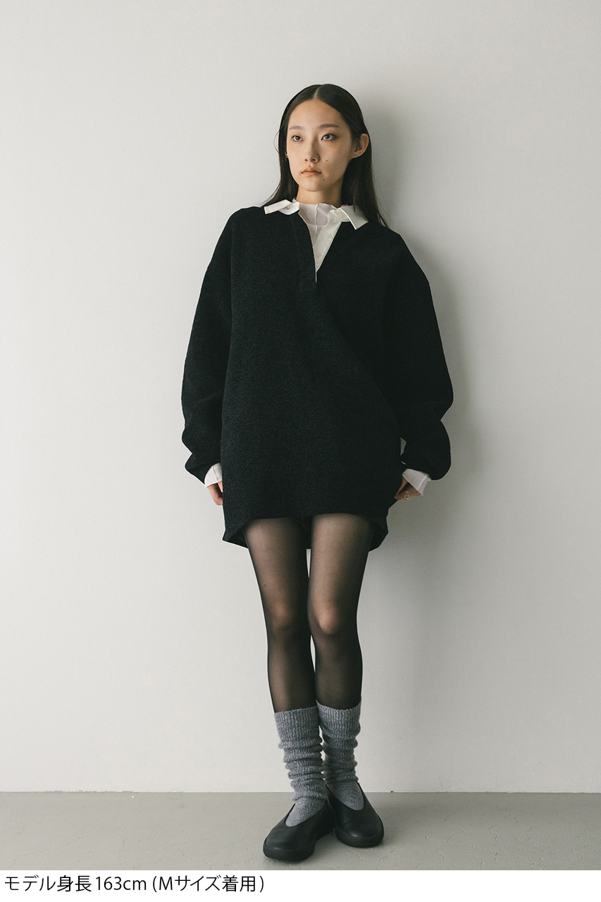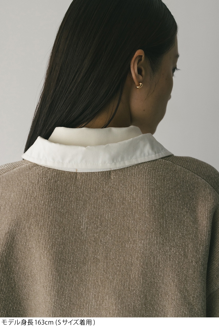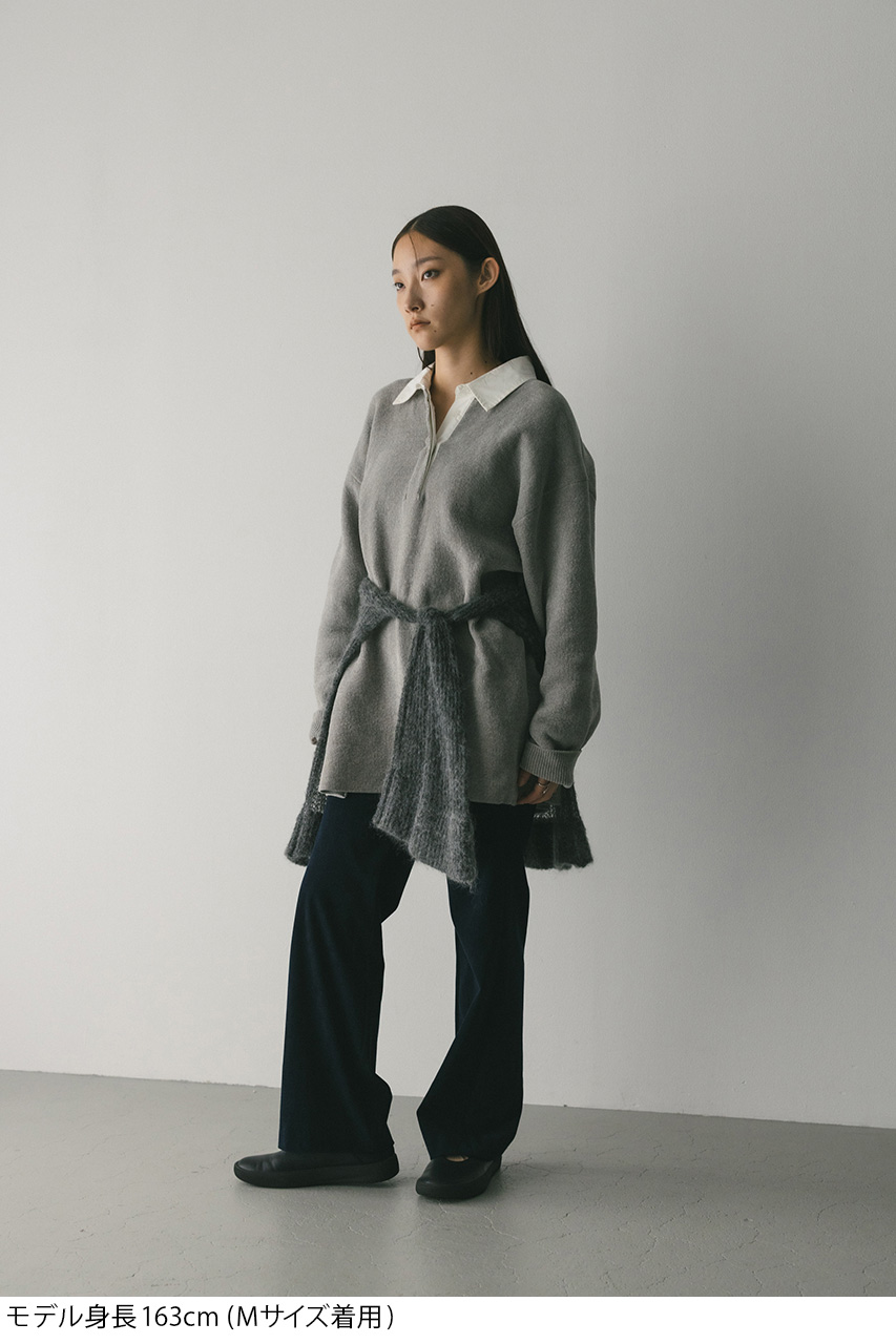 ニットで編み上げたベロアライクな質感がポイントのラガーニットトップ。毛足の短いモール糸を使用し、厚みのでるよう接結編みで仕上げた非常に高級見えする一枚。接結編みにすることで程よく厚みを出しつつ、ニットでも形崩れしにくいふんわりとした柔らかい肌触りに仕上げました。ラグビージャージのコットン衿などオーセンティックなディテールを活かしつつ、肩位置を落としたドロップショルダーデザインで、大人のトレンドスタイルに導きます。ストレッチあり、透け感なし。