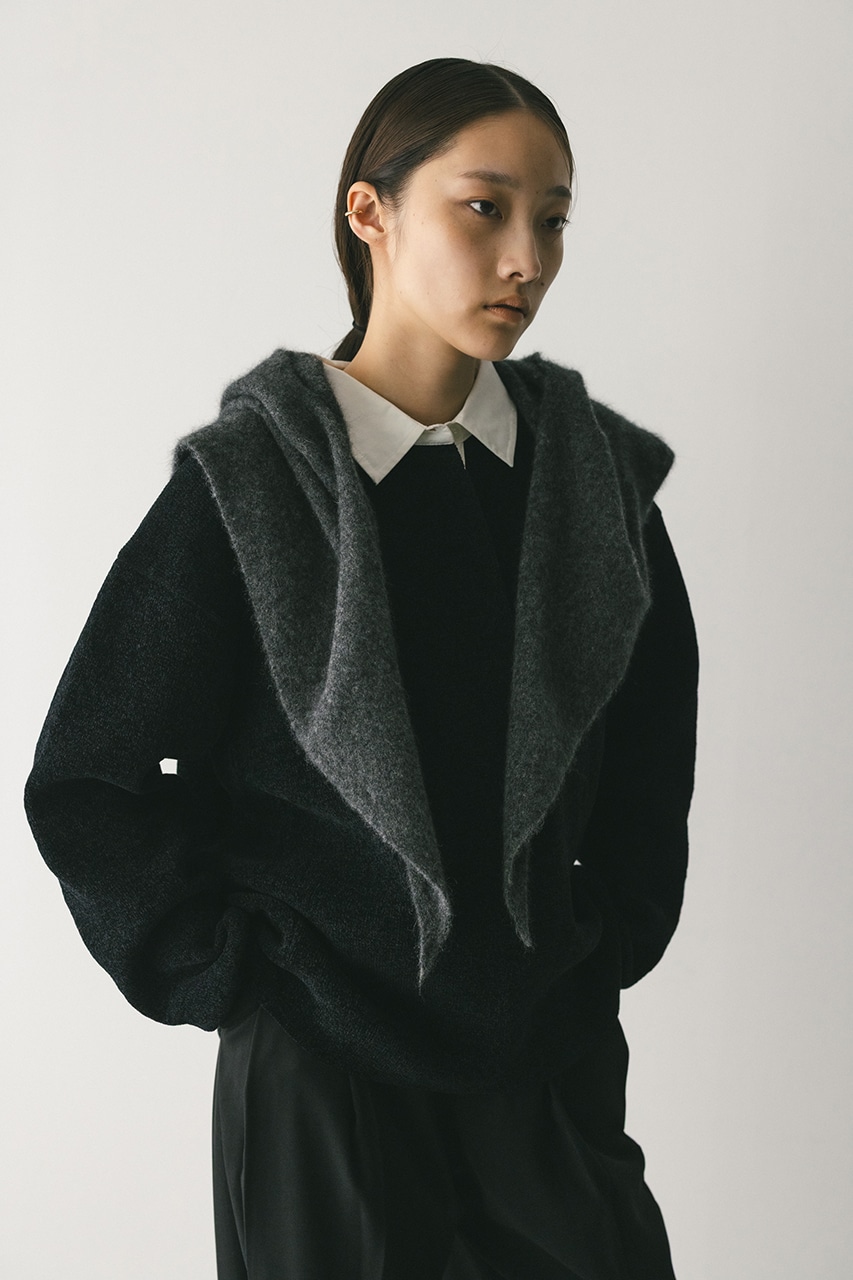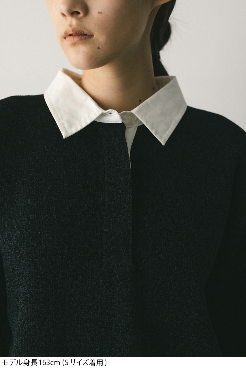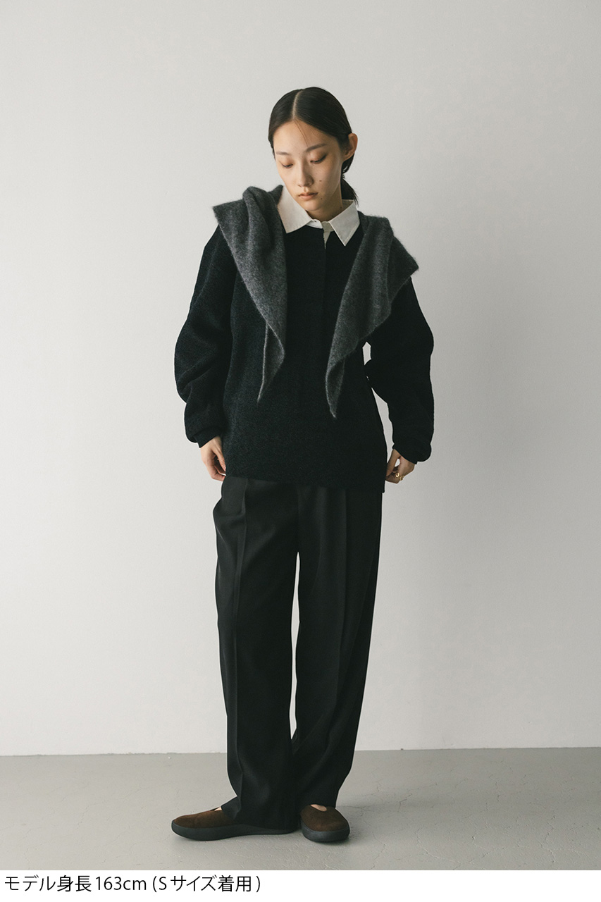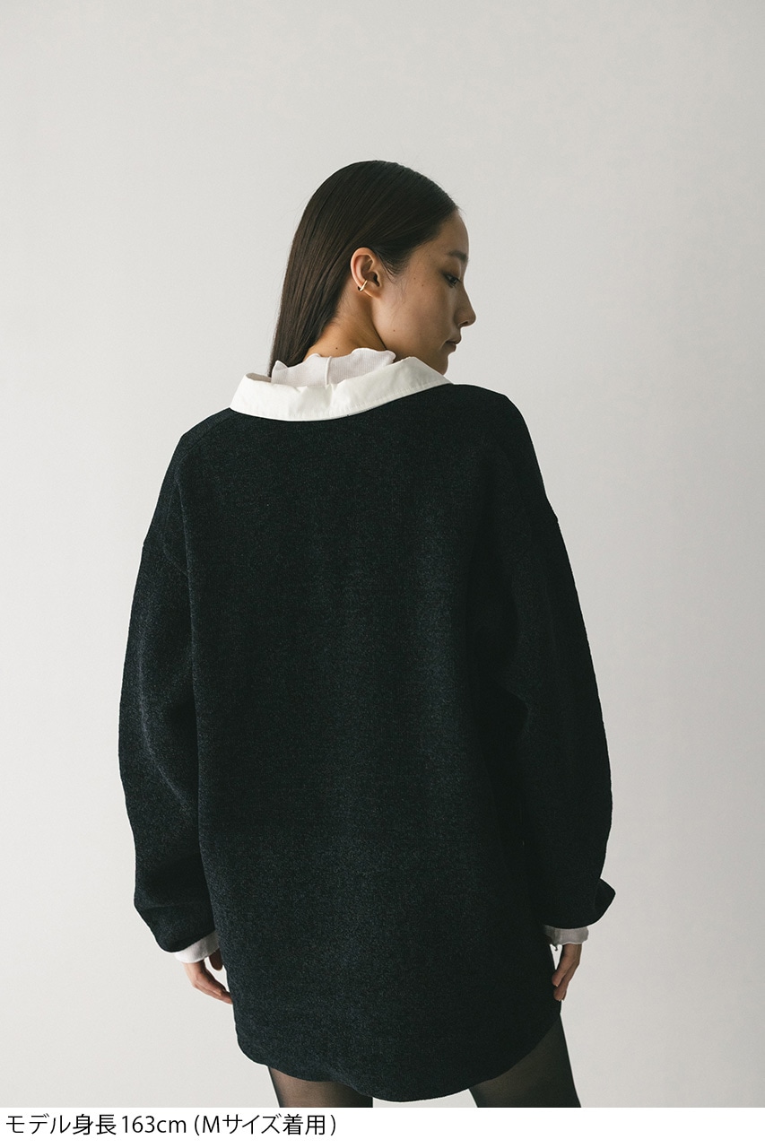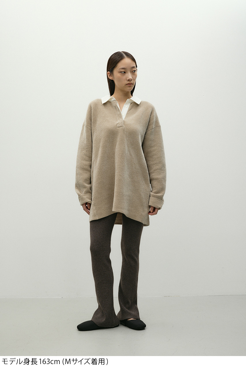 ニットで編み上げたベロアライクな質感がポイントのラガーニットトップ。毛足の短いモール糸を使用し、厚みのでるよう接結編みで仕上げた非常に高級見えする一枚。接結編みにすることで程よく厚みを出しつつ、ニットでも形崩れしにくいふんわりとした柔らかい肌触りに仕上げました。ラグビージャージのコットン衿などオーセンティックなディテールを活かしつつ、肩位置を落としたドロップショルダーデザインで、大人のトレンドスタイルに導きます。ストレッチあり、透け感なし。