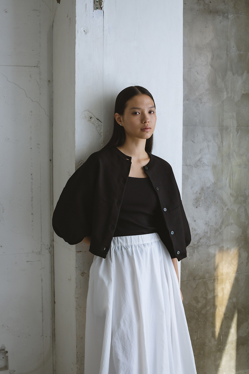 大きく入ったラウンドパネルが作るシルエットが可愛いカーデ。軽さもありながらしっかりとした素材で仕上げた一枚。モードにもカジュアルにも着用頂けます。透け感なし、ストレッチあり。