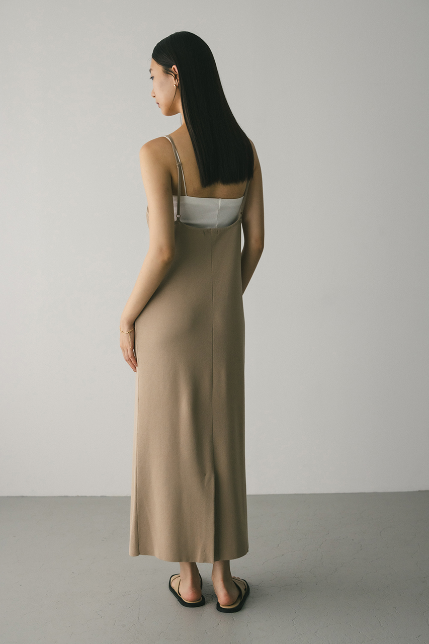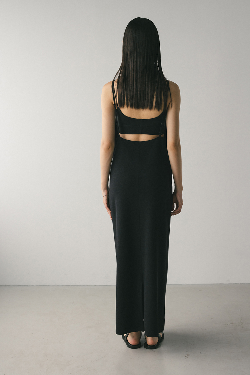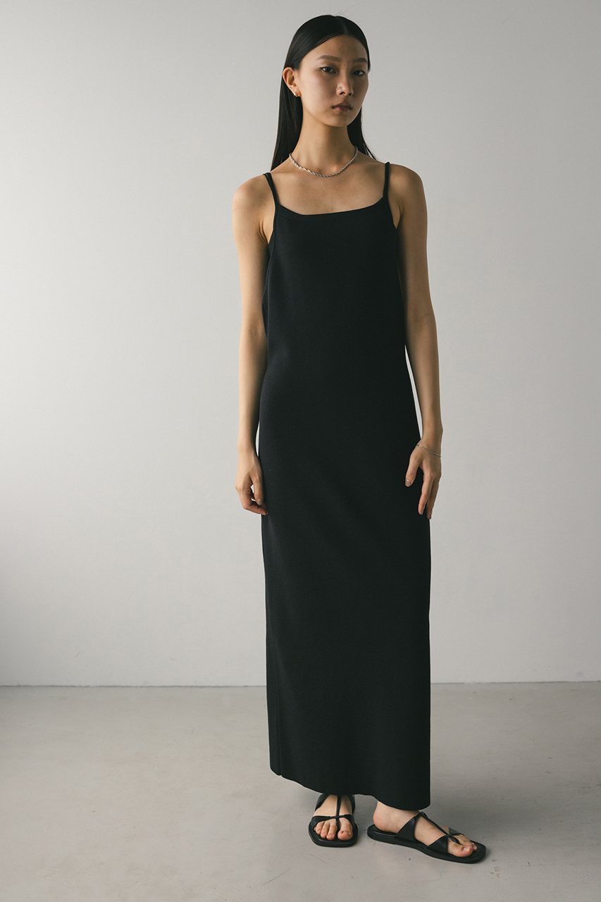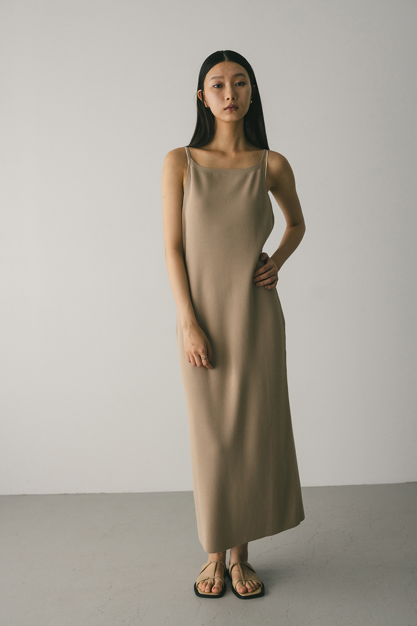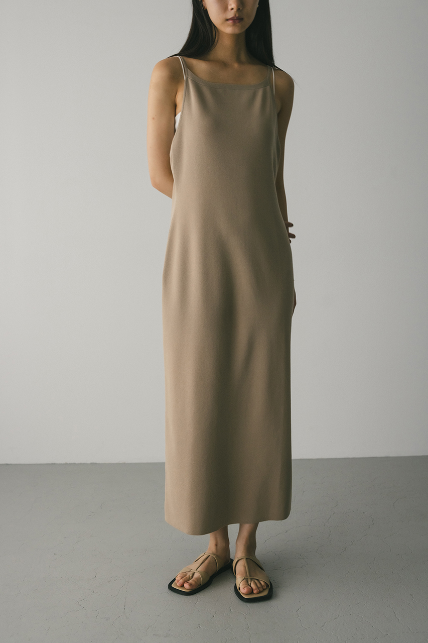 バックが大きくあいたニットワンピース。上品な微光沢がありつつ、通気性も良いビスコース混のコットン糸を使用。ドライタッチな糸で、落ち感が少しあるので上品な印象に見せてくれます。肩紐調節可能。ストレッチあり、透け感なし。
