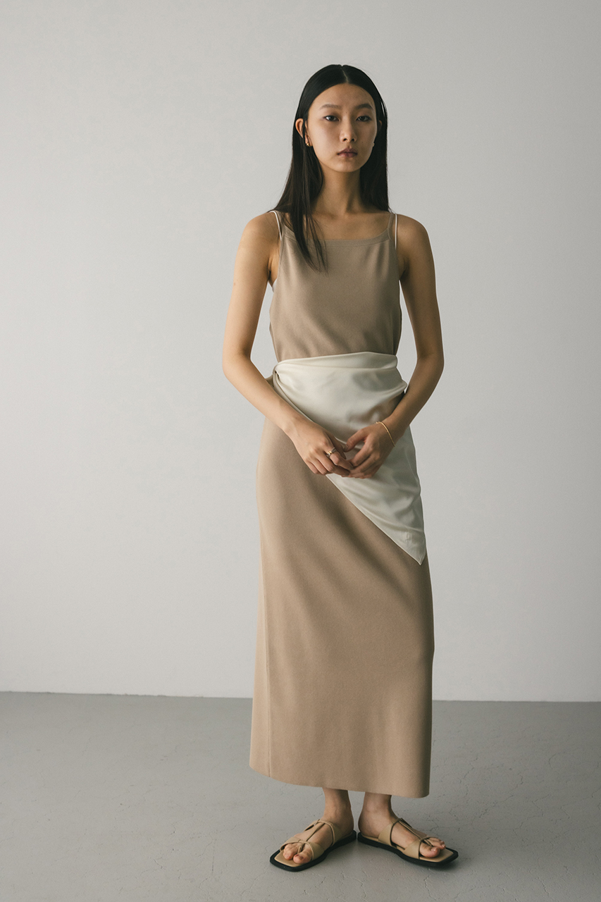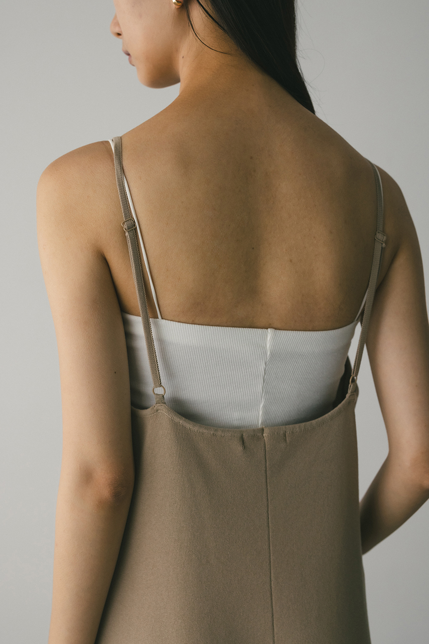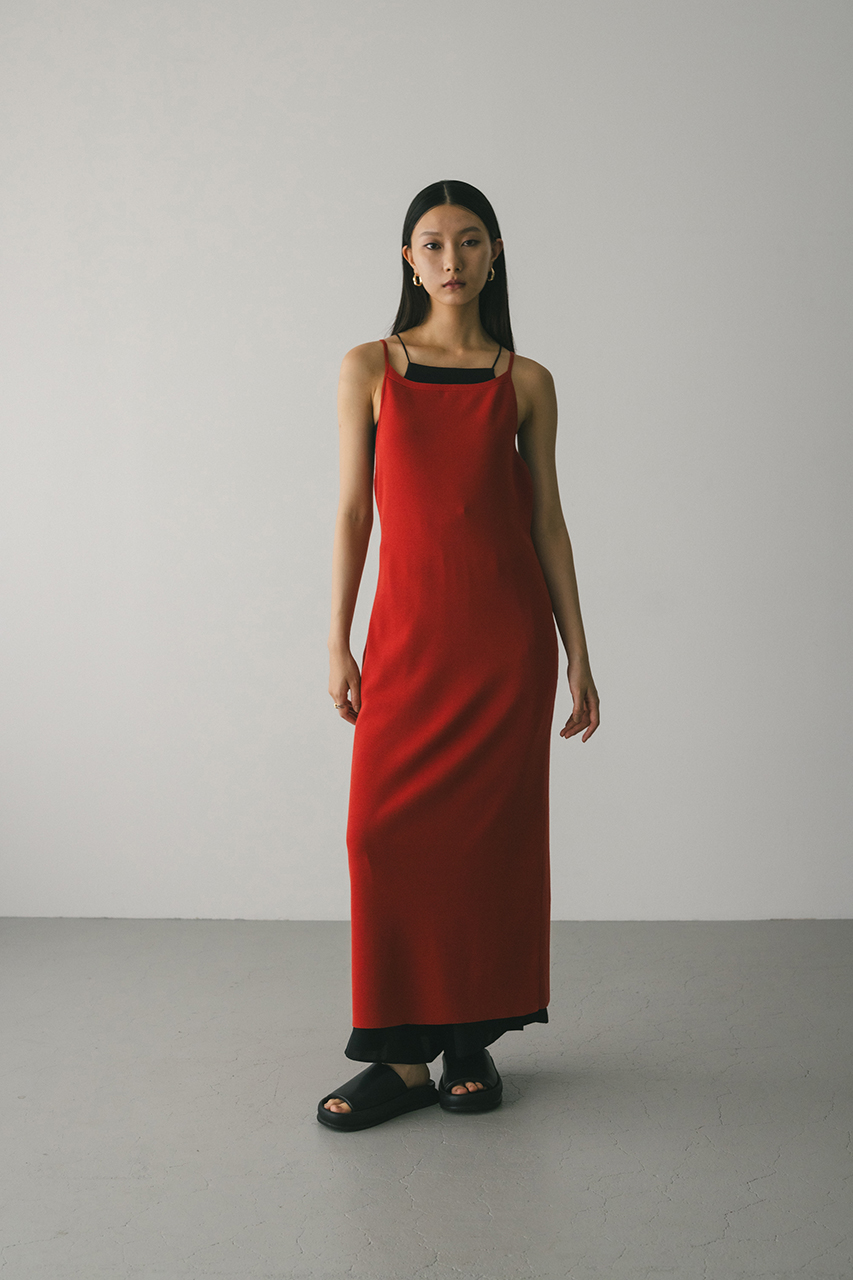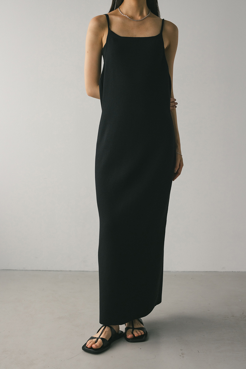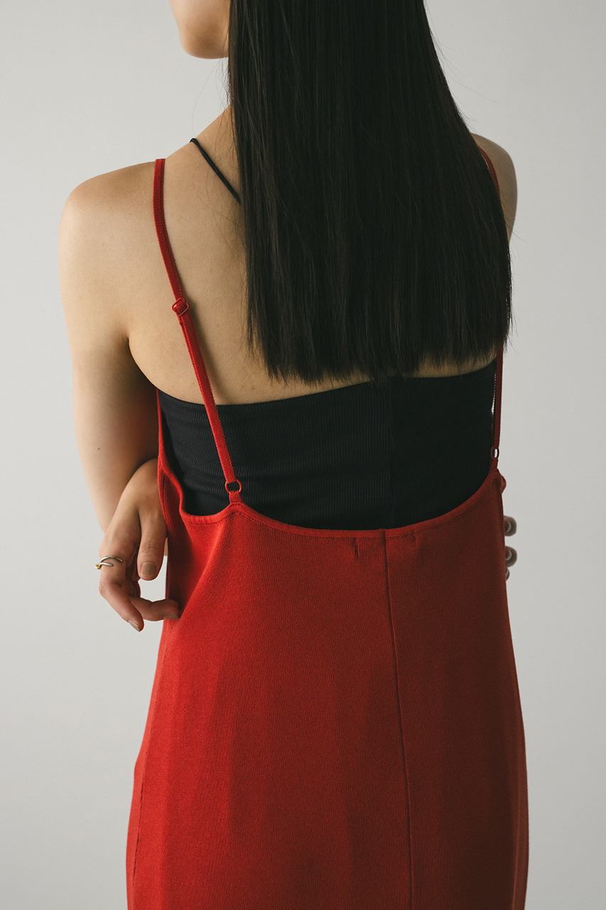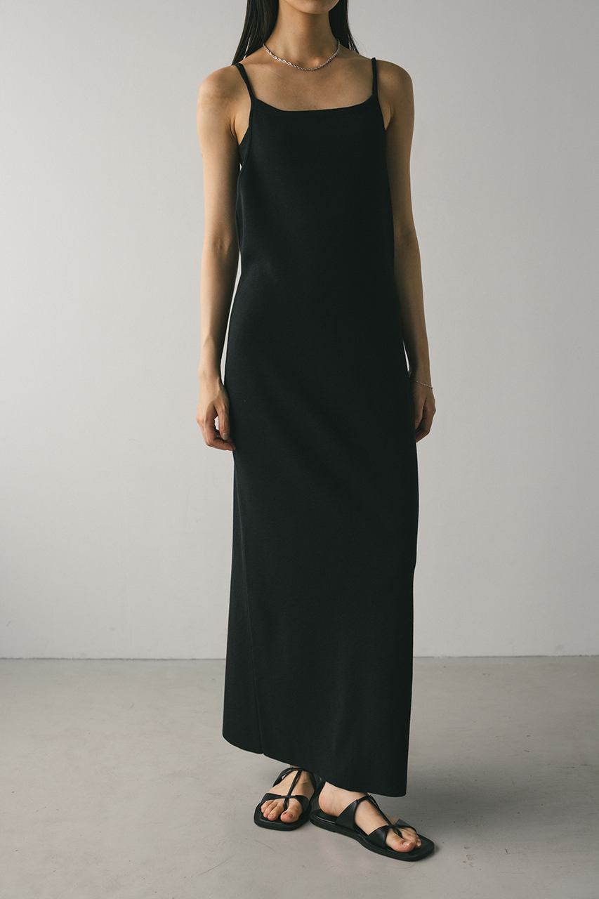 バックが大きくあいたニットワンピース。上品な微光沢がありつつ、通気性も良いビスコース混のコットン糸を使用。ドライタッチな糸で、落ち感が少しあるので上品な印象に見せてくれます。肩紐調節可能。ストレッチあり、透け感なし。