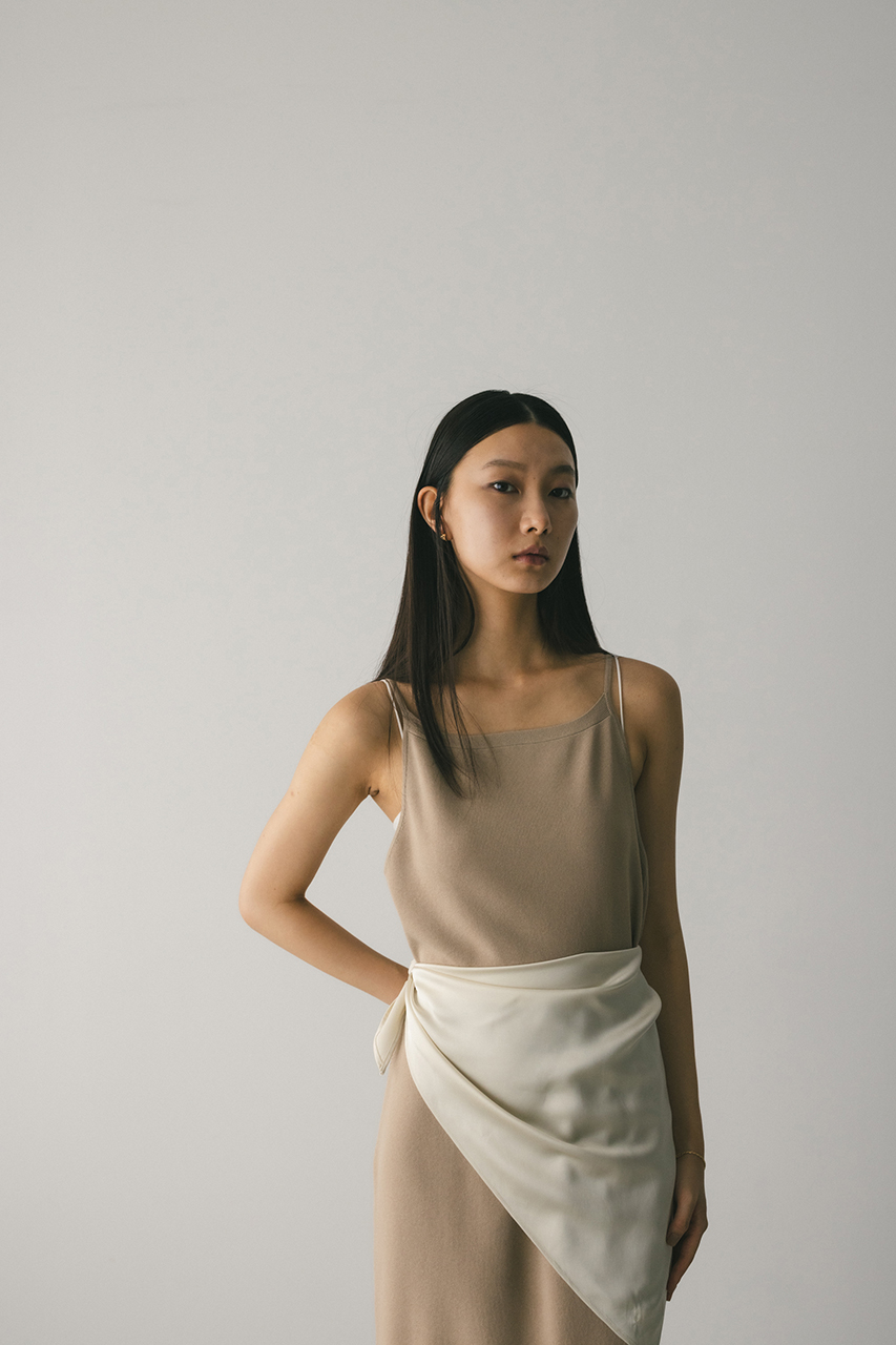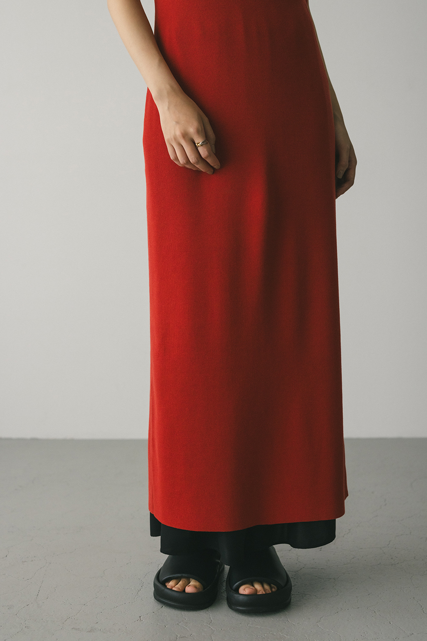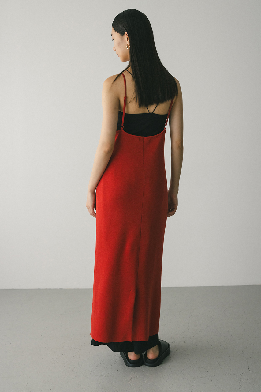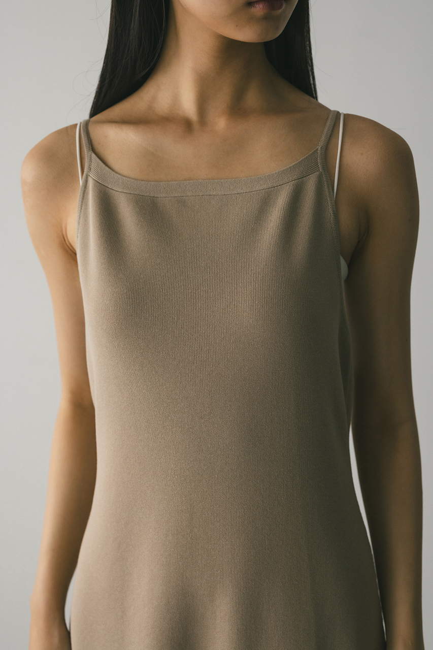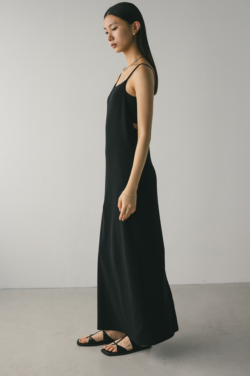 バックが大きくあいたニットワンピース。上品な微光沢がありつつ、通気性も良いビスコース混のコットン糸を使用。ドライタッチな糸で、落ち感が少しあるので上品な印象に見せてくれます。肩紐調節可能。ストレッチあり、透け感なし。
