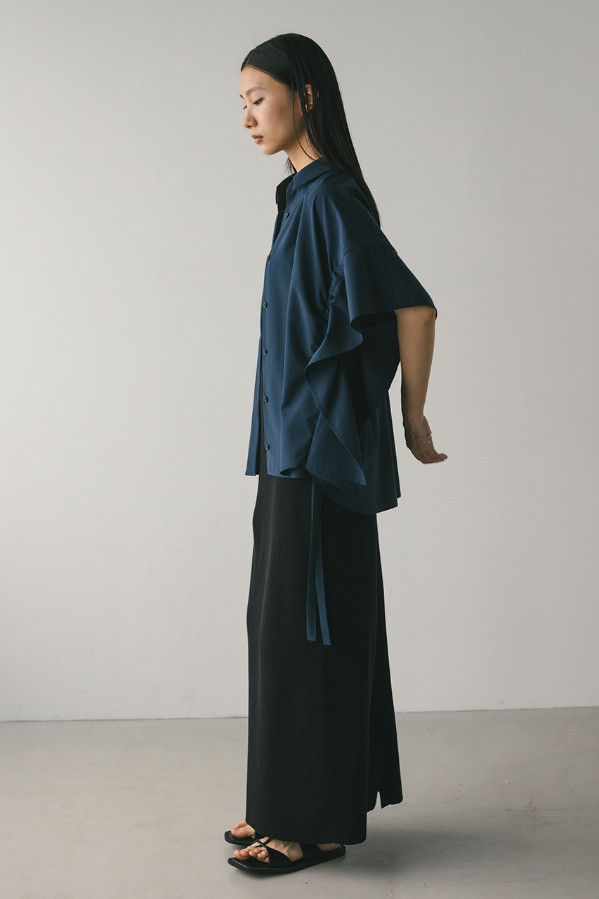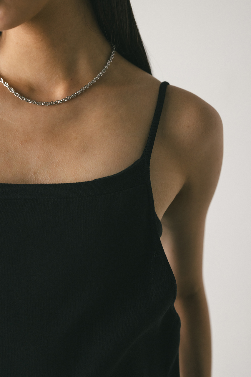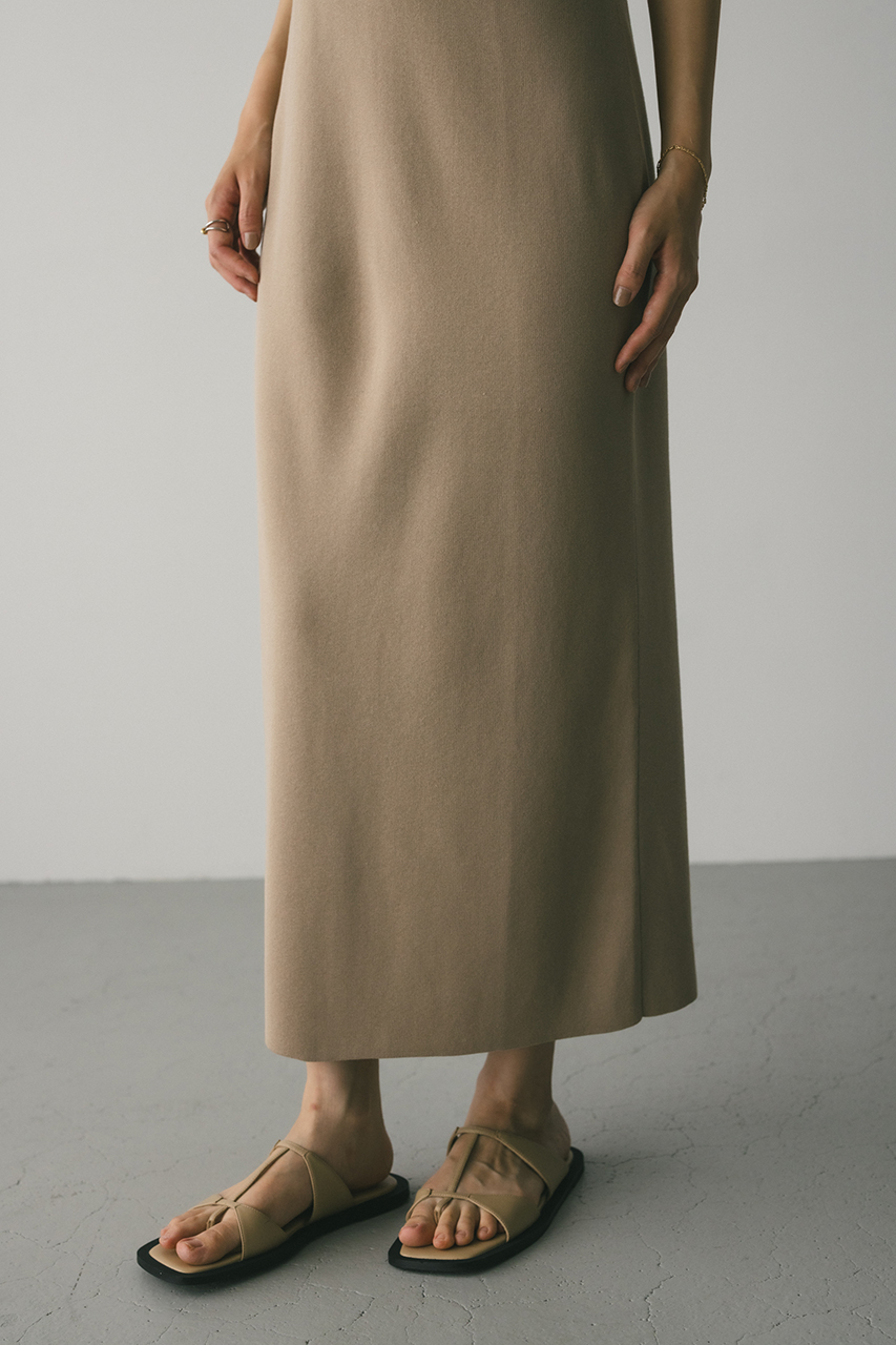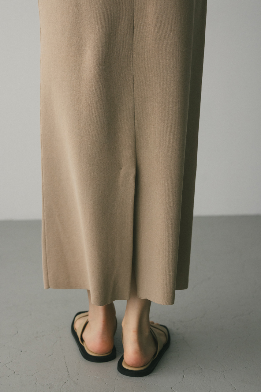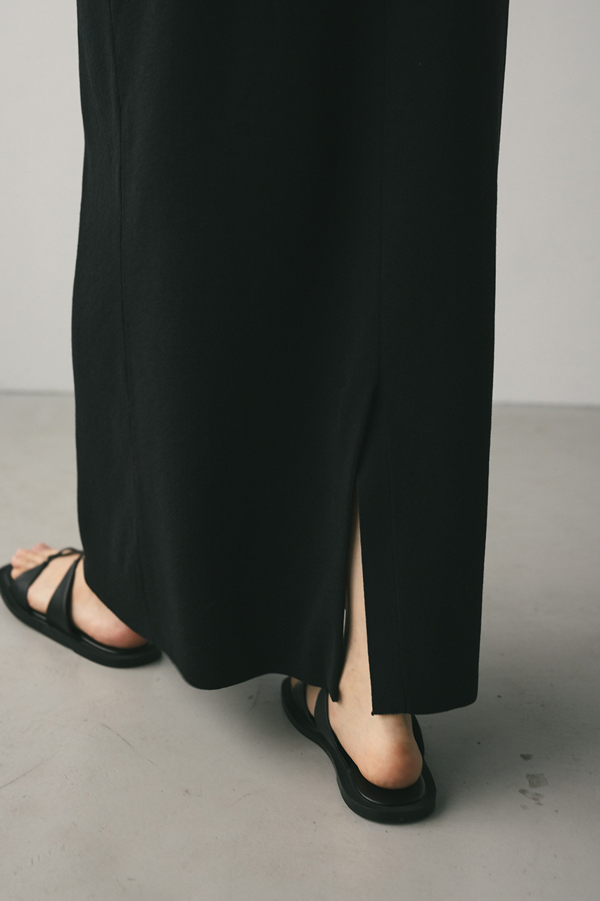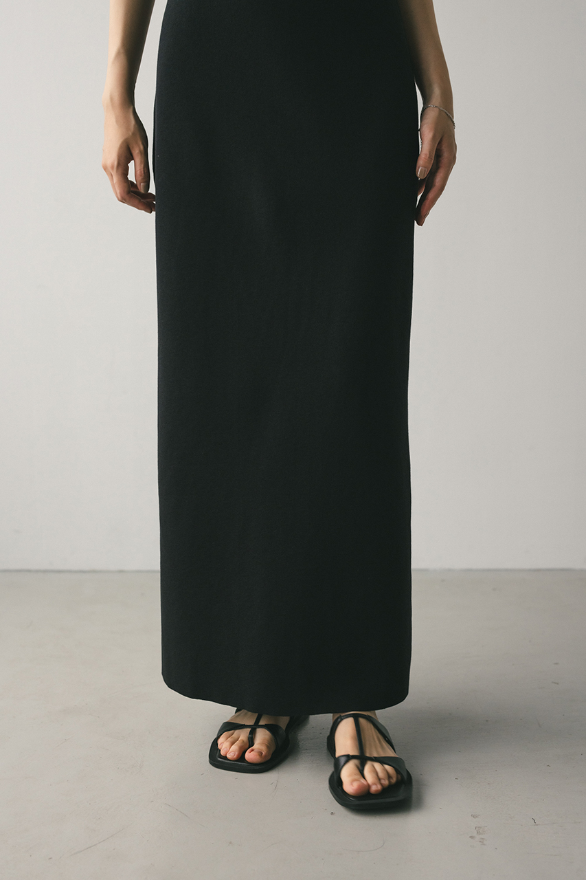 バックが大きくあいたニットワンピース。上品な微光沢がありつつ、通気性も良いビスコース混のコットン糸を使用。ドライタッチな糸で、落ち感が少しあるので上品な印象に見せてくれます。肩紐調節可能。ストレッチあり、透け感なし。