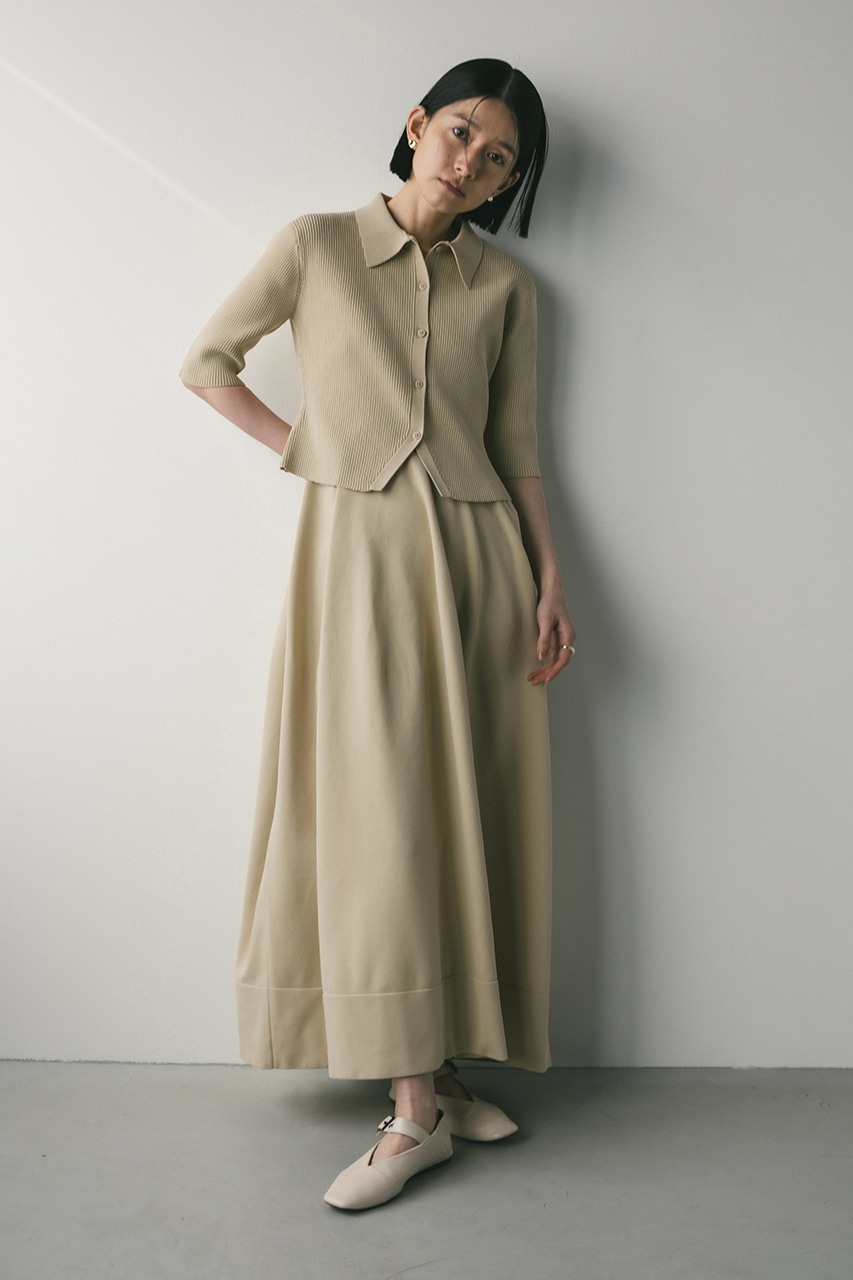 ポロニットとワンピースのセットアイテム。ワンピースはフォルム感のあるスカートシルエットにこだわり、上品でスタイルアップが叶う一枚。しっかりとしたリブ編みで仕上げているのでボディーラインがひびきにくいのもうれしいポイントです。ワンピースはポロニットの上からも着用頂けるので、様々なスタイリングを楽しんでいただけます。ストレッチあり、透け感なし。