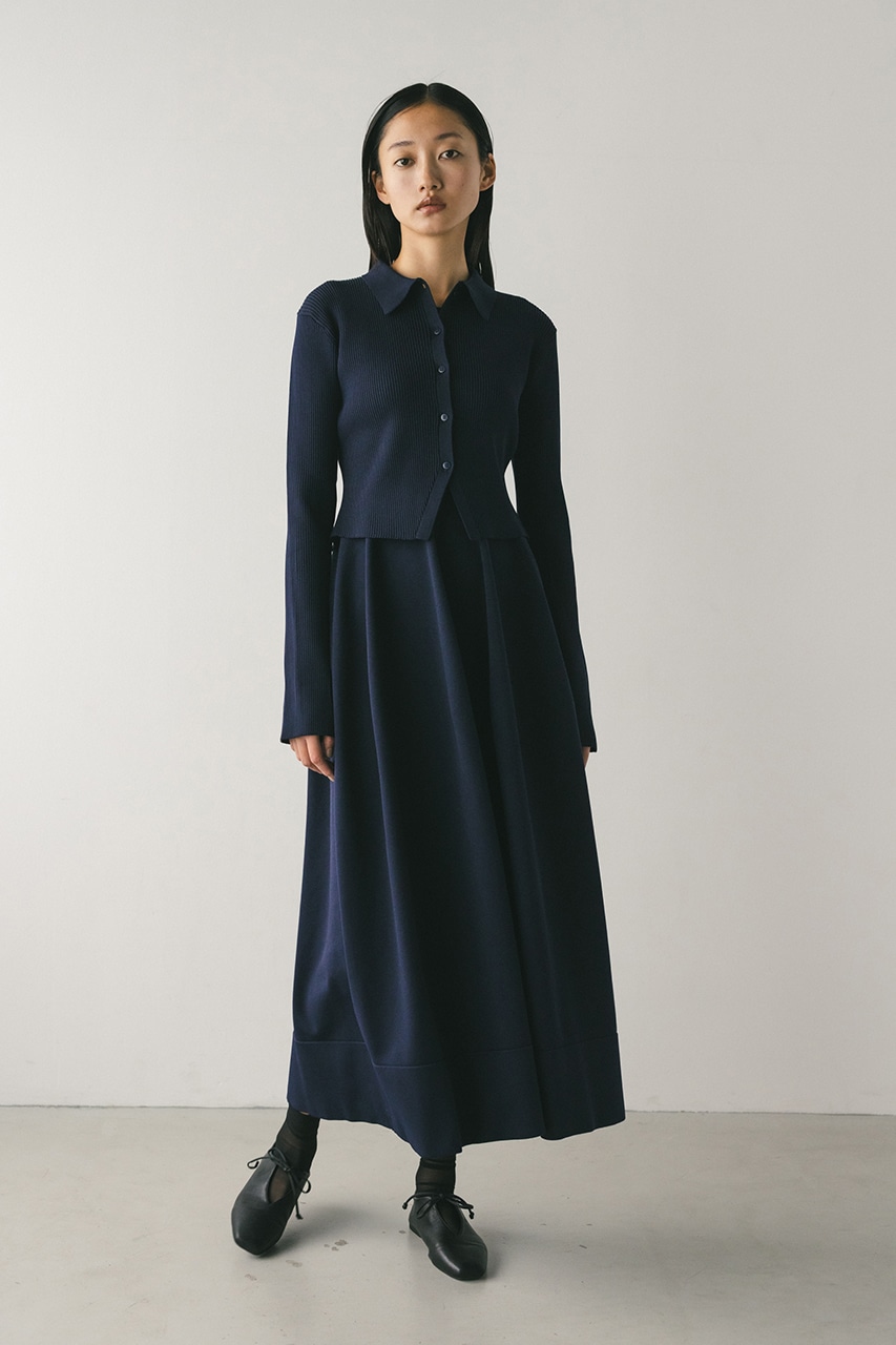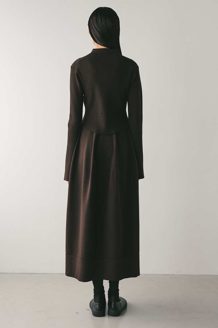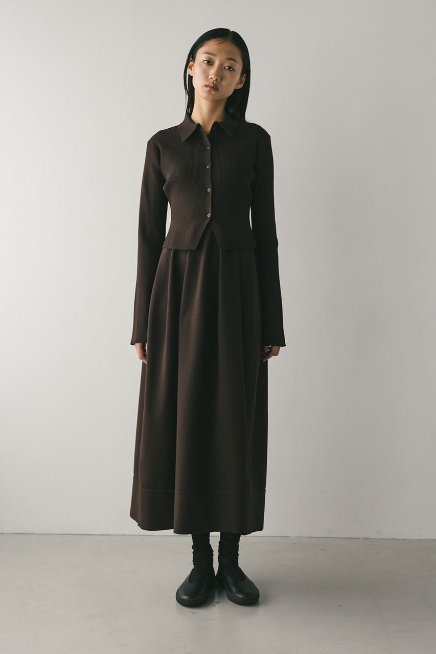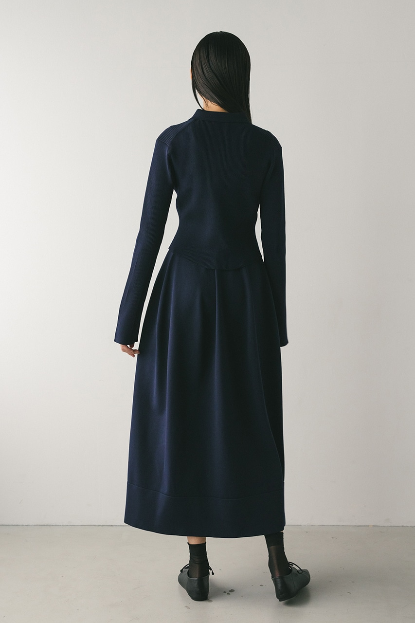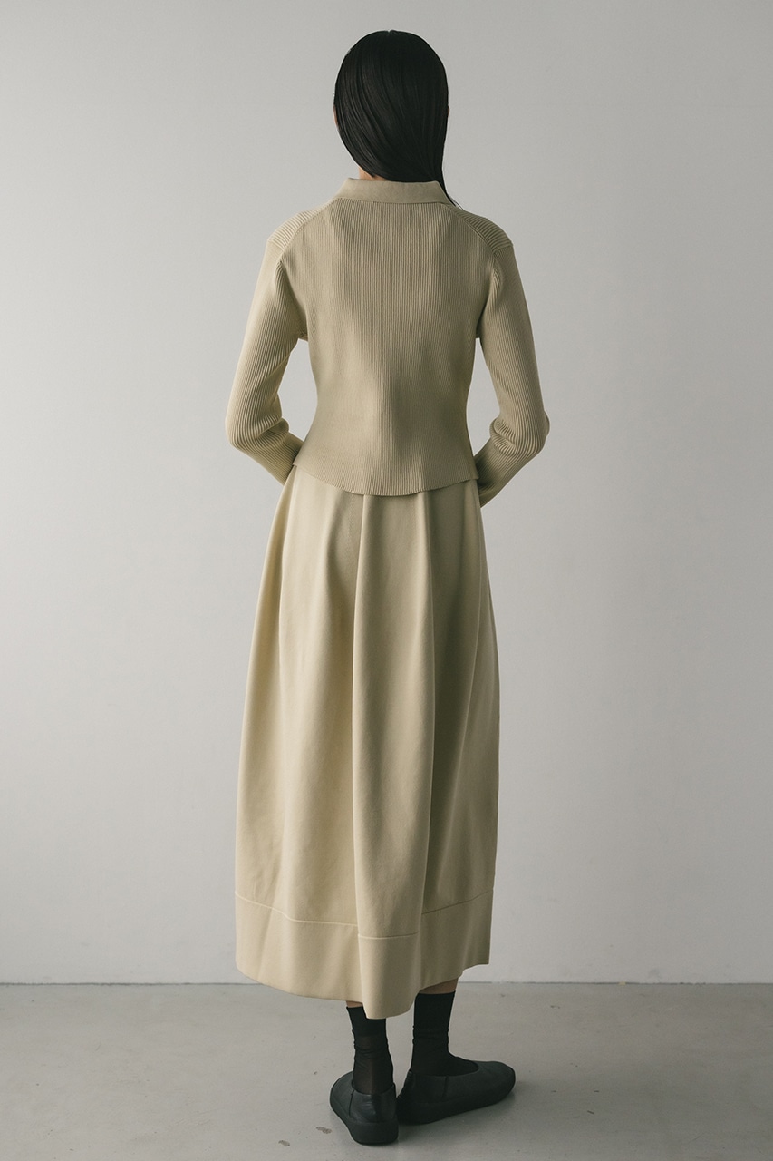 ポロニットとワンピースのセットアイテム。しっかりとリブ編みで仕上げたトップスは、袖口に向かってやや広がるスリーブがデザインポイント。