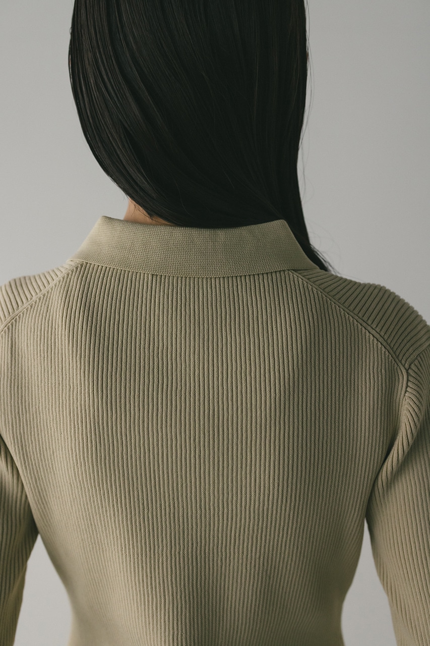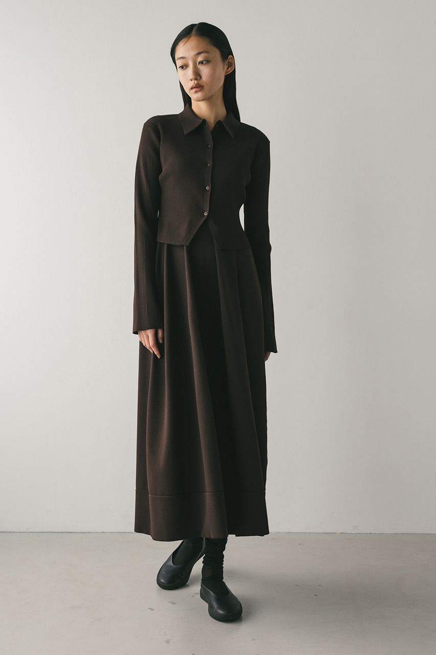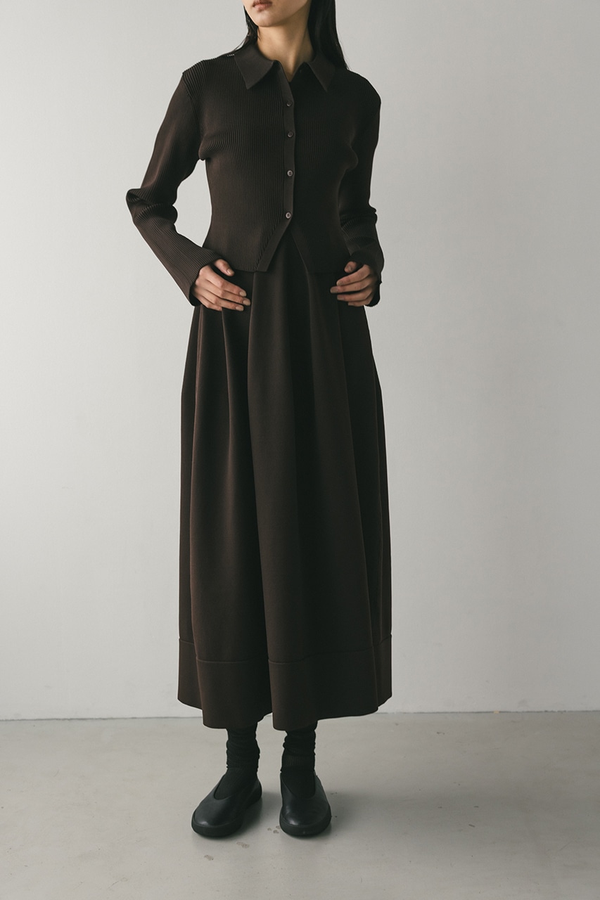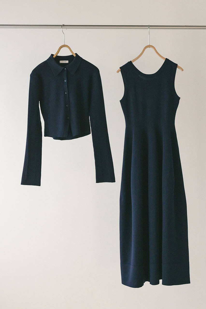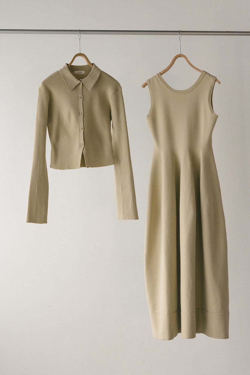 ポロニットとワンピースのセットアイテム。しっかりとリブ編みで仕上げたトップスは、袖口に向かってやや広がるスリーブがデザインポイント。