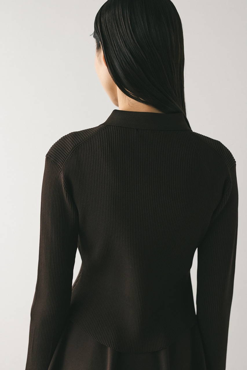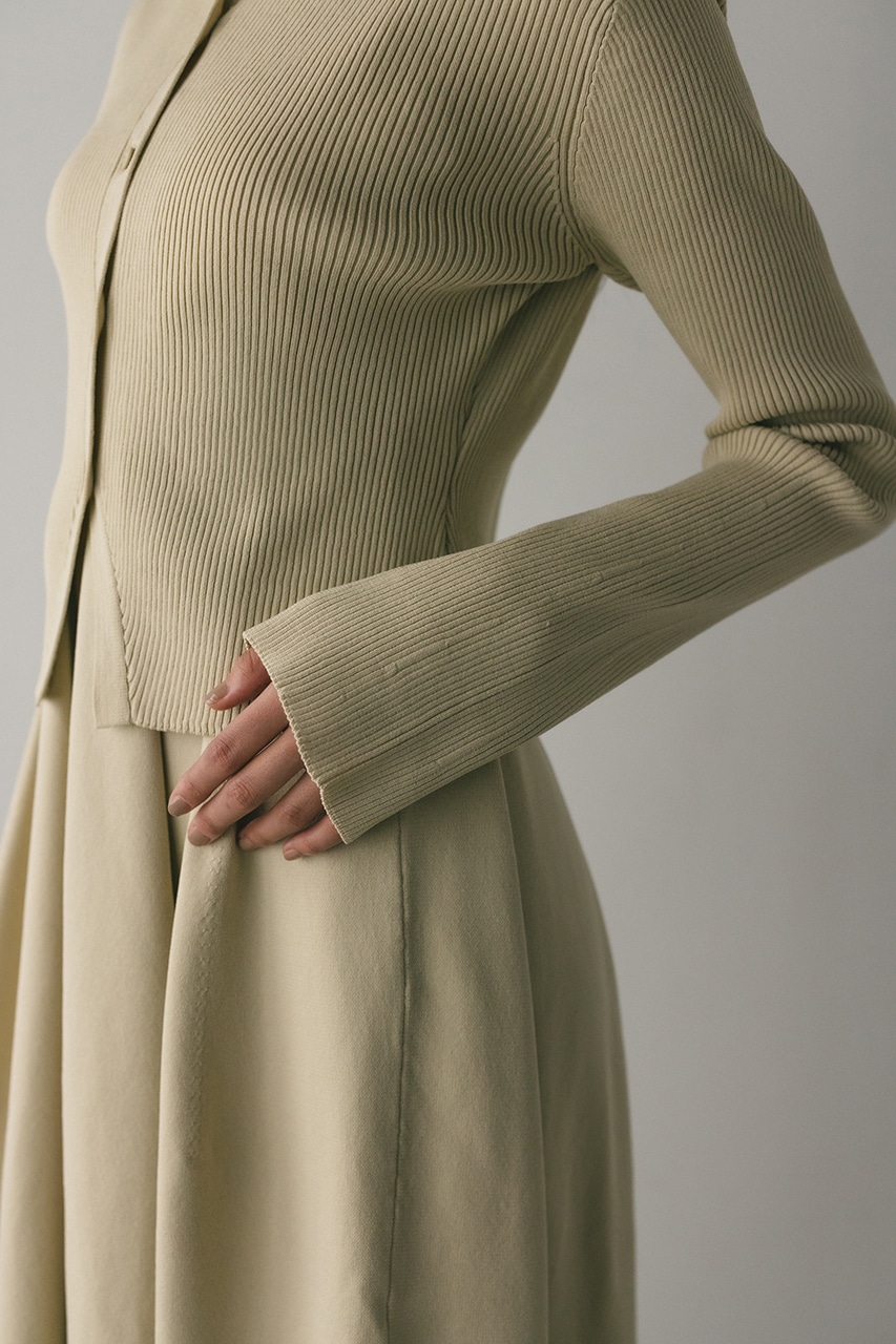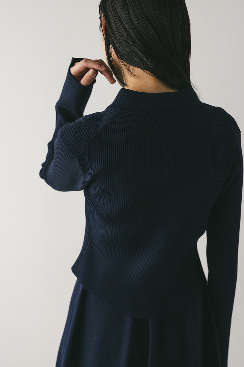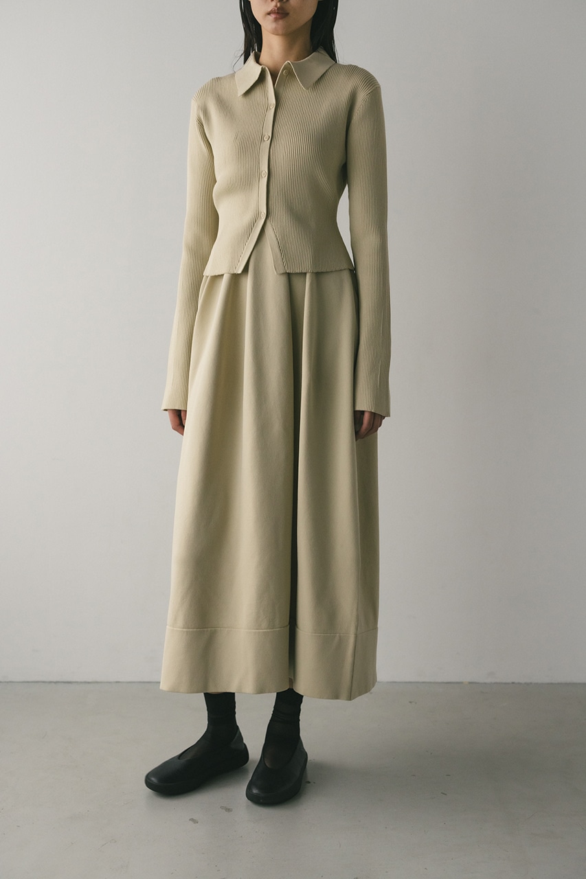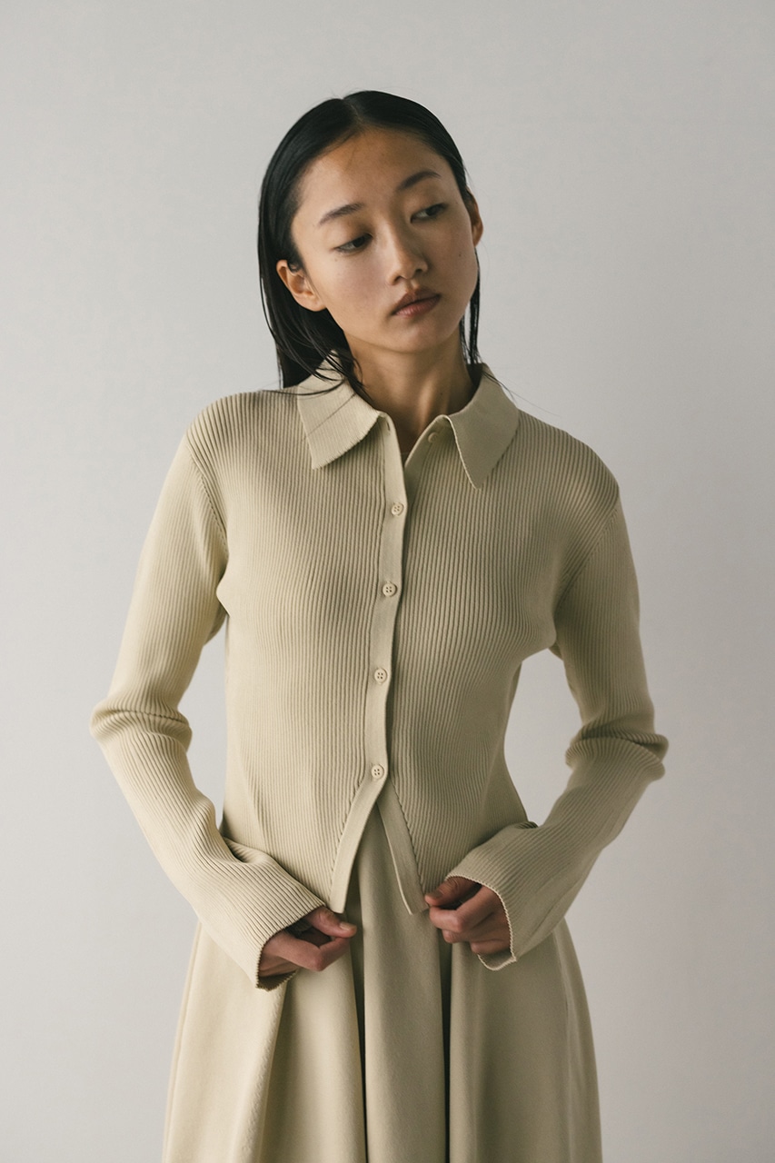 ポロニットとワンピースのセットアイテム。しっかりとリブ編みで仕上げたトップスは、袖口に向かってやや広がるスリーブがデザインポイント。