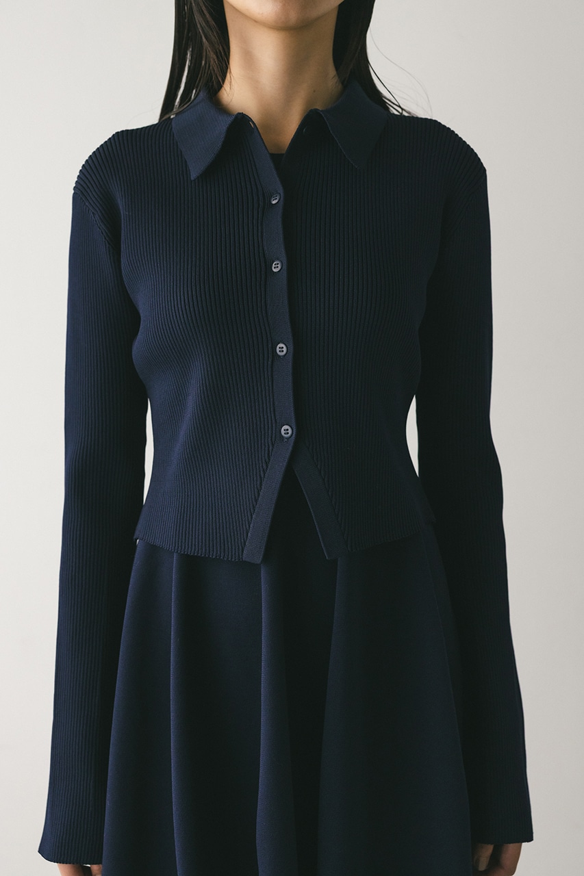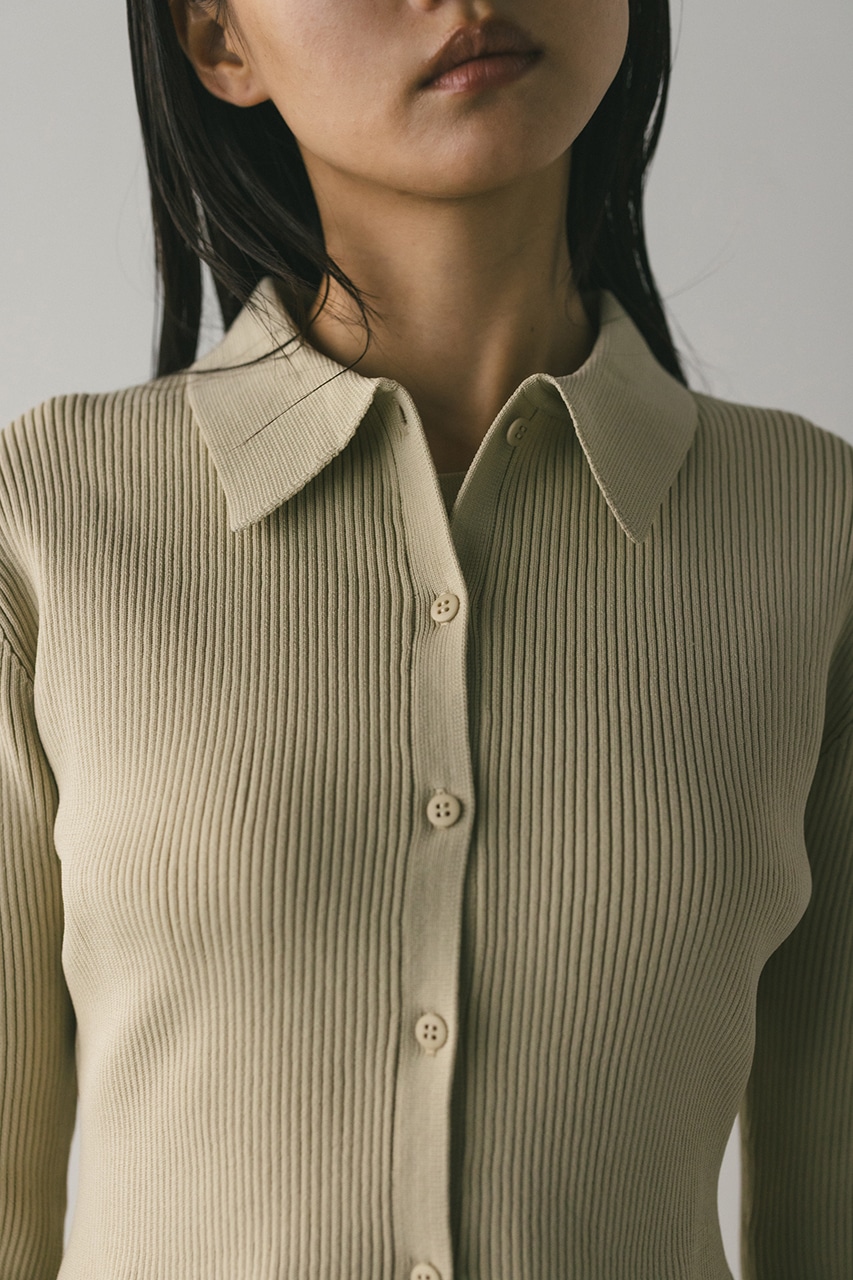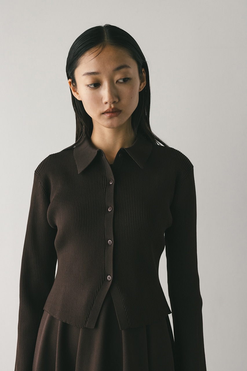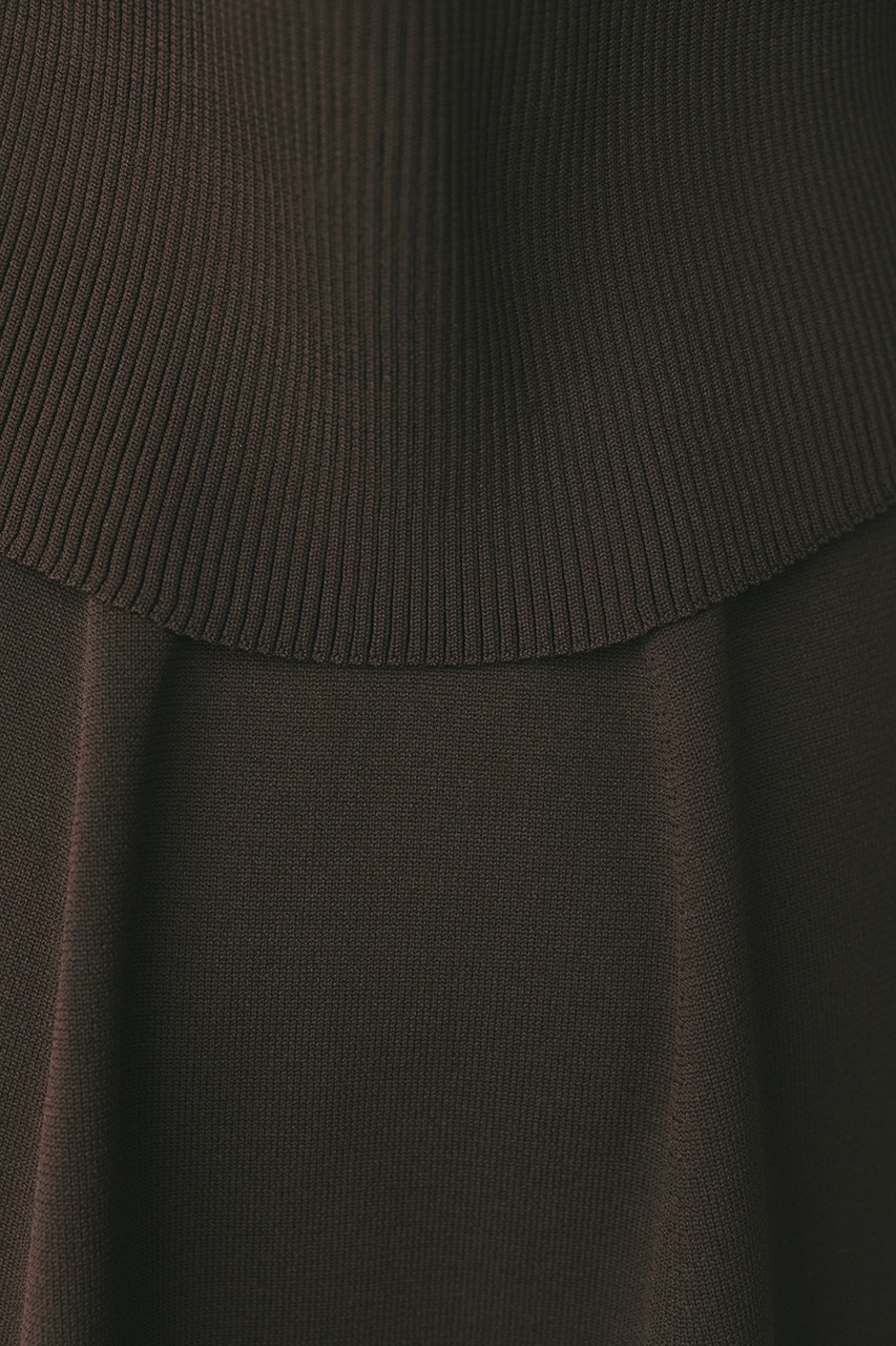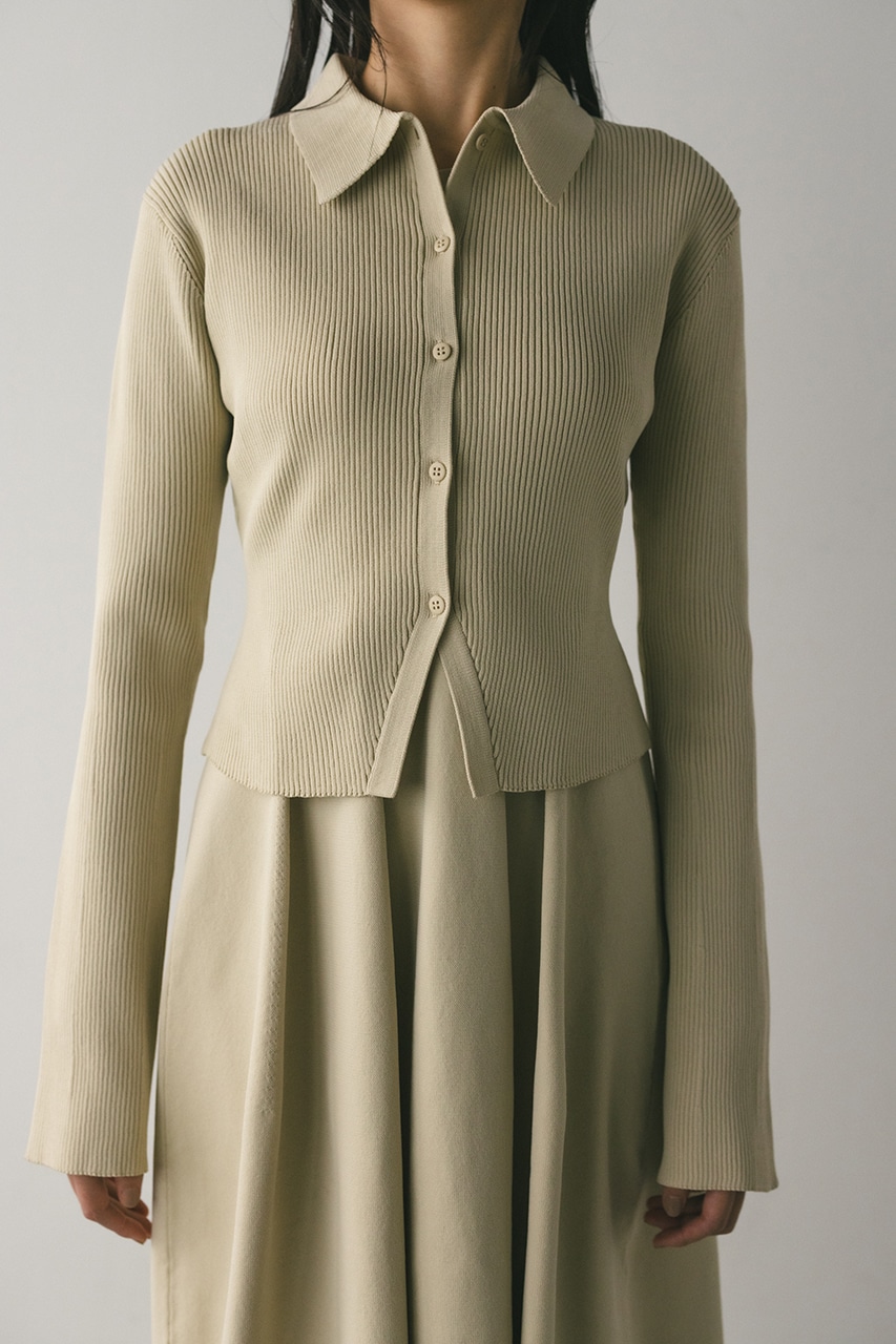 ポロニットとワンピースのセットアイテム。しっかりとリブ編みで仕上げたトップスは、袖口に向かってやや広がるスリーブがデザインポイント。