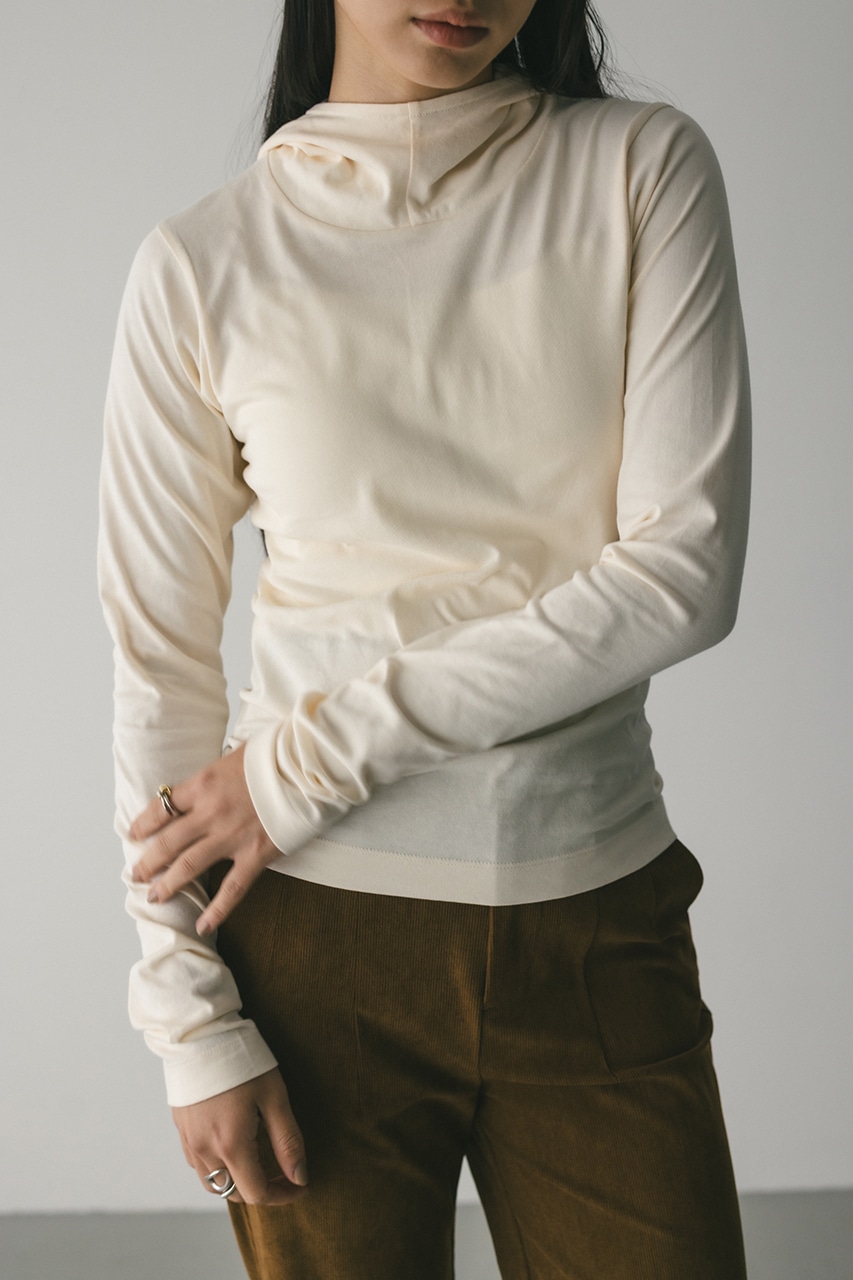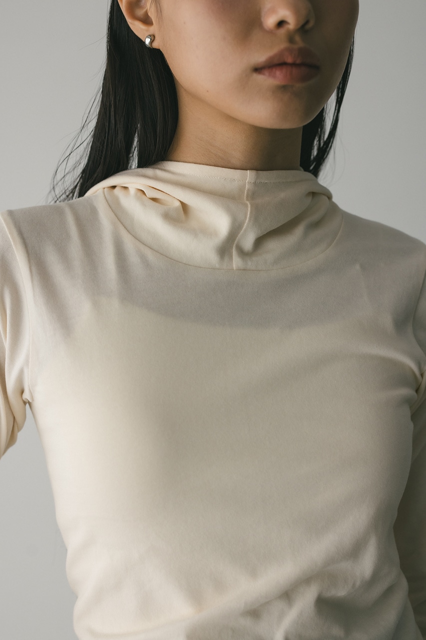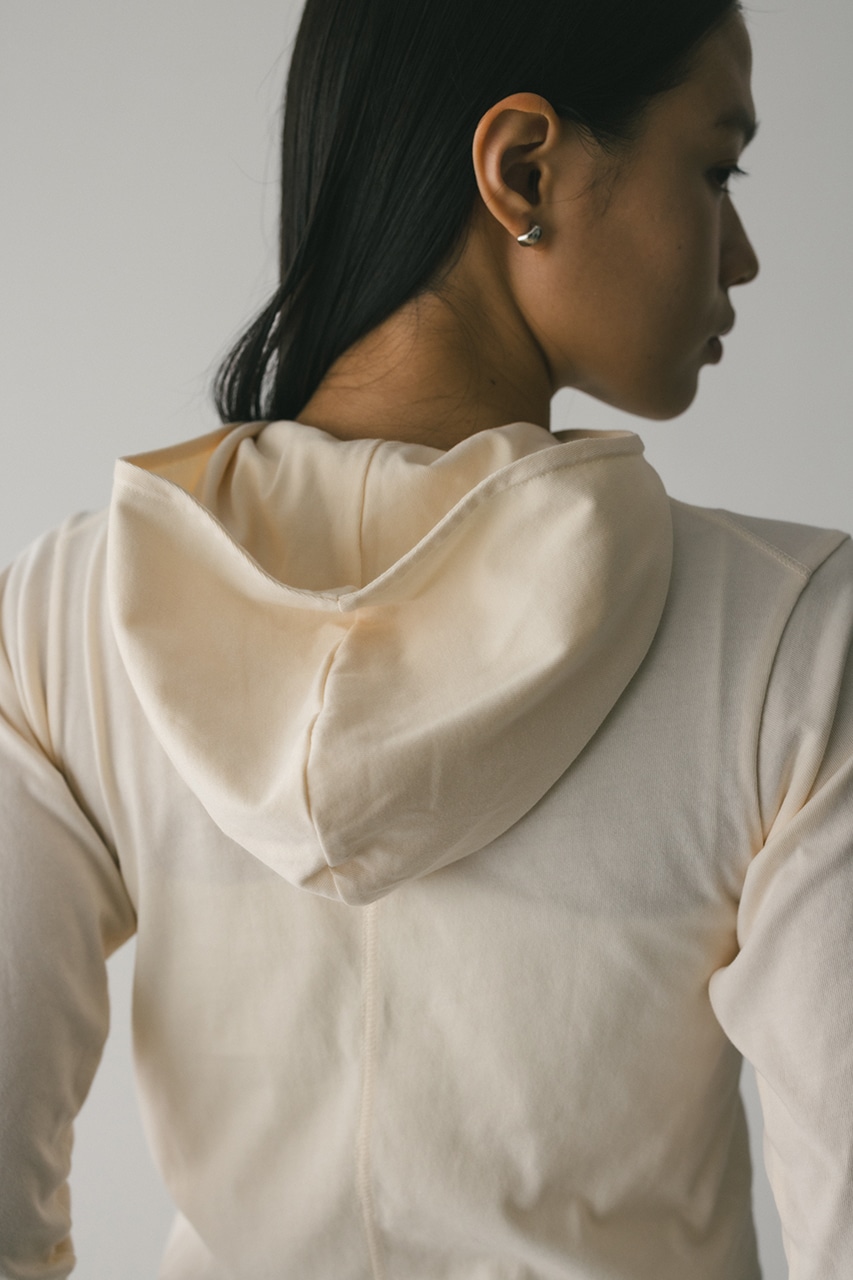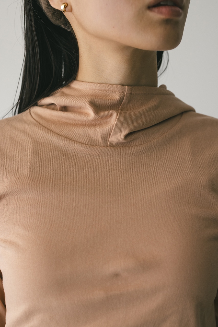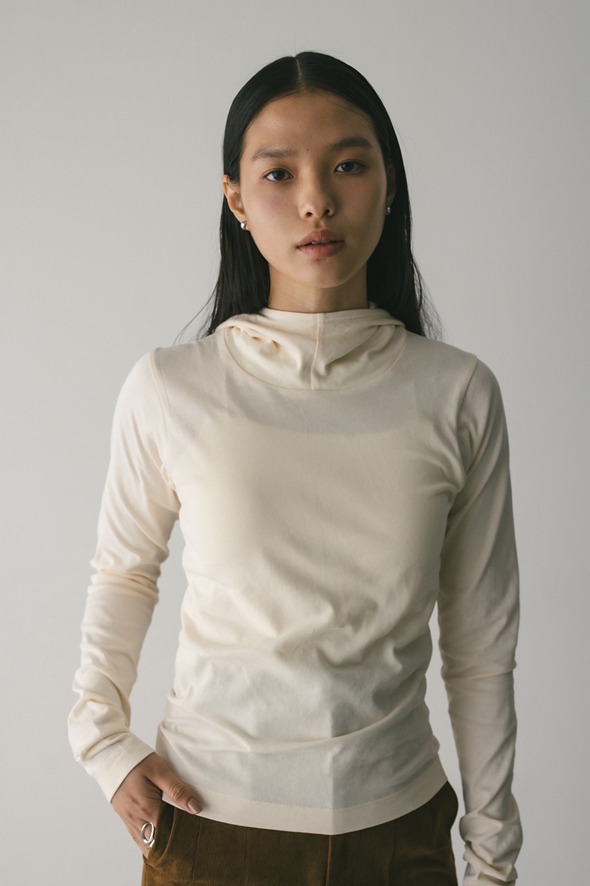 コンパクトなサイズ感のフーディーカットソー。コットン100%の生地ですが、微光沢で毛羽が少ない清涼感のある風合いがポイント。1枚ではもちろん、ジャケットやニットなどのインナーとしていつものコーデにプラスするだけでこなれ感の出るアイテムです。ストレッチなし、透け感ややあり(WHT)。こちらはWEBとThe SHEL’TTER TOKYO店、新宿ルミネエスト店、ららぽーとTOKYOBAY店限定の取り扱いです。