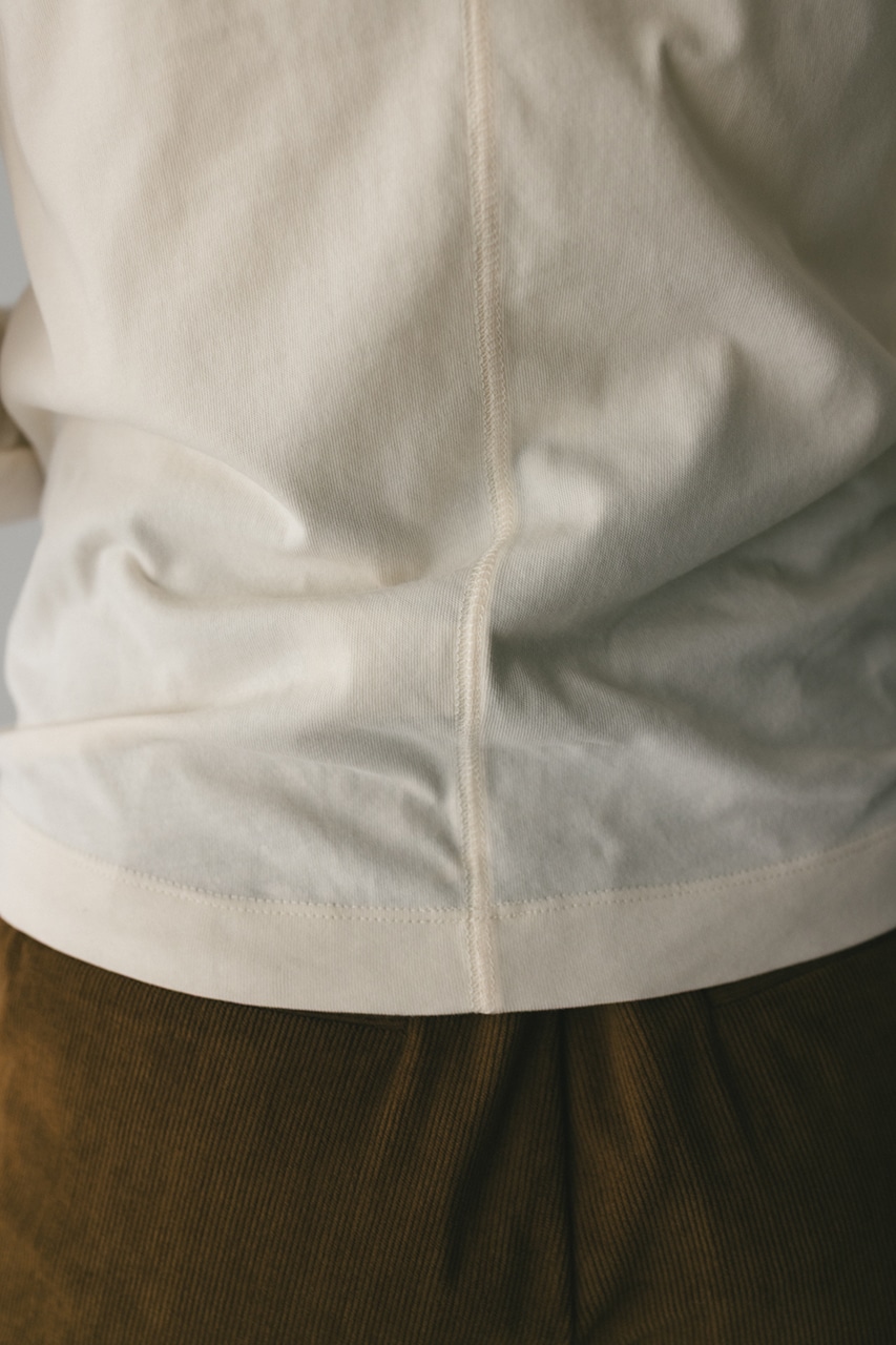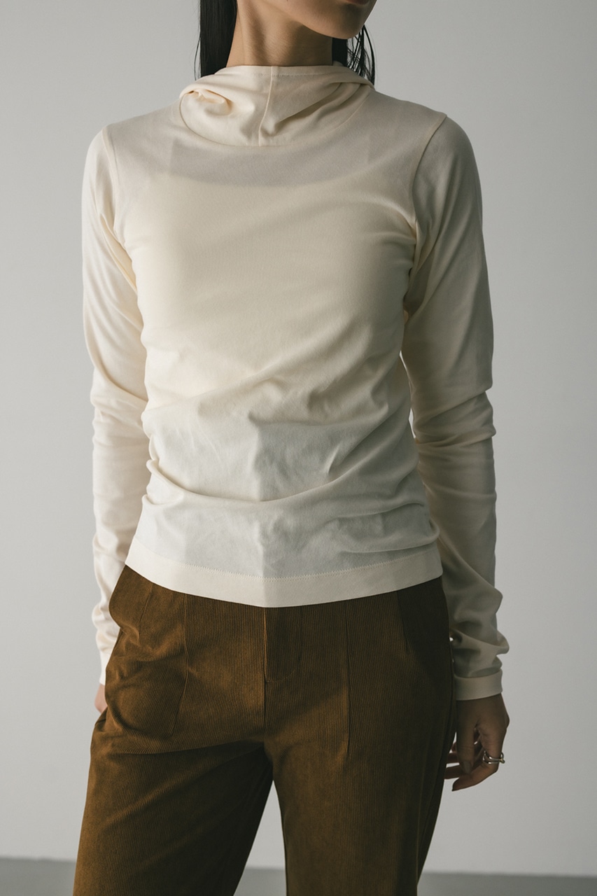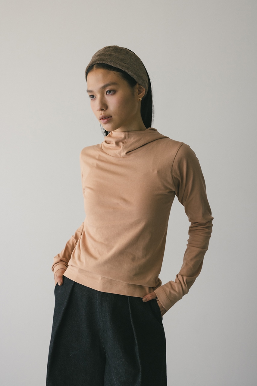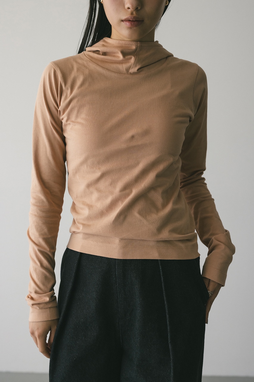 コンパクトなサイズ感のフーディーカットソー。コットン100%の生地ですが、微光沢で毛羽が少ない清涼感のある風合いがポイント。1枚ではもちろん、ジャケットやニットなどのインナーとしていつものコーデにプラスするだけでこなれ感の出るアイテムです。ストレッチなし、透け感ややあり(WHT)。こちらはWEBとThe SHEL’TTER TOKYO店、新宿ルミネエスト店、ららぽーとTOKYOBAY店限定の取り扱いです。