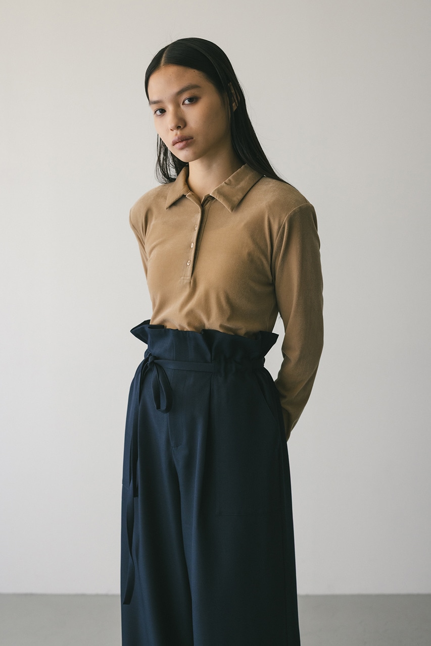 大人の抜け感を演出してくれるシアー感のあるメッシュベロア生地を使用したポロトップ。肩パットを施したパワーショルダーシルエットがポイント。あえての細身シルエットで上品な印象に導きます。ストレッチあり、透け感ややあり。