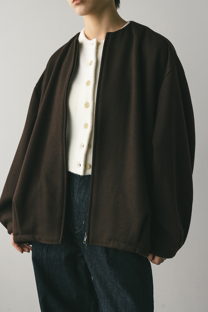 モードで上品な印象のクルーネックと、裾と袖口に入ったタックデザインが作るフォルムがスタミキらしいノーカラーブルゾン。後ろ見頃にも切り替えを入れているのでバックスタイルもかわいい一枚。裾はスピンドルが入っているのでブラウジングしても着用いただけます。しっかりとした厚みと柔らかな落ち感のあるボンディング生地を使用。表面は表面感のある綾織組織で暖かみある起毛布帛生地、裏面はソフトな肌さわりで温もりある天竺生地を使用。毛玉としわになりにくい素材でソフトなハリがあるのでシルエットが綺麗に出るのもポイントです。複数生地を貼り合わせているので裏地なしでも丈夫で扱いやすく、ごわつくことなく着用いただけます。ストレッチなし、透け感なし。