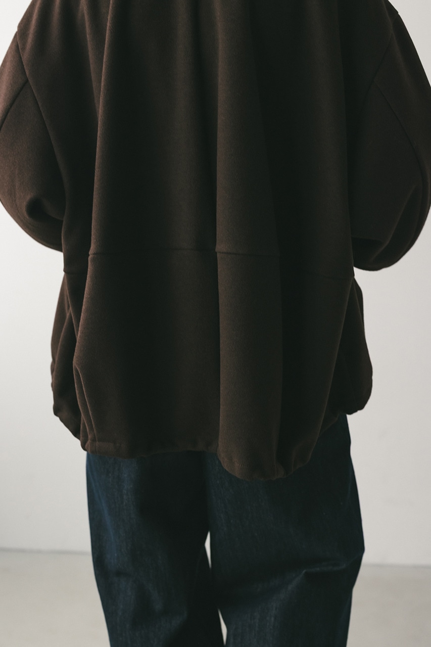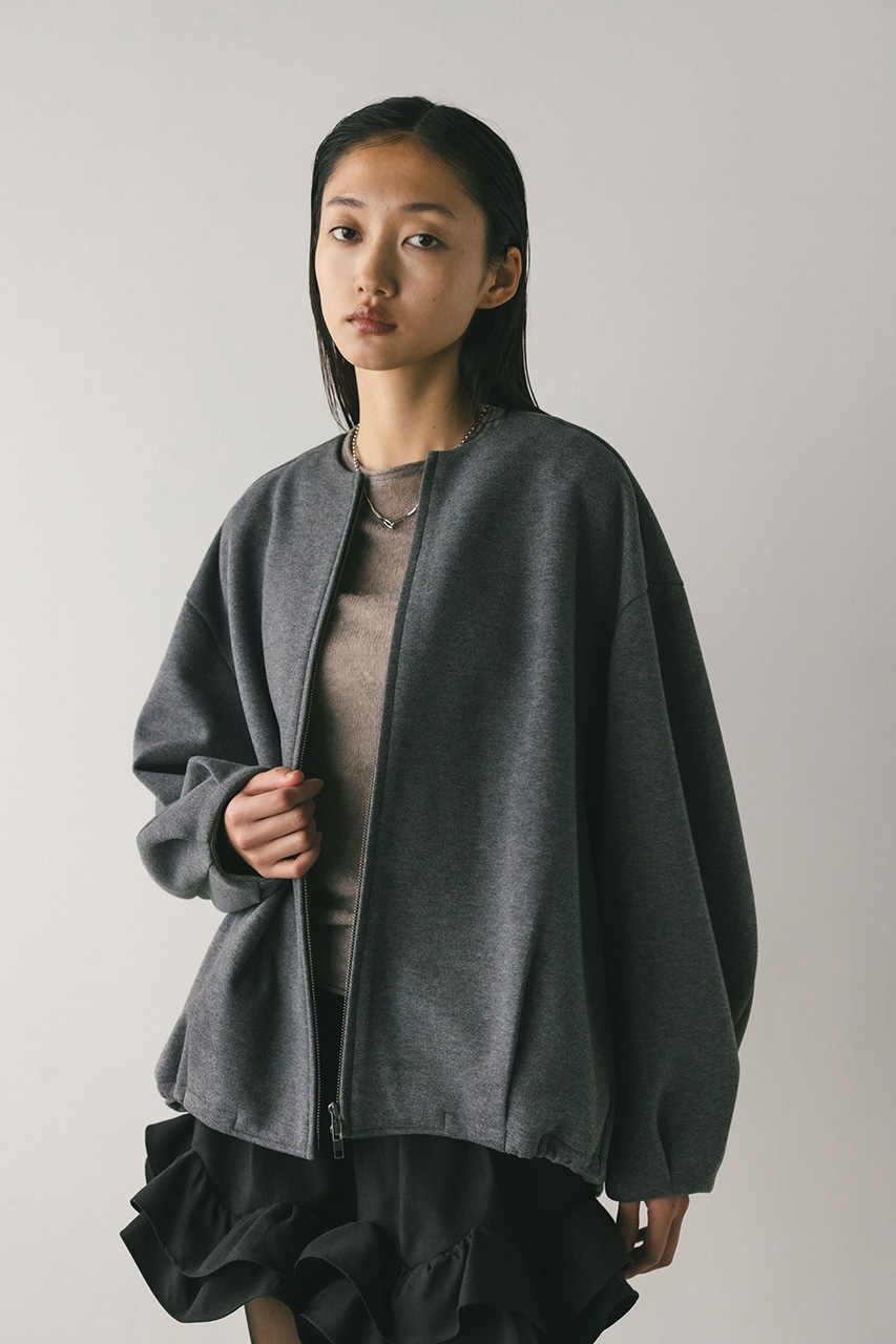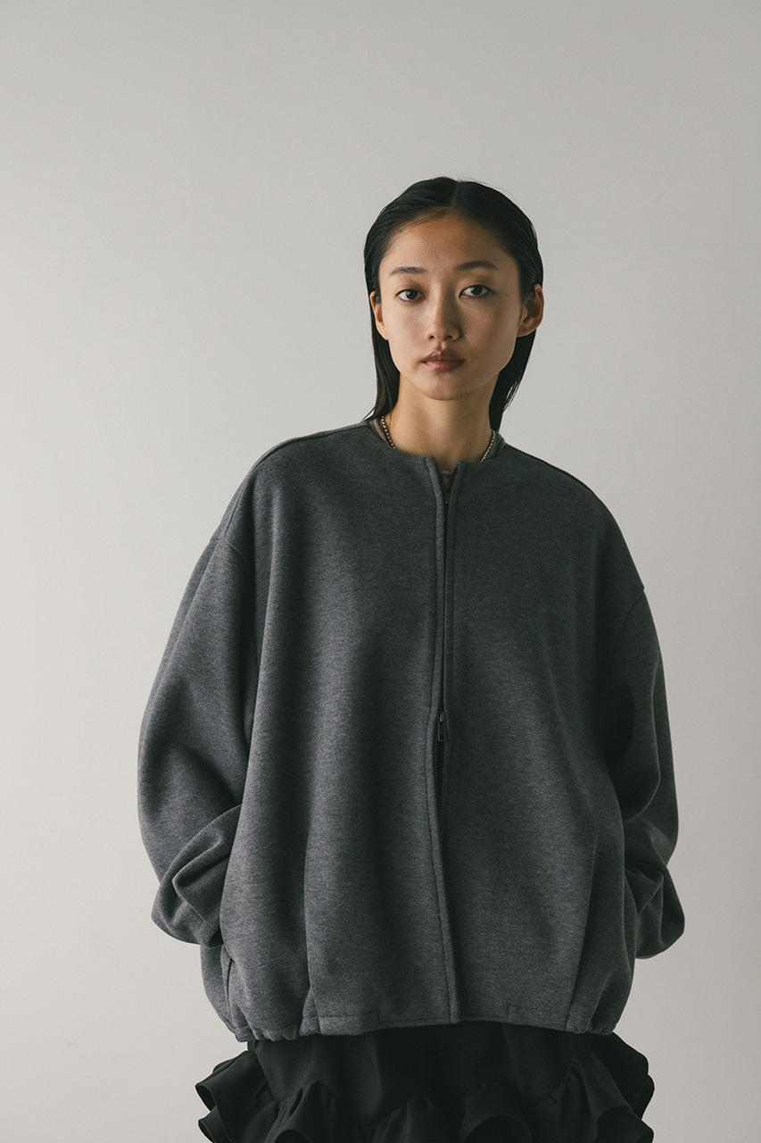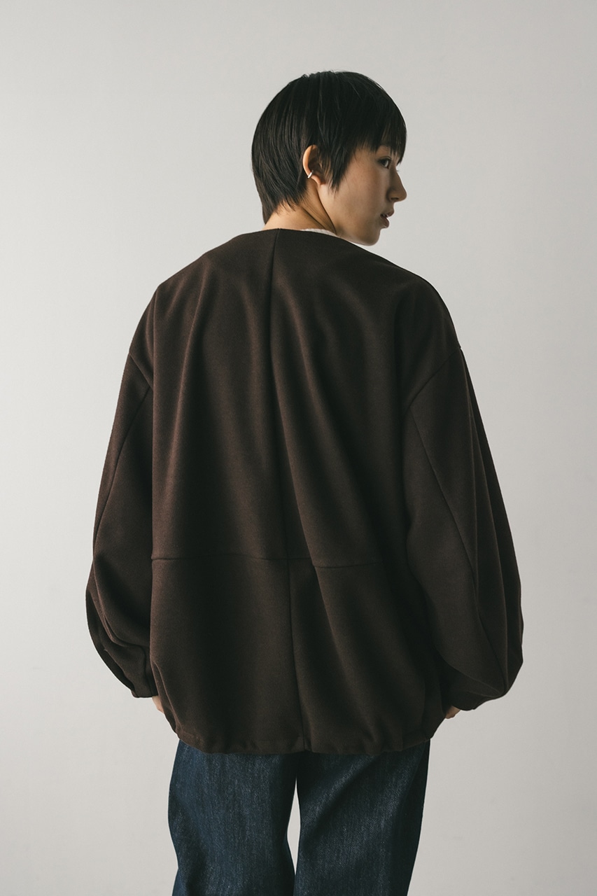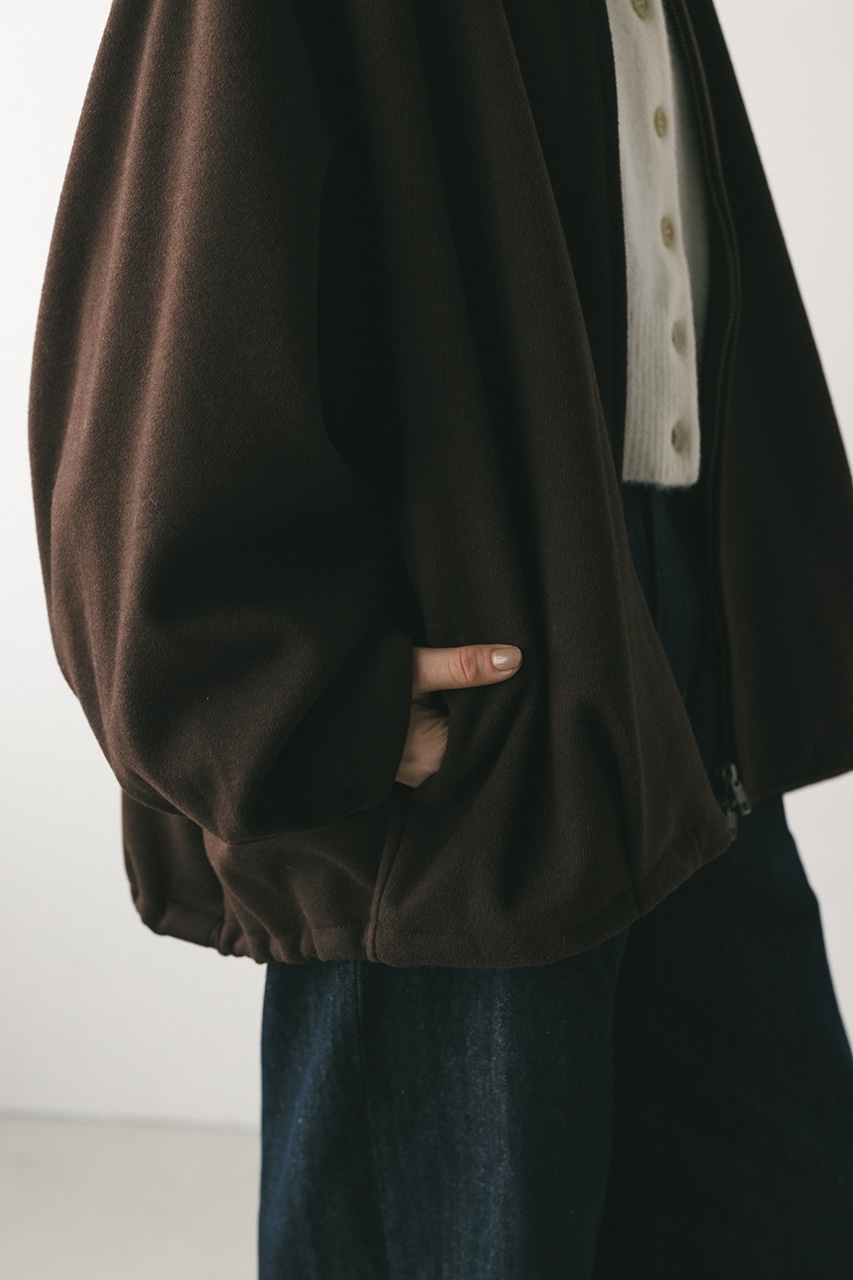 モードで上品な印象のクルーネックと、裾と袖口に入ったタックデザインが作るフォルムがスタミキらしいノーカラーブルゾン。後ろ見頃にも切り替えを入れているのでバックスタイルもかわいい一枚。裾はスピンドルが入っているのでブラウジングしても着用いただけます。しっかりとした厚みと柔らかな落ち感のあるボンディング生地を使用。表面は表面感のある綾織組織で暖かみある起毛布帛生地、裏面はソフトな肌さわりで温もりある天竺生地を使用。毛玉としわになりにくい素材でソフトなハリがあるのでシルエットが綺麗に出るのもポイントです。複数生地を貼り合わせているので裏地なしでも丈夫で扱いやすく、ごわつくことなく着用いただけます。ストレッチなし、透け感なし。
