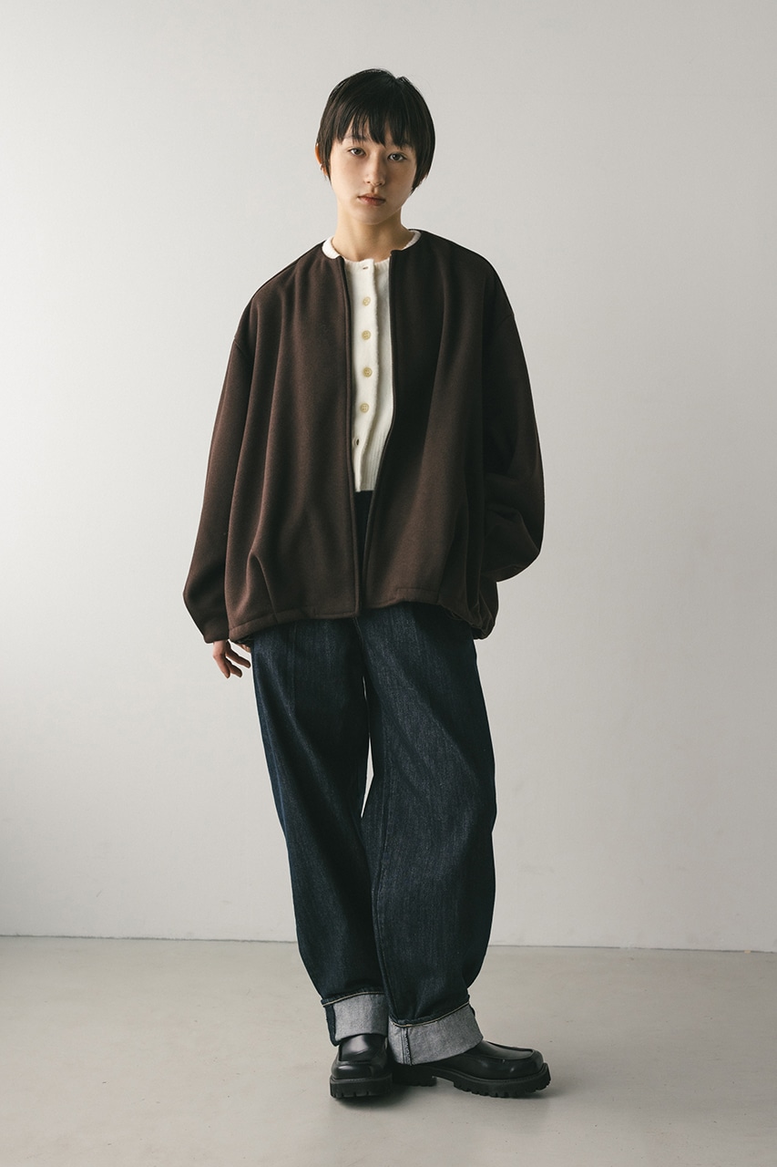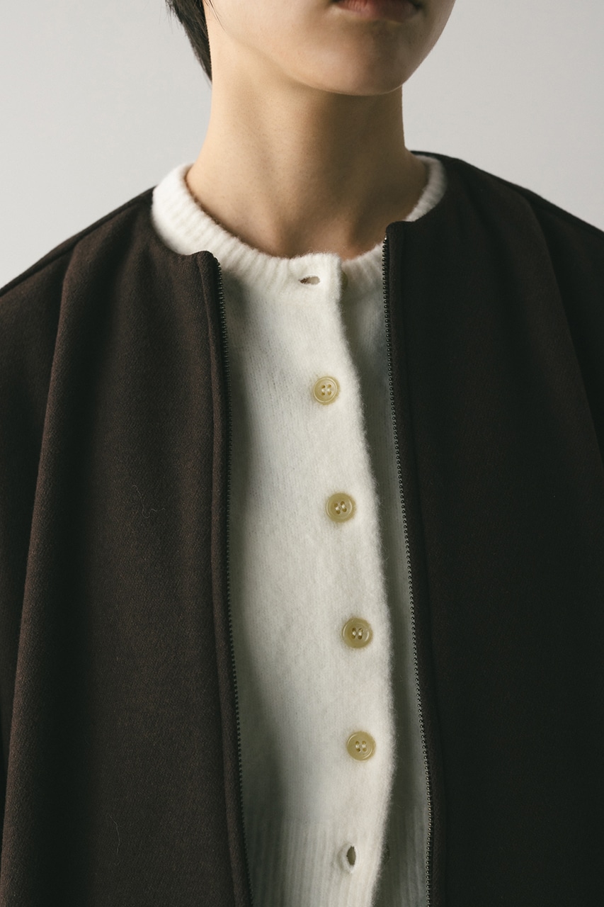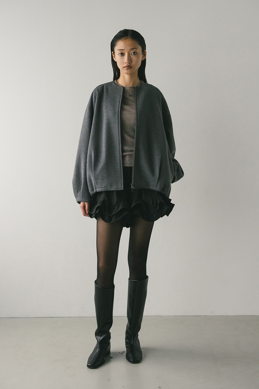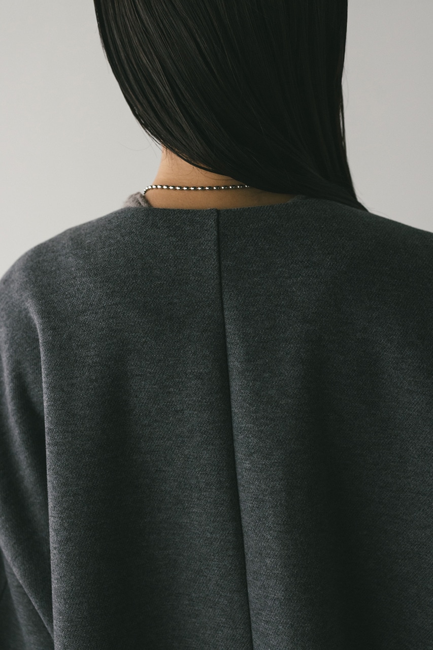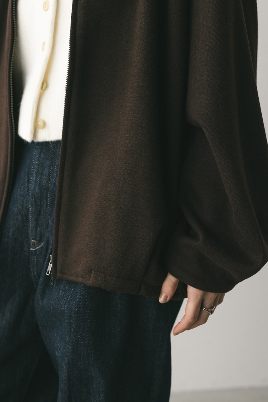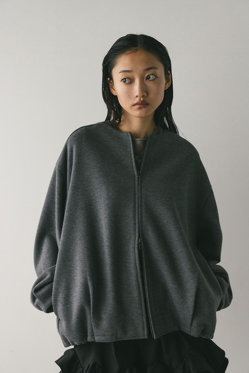モードで上品な印象のクルーネックと、裾と袖口に入ったタックデザインが作るフォルムがスタミキらしいノーカラーブルゾン。後ろ見頃にも切り替えを入れているのでバックスタイルもかわいい一枚。裾はスピンドルが入っているのでブラウジングしても着用いただけます。しっかりとした厚みと柔らかな落ち感のあるボンディング生地を使用。表面は表面感のある綾織組織で暖かみある起毛布帛生地、裏面はソフトな肌さわりで温もりある天竺生地を使用。毛玉としわになりにくい素材でソフトなハリがあるのでシルエットが綺麗に出るのもポイントです。複数生地を貼り合わせているので裏地なしでも丈夫で扱いやすく、ごわつくことなく着用いただけます。ストレッチなし、透け感なし。