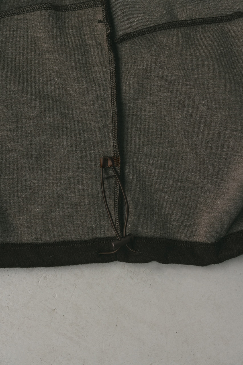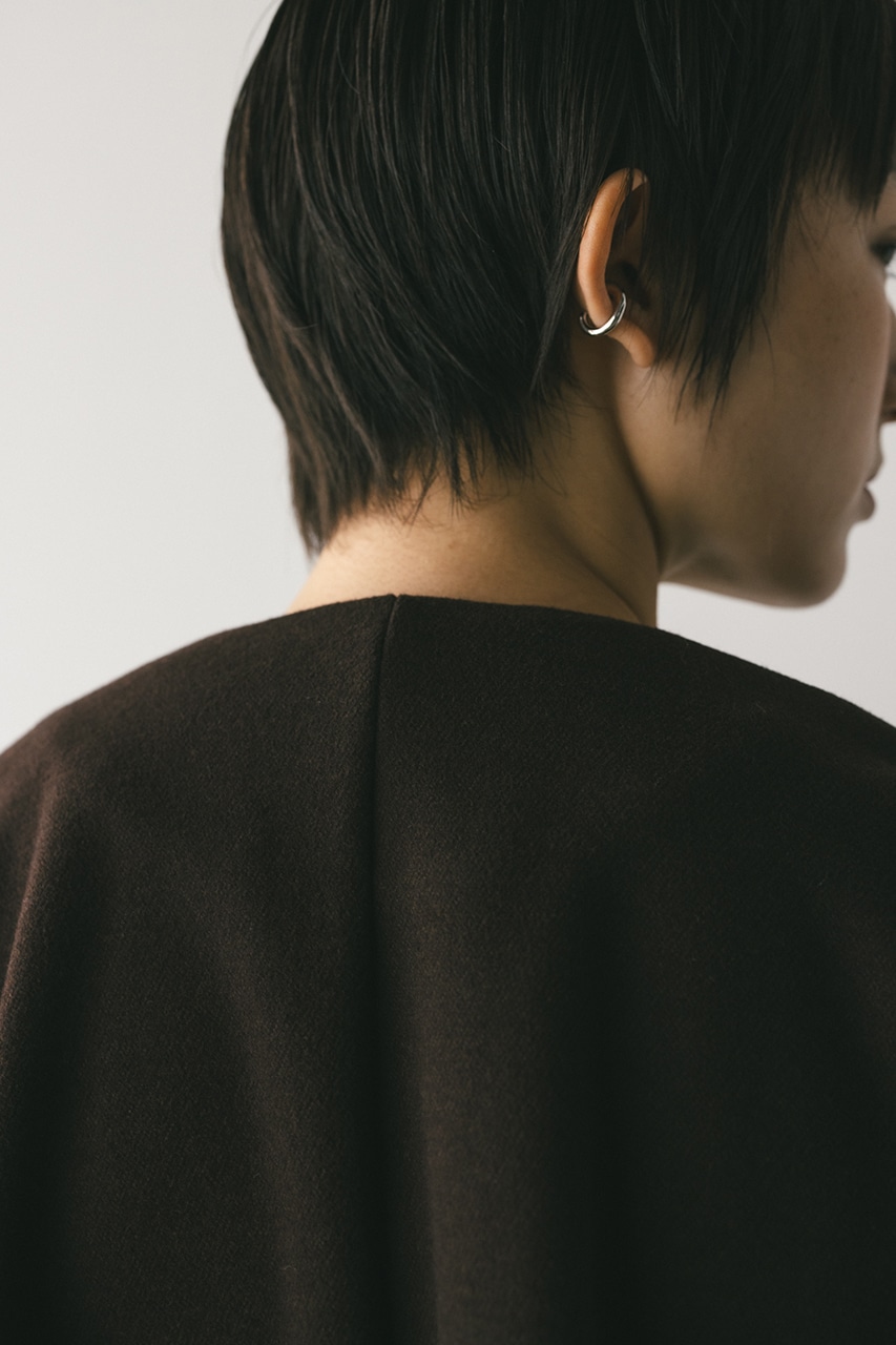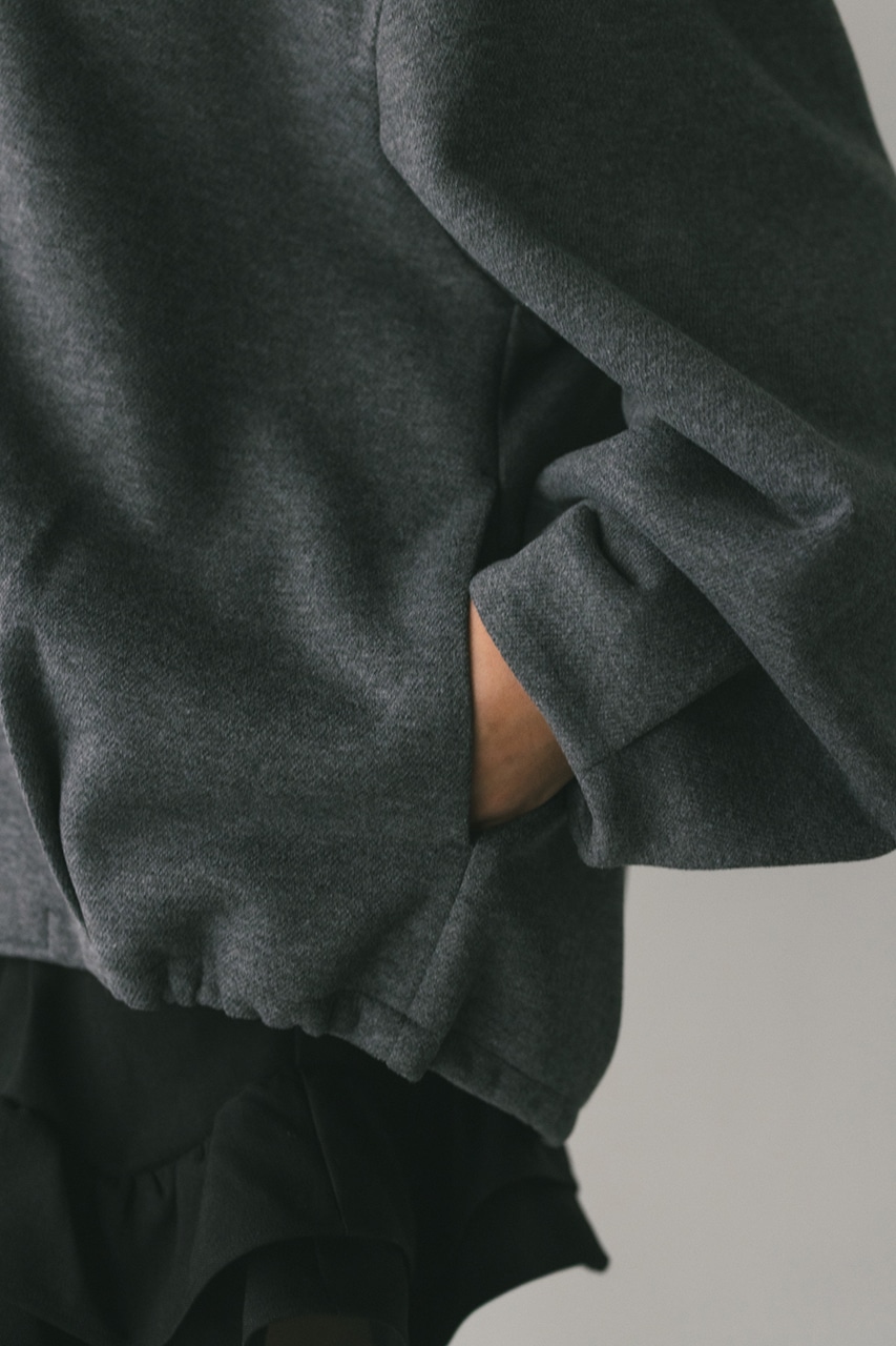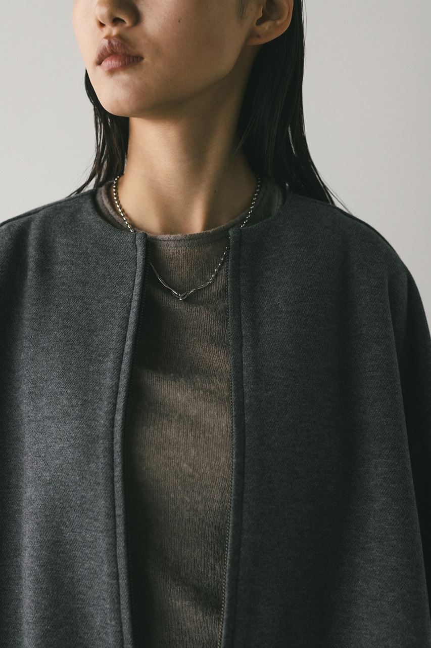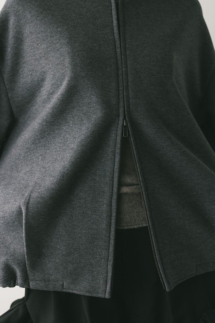 モードで上品な印象のクルーネックと、裾と袖口に入ったタックデザインが作るフォルムがスタミキらしいノーカラーブルゾン。後ろ見頃にも切り替えを入れているのでバックスタイルもかわいい一枚。裾はスピンドルが入っているのでブラウジングしても着用いただけます。しっかりとした厚みと柔らかな落ち感のあるボンディング生地を使用。表面は表面感のある綾織組織で暖かみある起毛布帛生地、裏面はソフトな肌さわりで温もりある天竺生地を使用。毛玉としわになりにくい素材でソフトなハリがあるのでシルエットが綺麗に出るのもポイントです。複数生地を貼り合わせているので裏地なしでも丈夫で扱いやすく、ごわつくことなく着用いただけます。ストレッチなし、透け感なし。