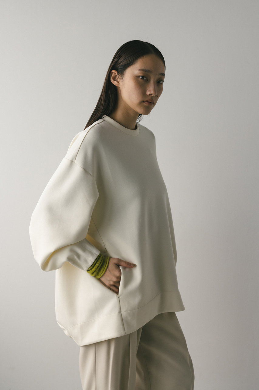 程よい弾力感と厚みのあるポンチ素材を使用したスウェット。独特なハリ感で上品な生地を使用しているので着心地も良く型崩れしにくい一枚。裾部分にラウンドパネルラインを入れたバックシルエットがデザインポイント。袖口にはタックを入れカジュアルすぎないモードな袖口に仕上げています。ストレッチあり、透け感なし。