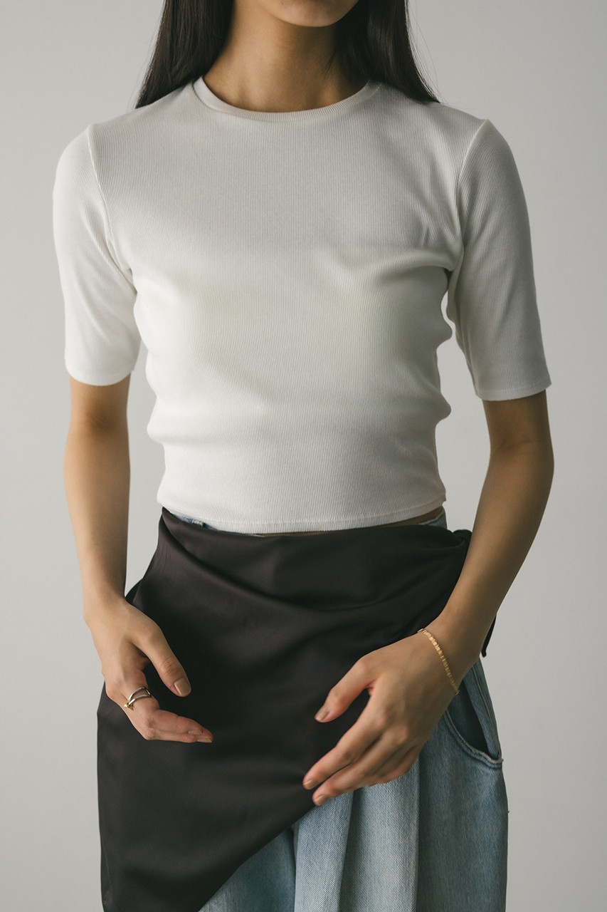 さらさらとした肌触りと独特のドライなしゃり感が高みえするTシャツ。ストレッチ性のあるテレコ素材を使用し、肌触りにこだわった一枚です。腕を華奢に見せてくれる袖丈とコンパクトなサイズ感でシーンを選ばず着用頂けます。脇ハギはあえて前にたおしているのでスタイルアップ見せしてくれます。ストレッチあり、透け感WHTややあり。