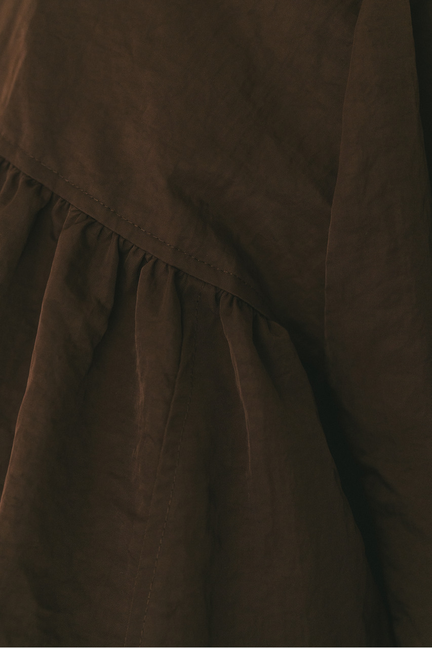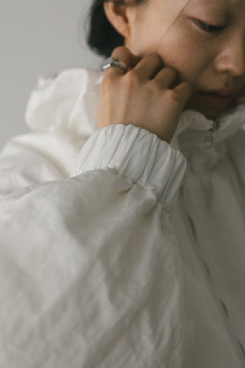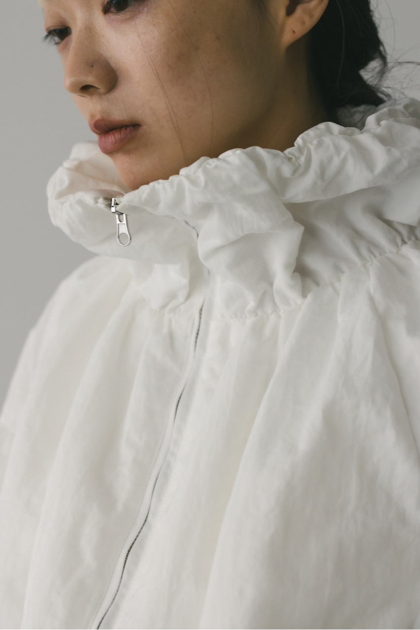 襟にギャザーをたっぷりと寄せニュアンスをもたせた中綿入りブルゾン。上品な光沢感と適度な柔らかさとハリ感を合わせ持ったこだわりのナイロン素材を使用。ファスナーを上まで閉めたスタンドネックスタイルや少し開けて折り返した襟も楽しめます。後ろ襟に施された長めのドロストコードと深く入ったタックによりバックスタイルもこなれた印象に。ギャザーを寄せたゆったりとした丸みのある袖なので、厚手のニットも着用いただけます。裾は調整できるストッパー&ゴム仕様。ポケットあり。裏地あり。ストレッチなし、透け感なし。