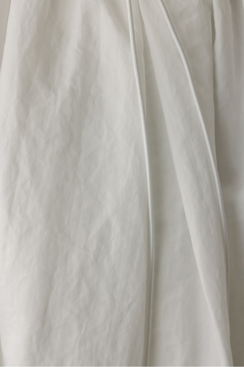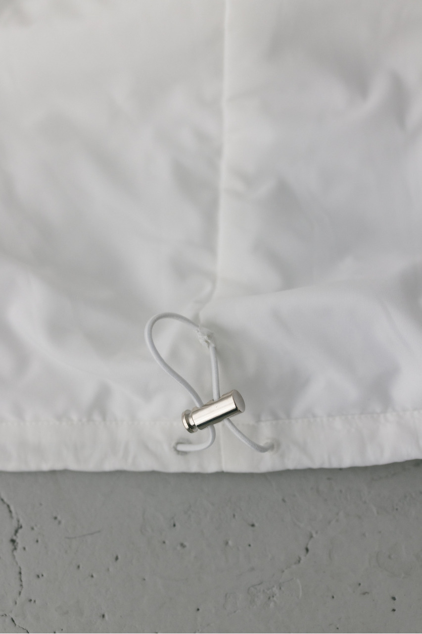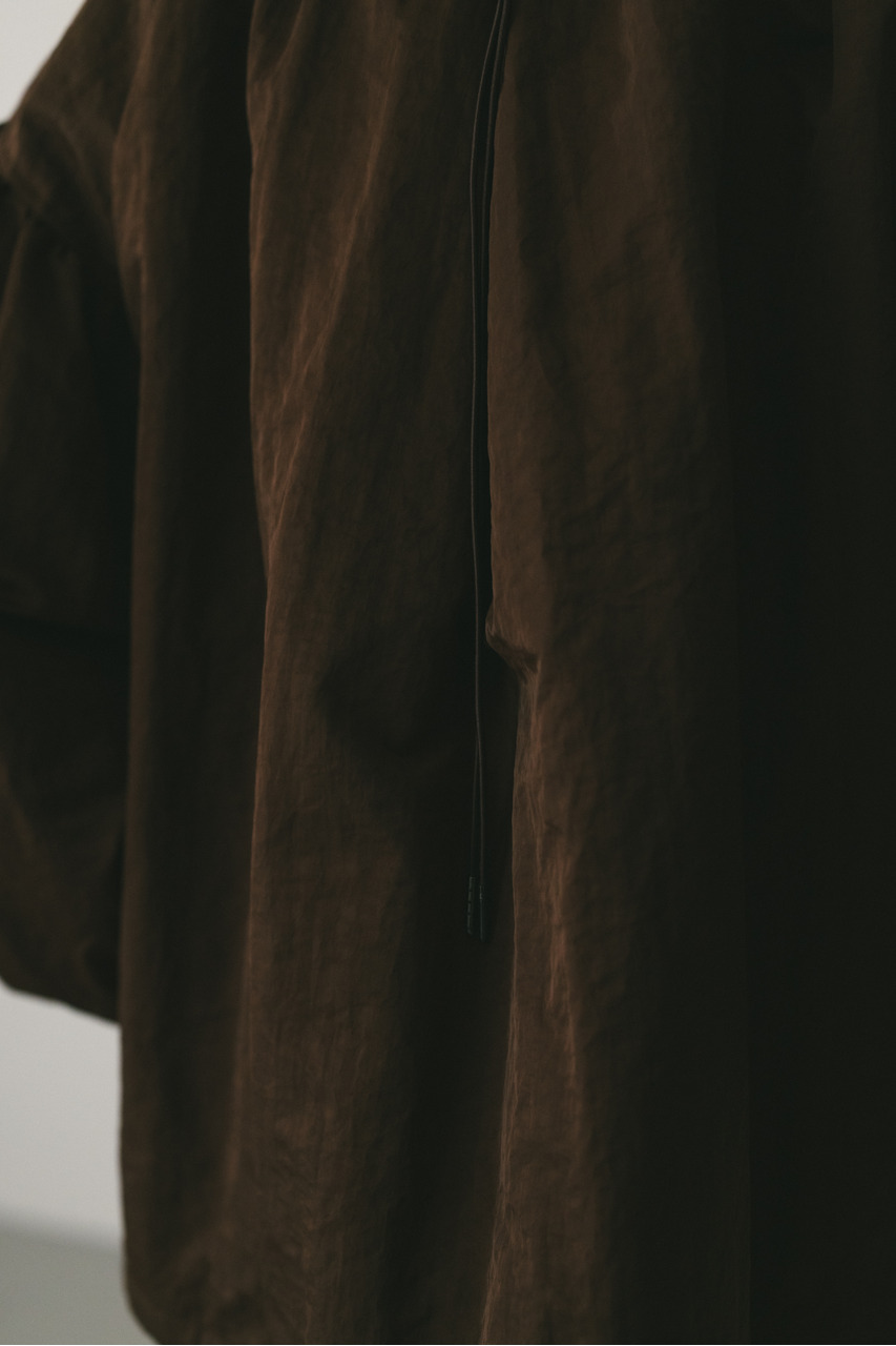 襟にギャザーをたっぷりと寄せニュアンスをもたせた中綿入りブルゾン。上品な光沢感と適度な柔らかさとハリ感を合わせ持ったこだわりのナイロン素材を使用。ファスナーを上まで閉めたスタンドネックスタイルや少し開けて折り返した襟も楽しめます。後ろ襟に施された長めのドロストコードと深く入ったタックによりバックスタイルもこなれた印象に。ギャザーを寄せたゆったりとした丸みのある袖なので、厚手のニットも着用いただけます。裾は調整できるストッパー&ゴム仕様。ポケットあり。裏地あり。ストレッチなし、透け感なし。