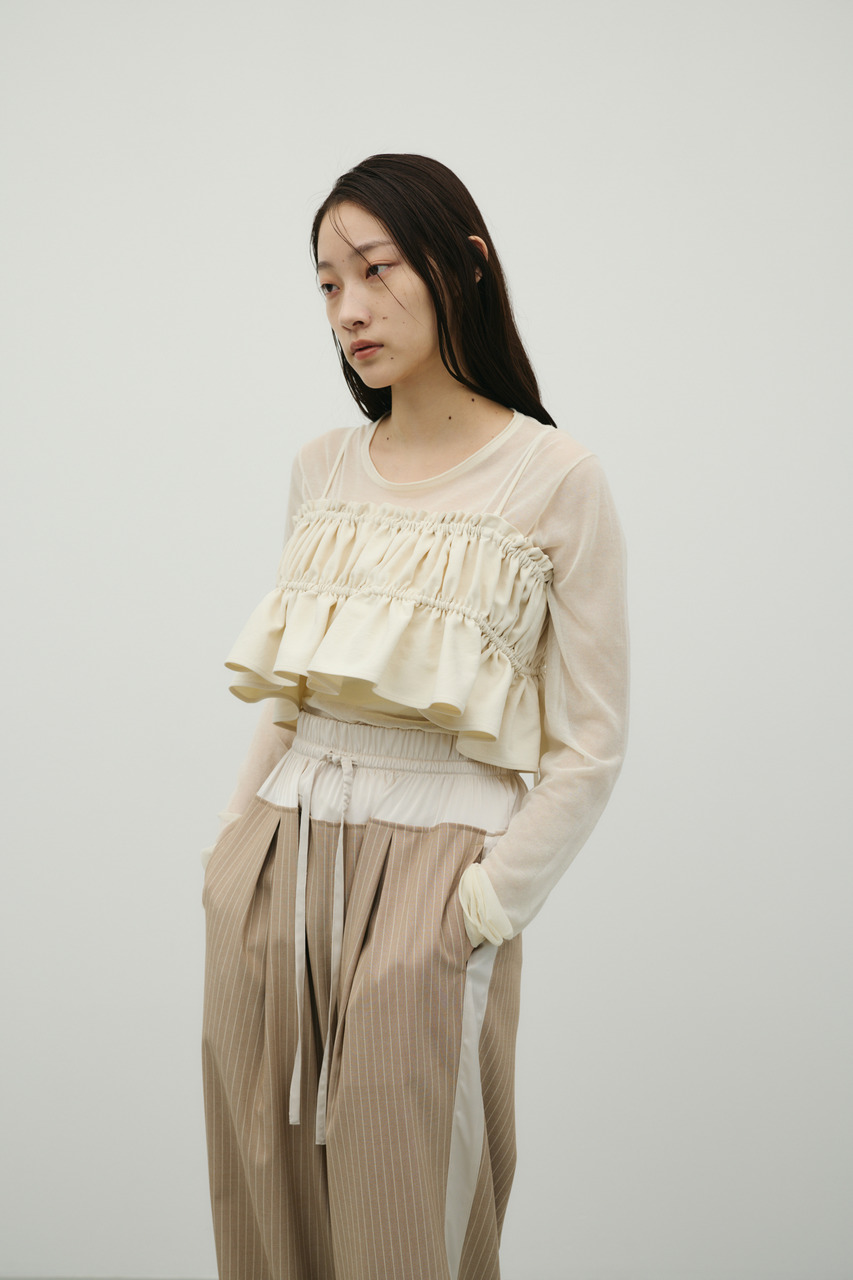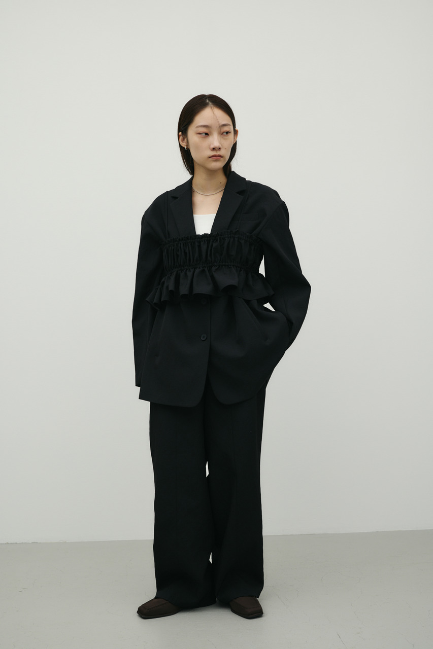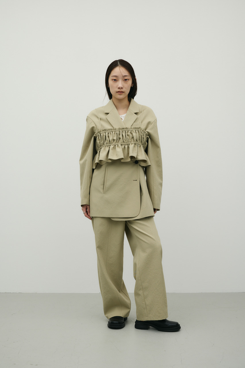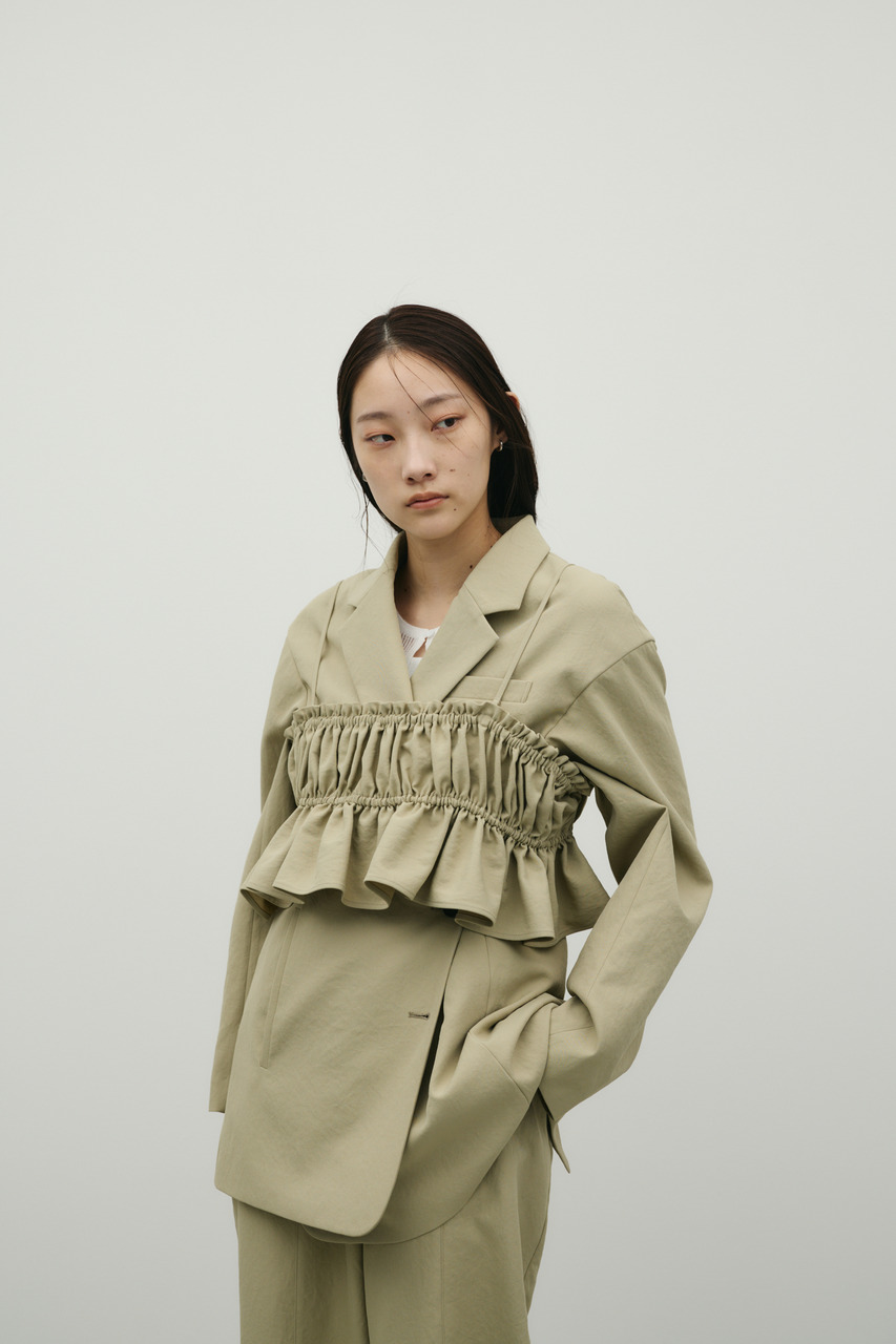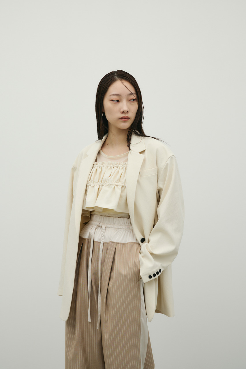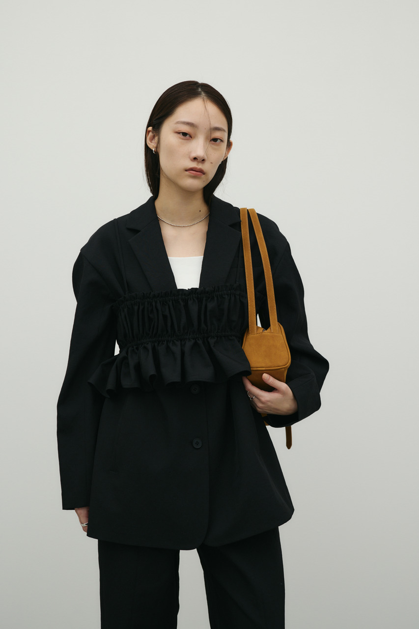 スタイリングのアクセントになるフリルビスチェが登場。ギャザーをたっぷりと寄せた立体感のあるデザインで、コーディネートに動きと華やかさをプラス。キャミソールとしての着用はもちろん、ジャケットの上から斜めにレイヤードしたり、腰に巻いたりして、アレンジ次第で幅広い着こなしが楽しめるマルチウェイ仕様。肩紐はアジャスターで長さ調整可能。フロントの共紐もフィット感をお好みに合わせて調整可能です。500JSA30-0571(ハイラインテーラードジャケット)、500JSA31-0591(ハイラインワイドパンツ)とセットアップ着用可能。ストレッチややあり、透け感なし。