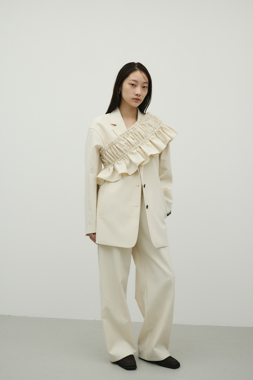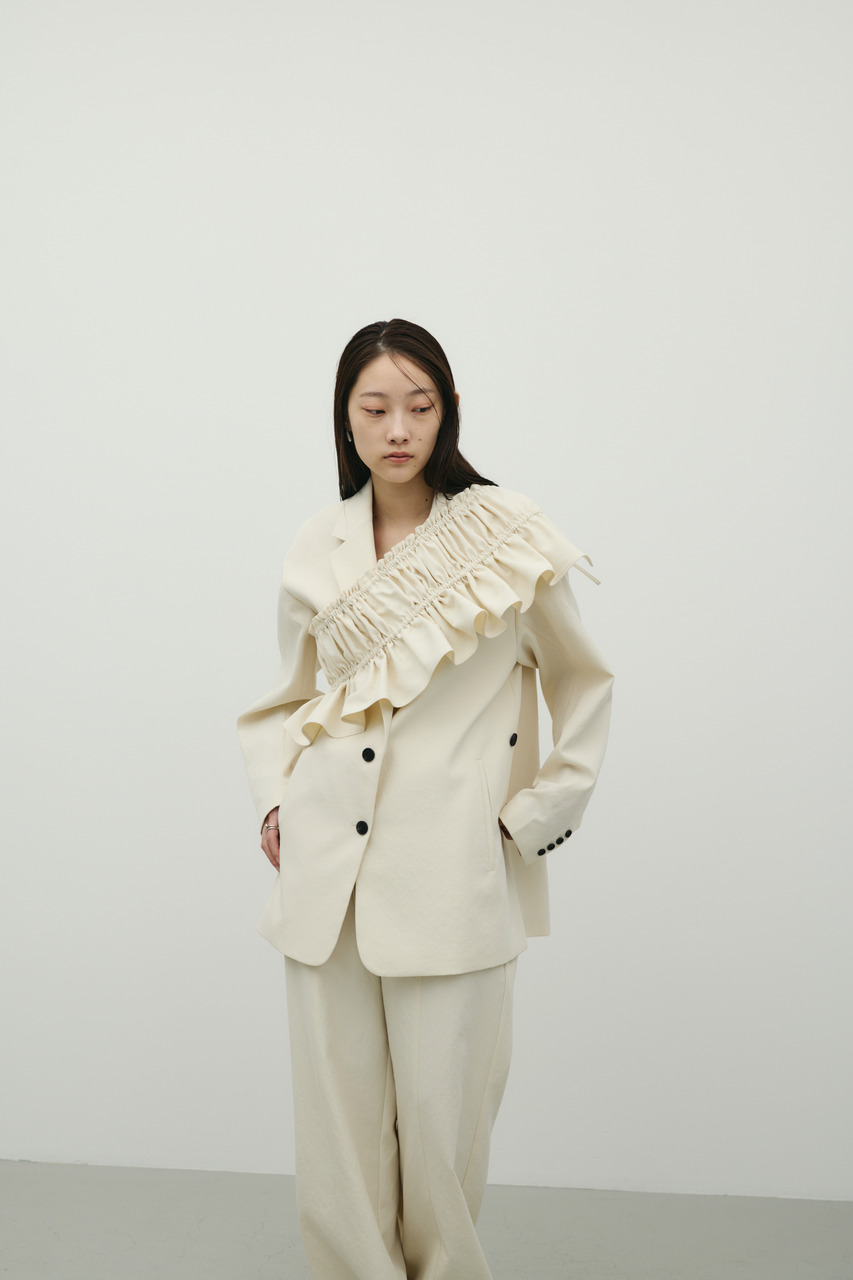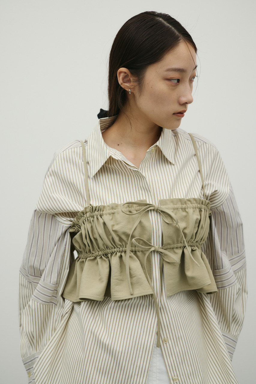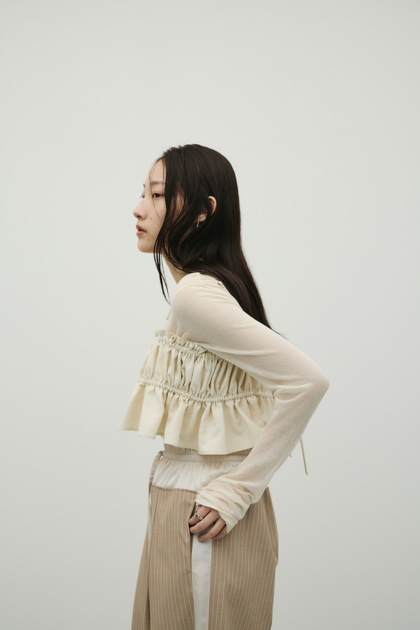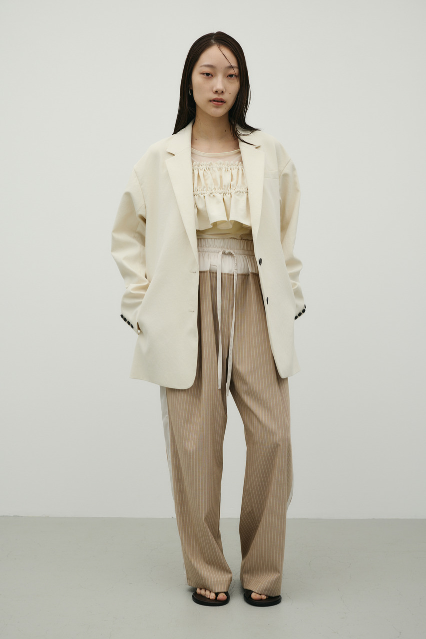 スタイリングのアクセントになるフリルビスチェが登場。ギャザーをたっぷりと寄せた立体感のあるデザインで、コーディネートに動きと華やかさをプラス。キャミソールとしての着用はもちろん、ジャケットの上から斜めにレイヤードしたり、腰に巻いたりして、アレンジ次第で幅広い着こなしが楽しめるマルチウェイ仕様。肩紐はアジャスターで長さ調整可能。フロントの共紐もフィット感をお好みに合わせて調整可能です。500JSA30-0571(ハイラインテーラードジャケット)、500JSA31-0591(ハイラインワイドパンツ)とセットアップ着用可能。ストレッチややあり、透け感なし。