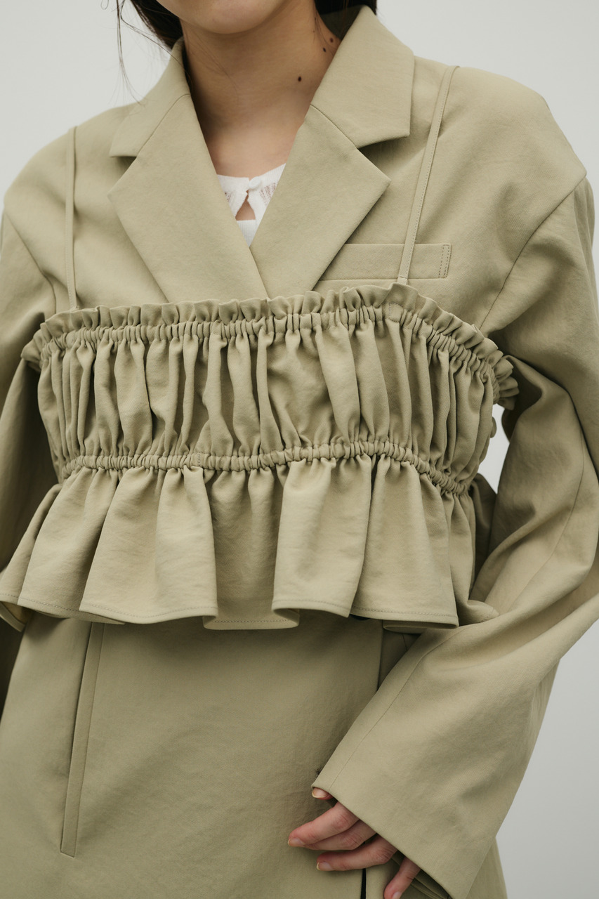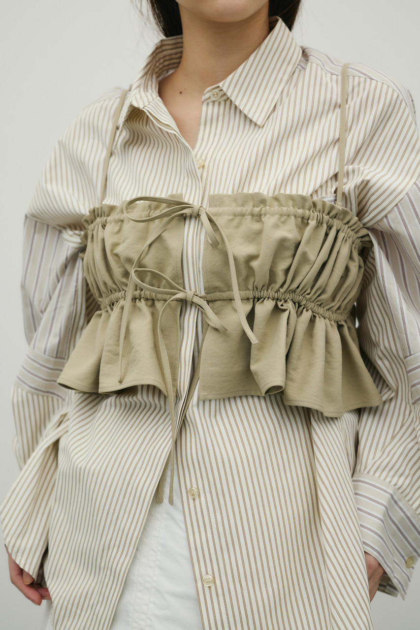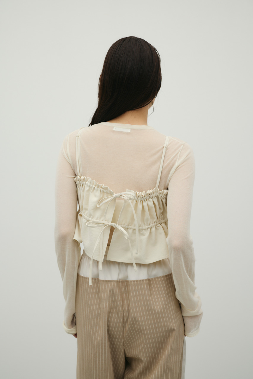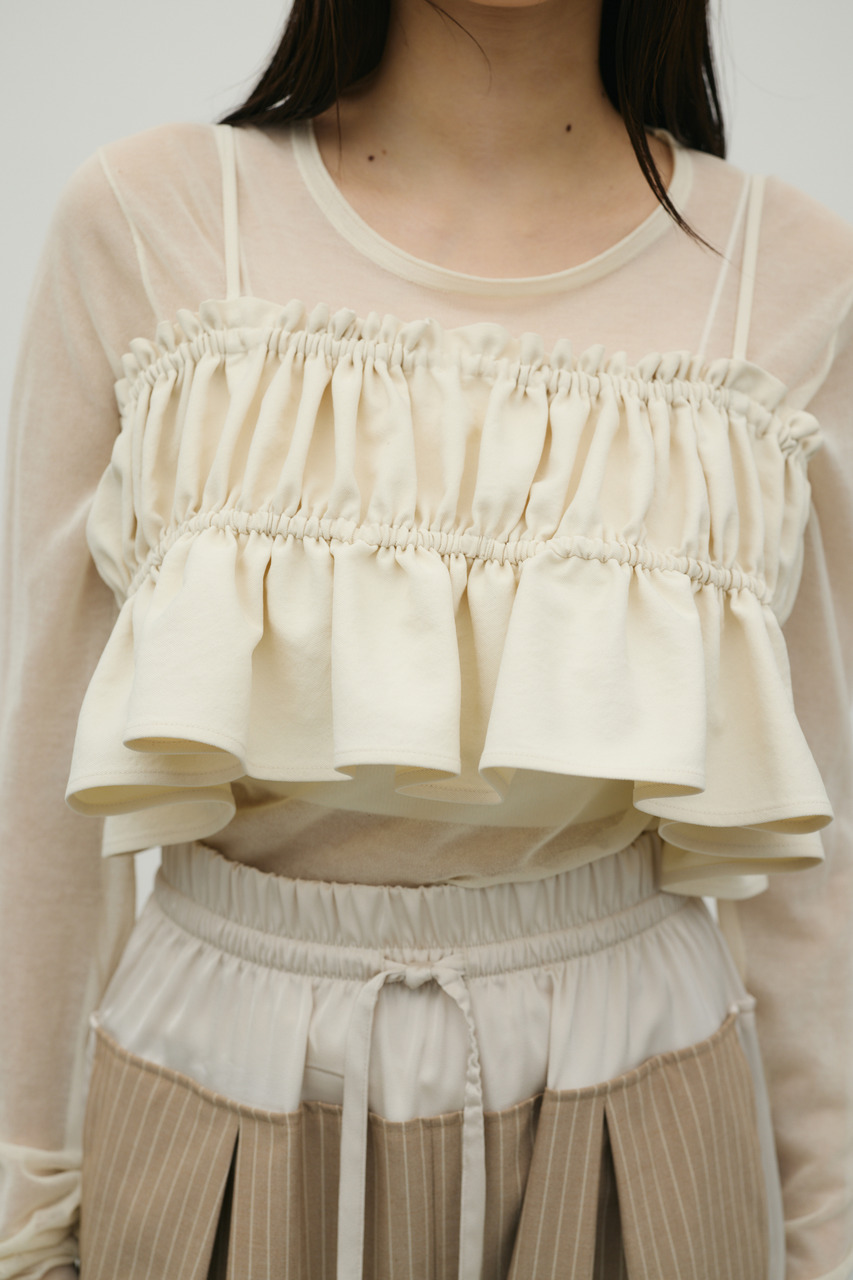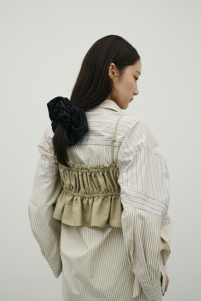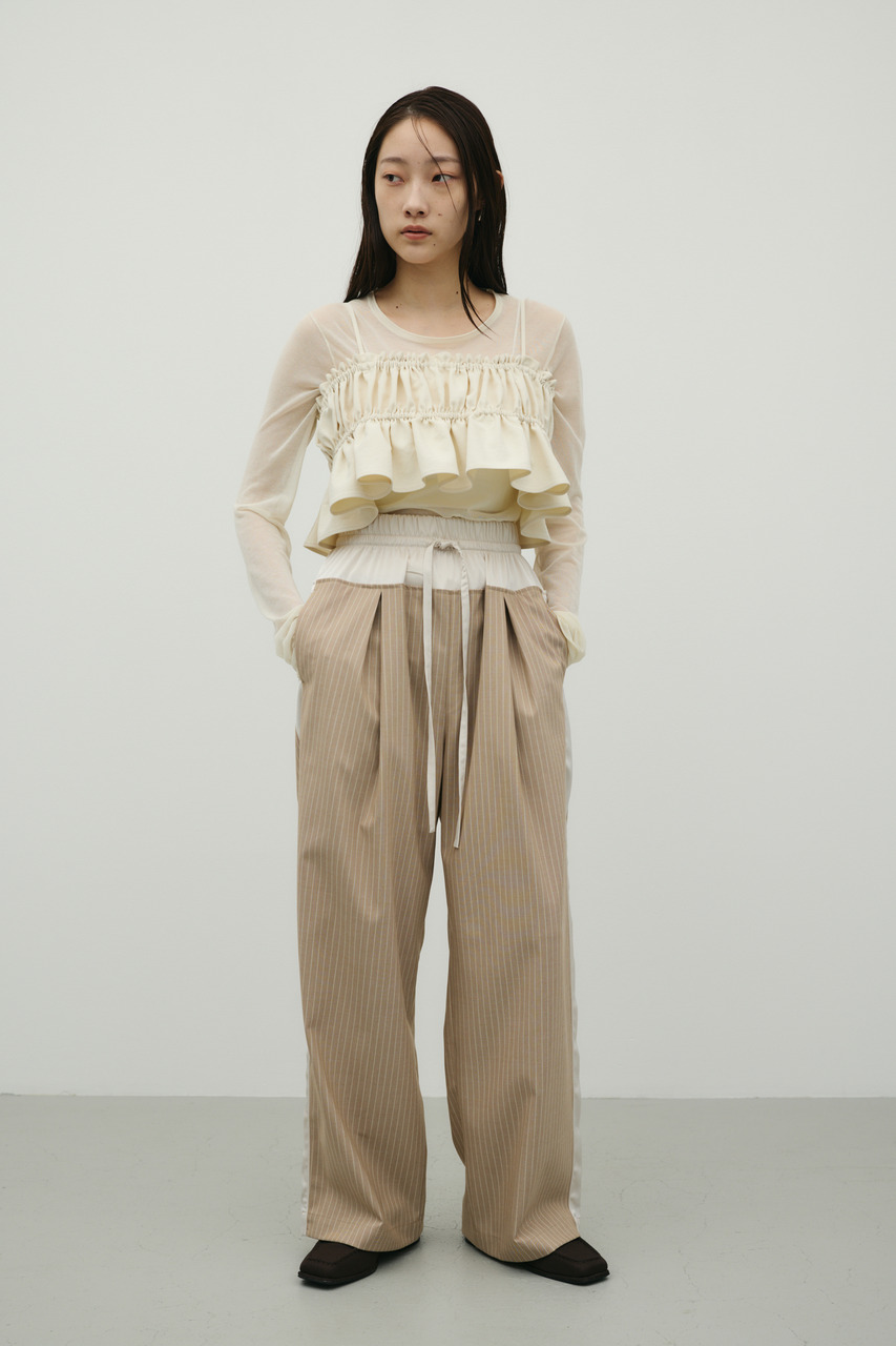 スタイリングのアクセントになるフリルビスチェが登場。ギャザーをたっぷりと寄せた立体感のあるデザインで、コーディネートに動きと華やかさをプラス。キャミソールとしての着用はもちろん、ジャケットの上から斜めにレイヤードしたり、腰に巻いたりして、アレンジ次第で幅広い着こなしが楽しめるマルチウェイ仕様。肩紐はアジャスターで長さ調整可能。フロントの共紐もフィット感をお好みに合わせて調整可能です。500JSA30-0571(ハイラインテーラードジャケット)、500JSA31-0591(ハイラインワイドパンツ)とセットアップ着用可能。ストレッチややあり、透け感なし。