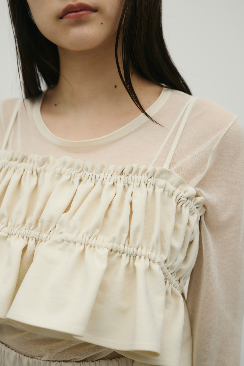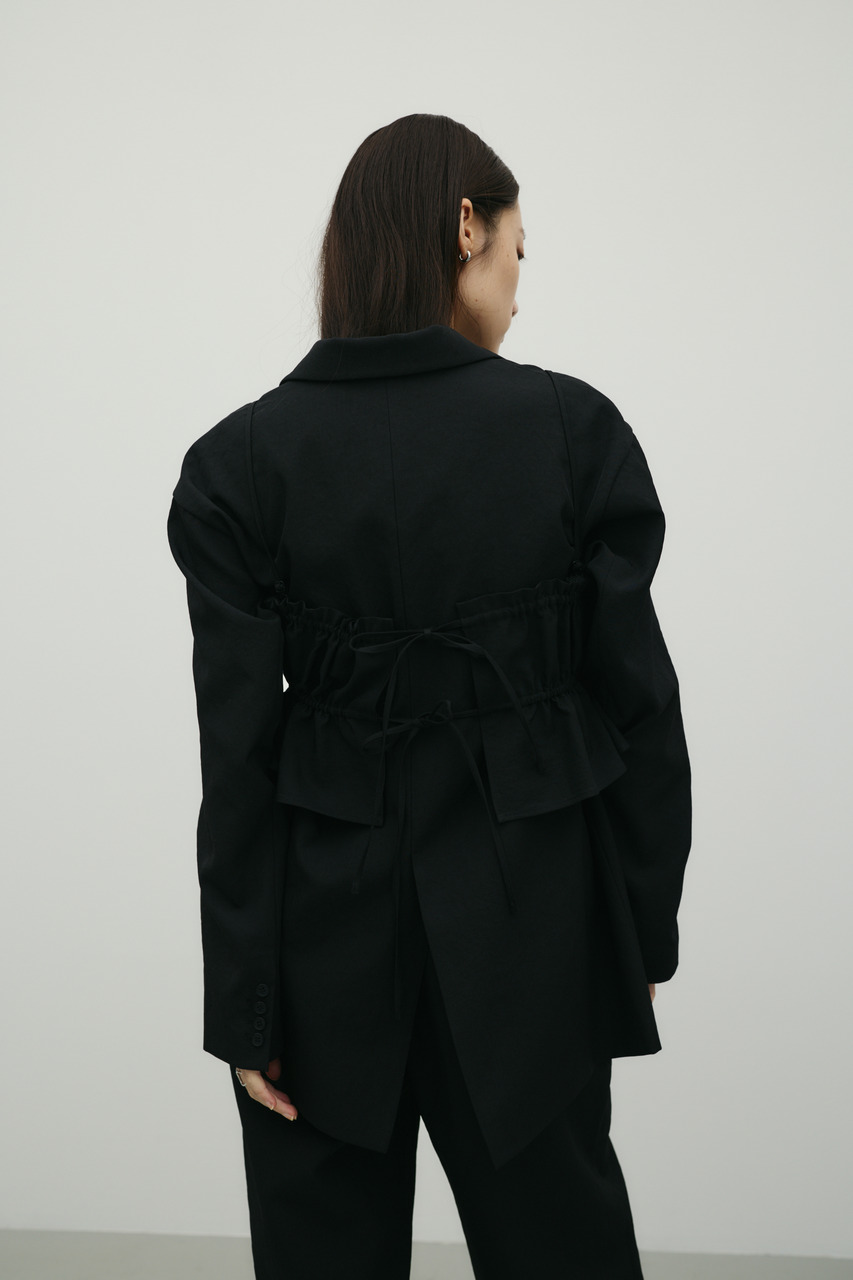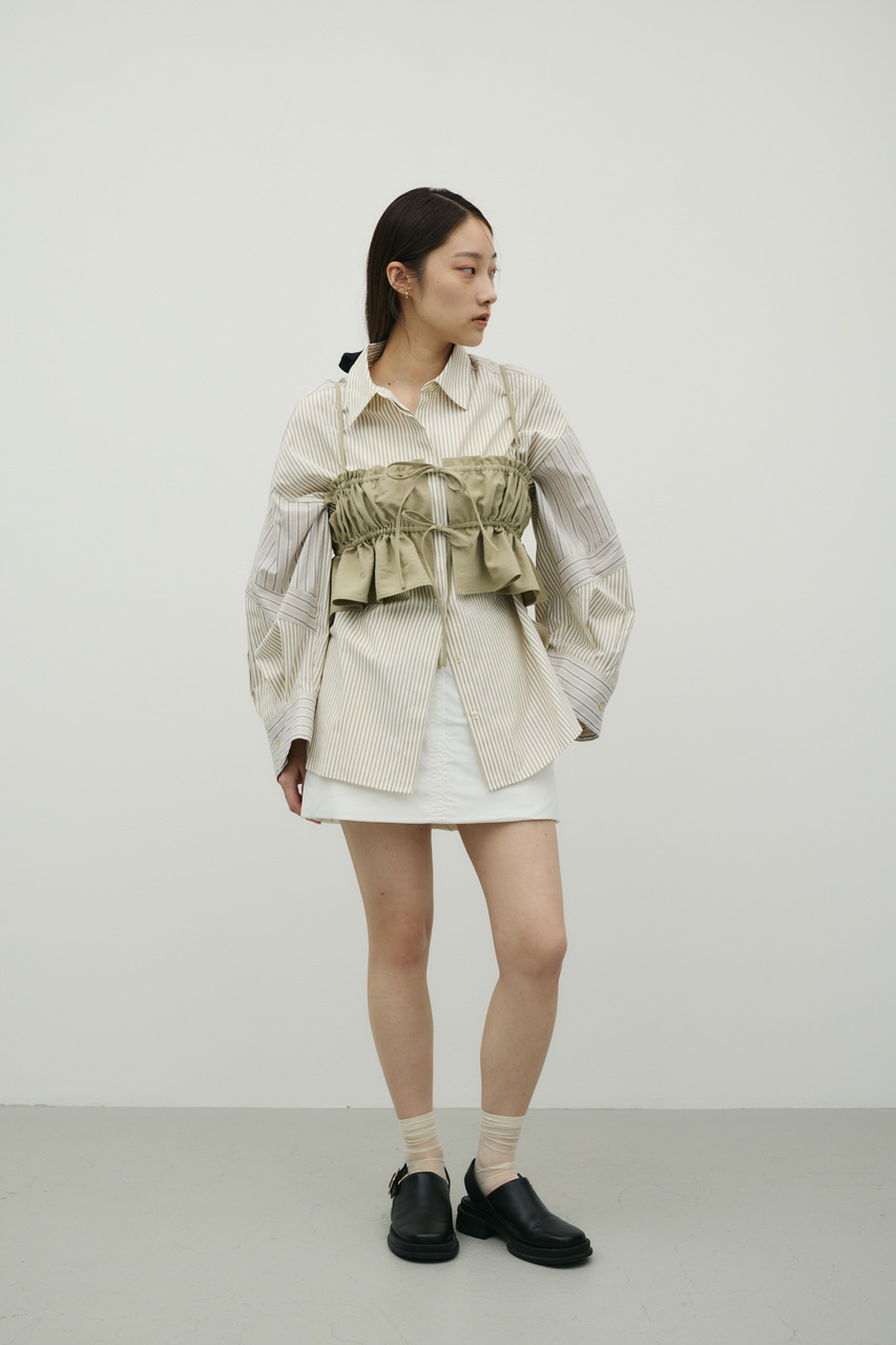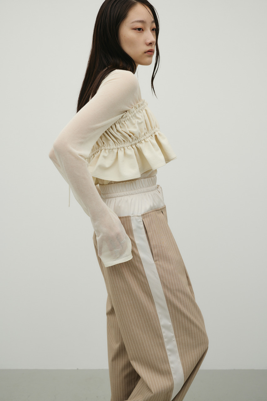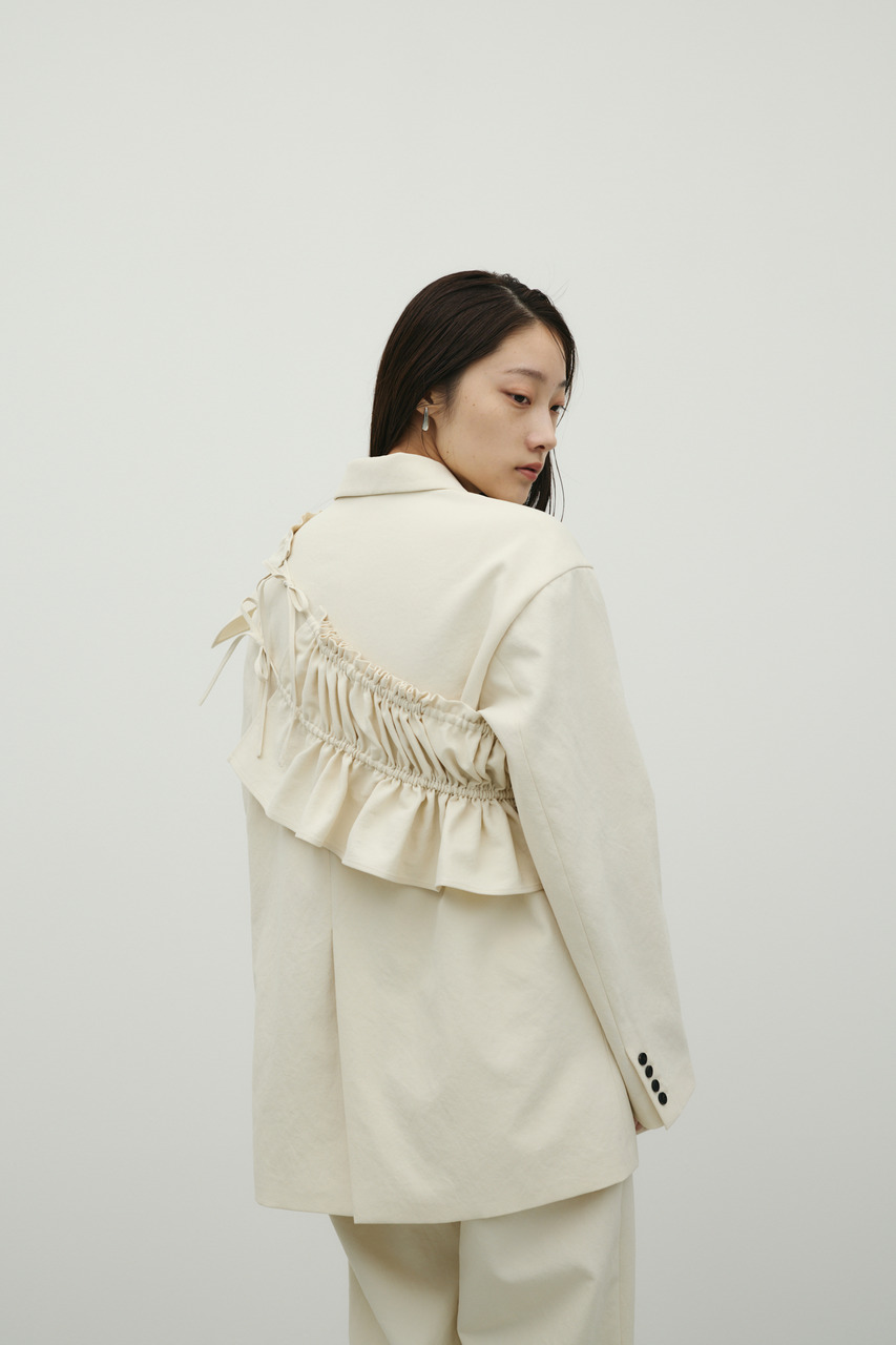 スタイリングのアクセントになるフリルビスチェが登場。ギャザーをたっぷりと寄せた立体感のあるデザインで、コーディネートに動きと華やかさをプラス。キャミソールとしての着用はもちろん、ジャケットの上から斜めにレイヤードしたり、腰に巻いたりして、アレンジ次第で幅広い着こなしが楽しめるマルチウェイ仕様。肩紐はアジャスターで長さ調整可能。フロントの共紐もフィット感をお好みに合わせて調整可能です。500JSA30-0571(ハイラインテーラードジャケット)、500JSA31-0591(ハイラインワイドパンツ)とセットアップ着用可能。ストレッチややあり、透け感なし。