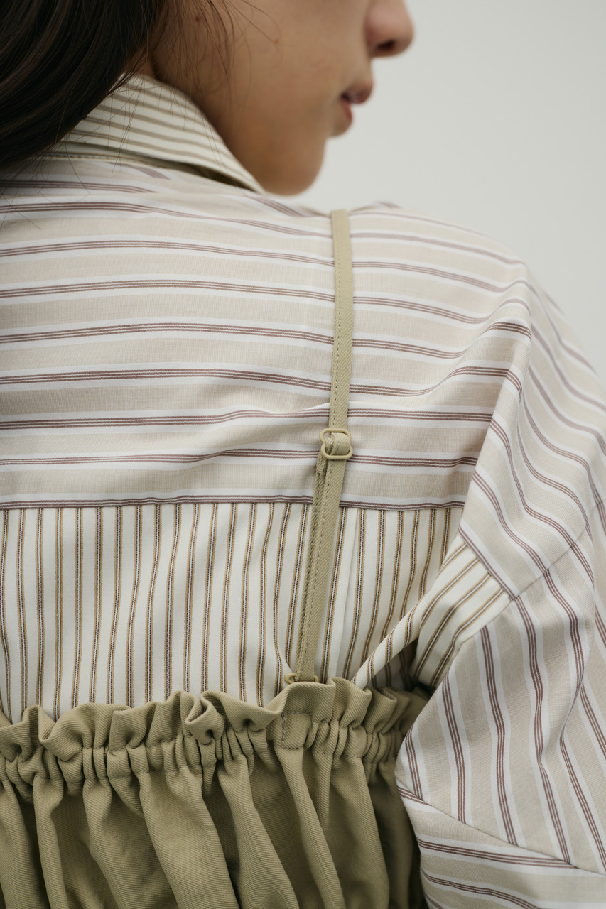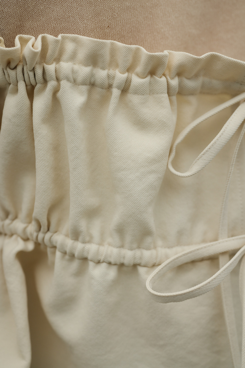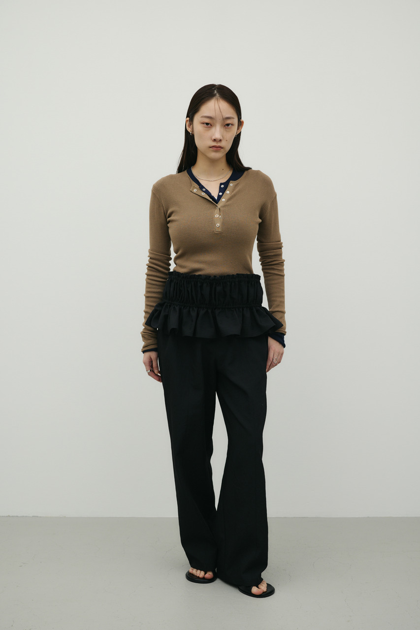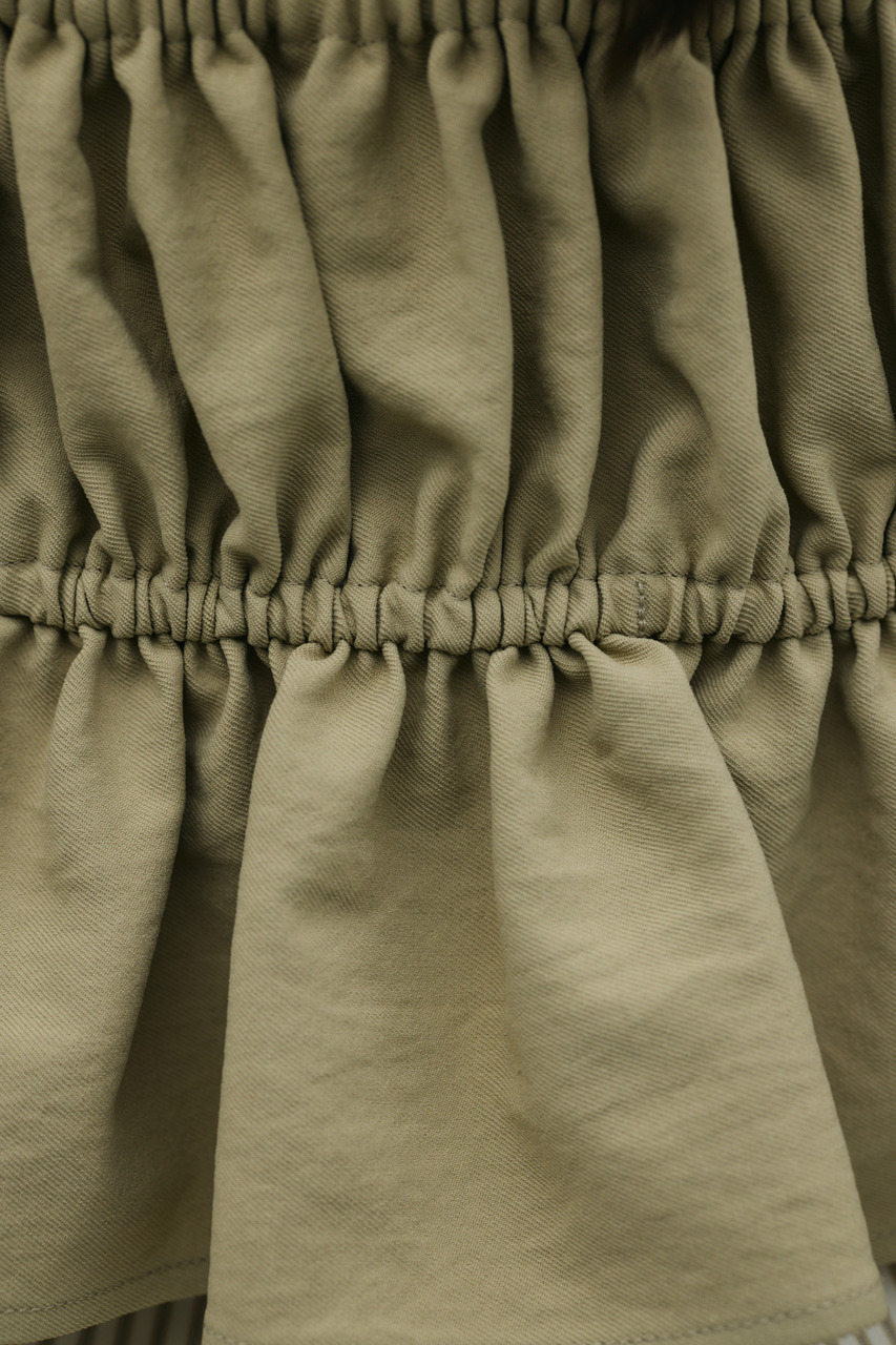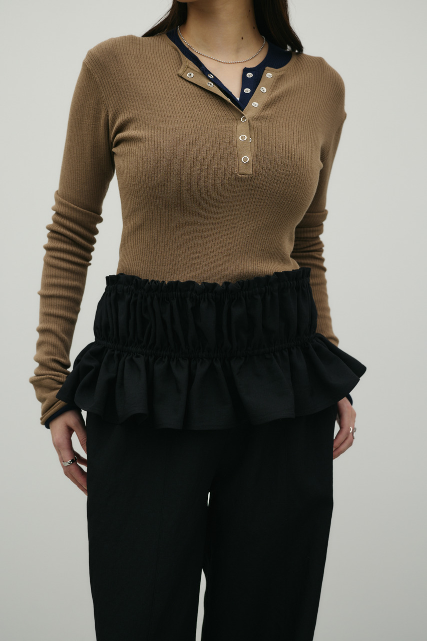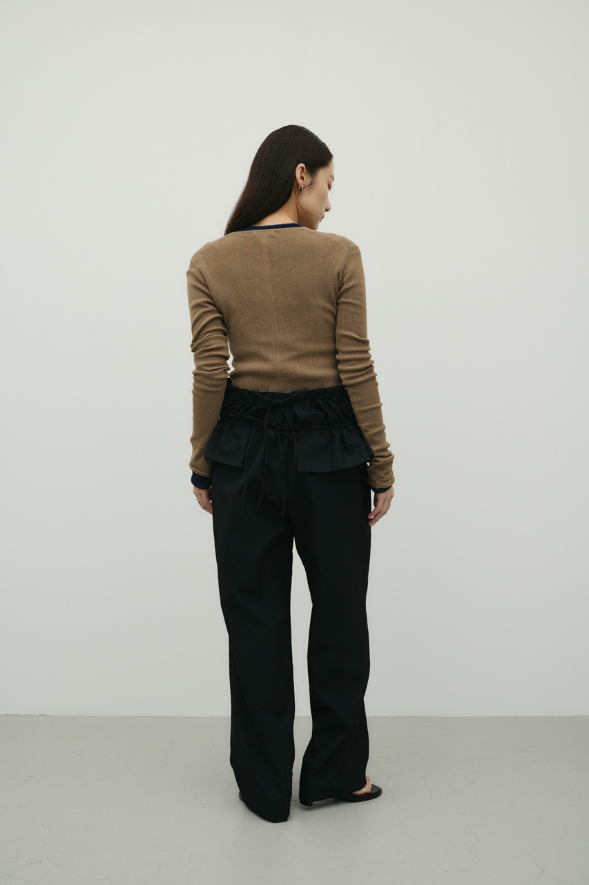 スタイリングのアクセントになるフリルビスチェが登場。ギャザーをたっぷりと寄せた立体感のあるデザインで、コーディネートに動きと華やかさをプラス。キャミソールとしての着用はもちろん、ジャケットの上から斜めにレイヤードしたり、腰に巻いたりして、アレンジ次第で幅広い着こなしが楽しめるマルチウェイ仕様。肩紐はアジャスターで長さ調整可能。フロントの共紐もフィット感をお好みに合わせて調整可能です。500JSA30-0571(ハイラインテーラードジャケット)、500JSA31-0591(ハイラインワイドパンツ)とセットアップ着用可能。ストレッチややあり、透け感なし。
