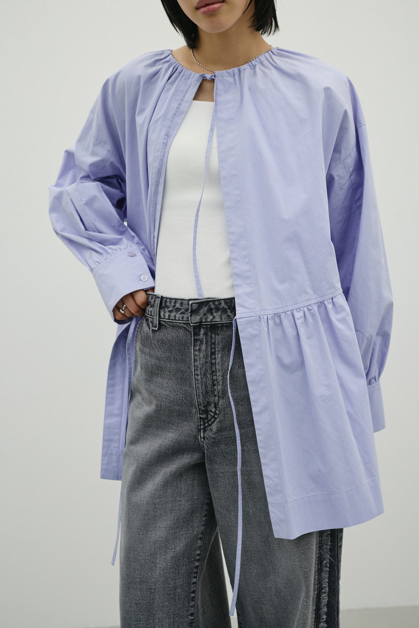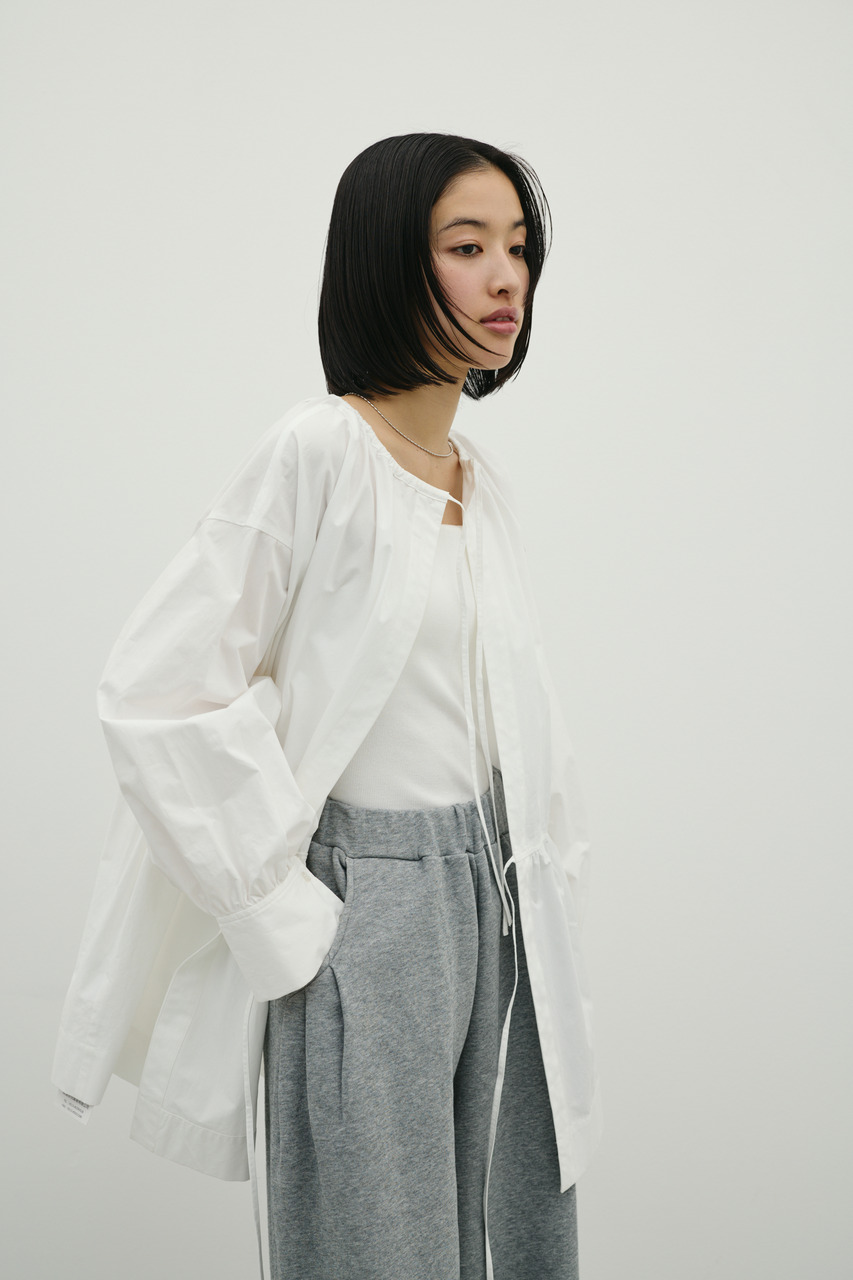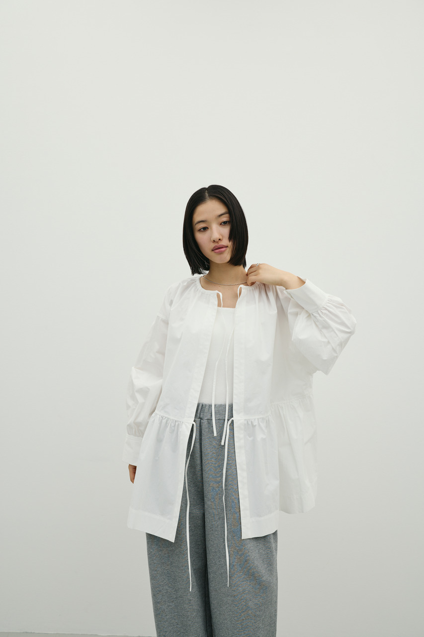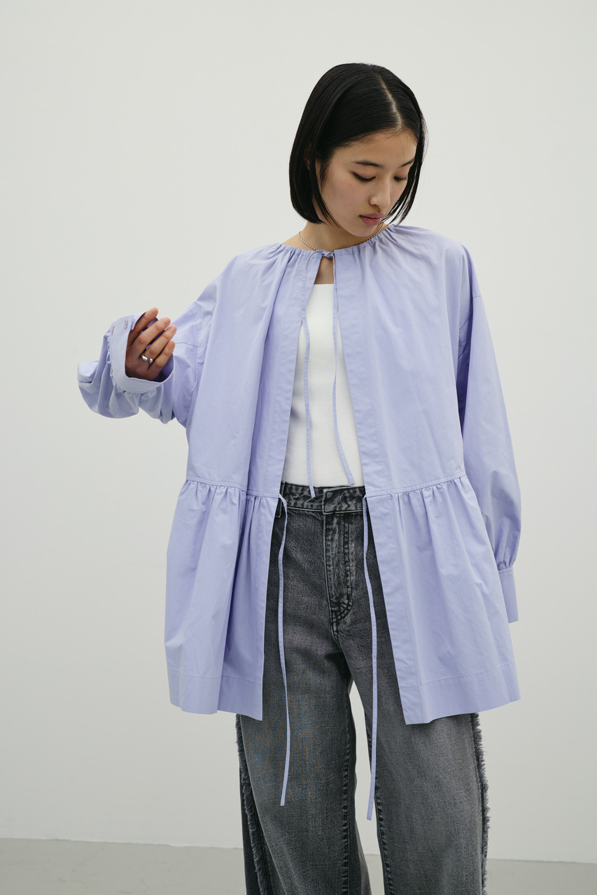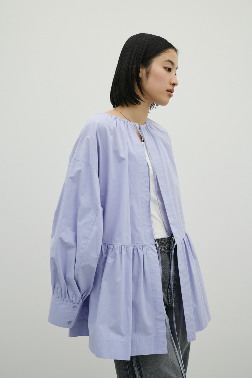 動いた時のフレアシルエットが美しくエアリー感のあるギャザーをたっぷりと寄せたコットンシャツ。前立ては共地リボン開き仕様になっており、前後2WAYで着用可能。衿ぐりの共地リボンは調整可能なため、お好みのネックの開き具合で着用いただけます。袖口はカフス仕様なので、たくしあげてパフっと着用するのがおすすめです。ハリのあるコットンを使用。透け感WHTややあり、ストレッチなし。