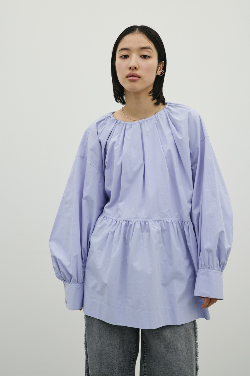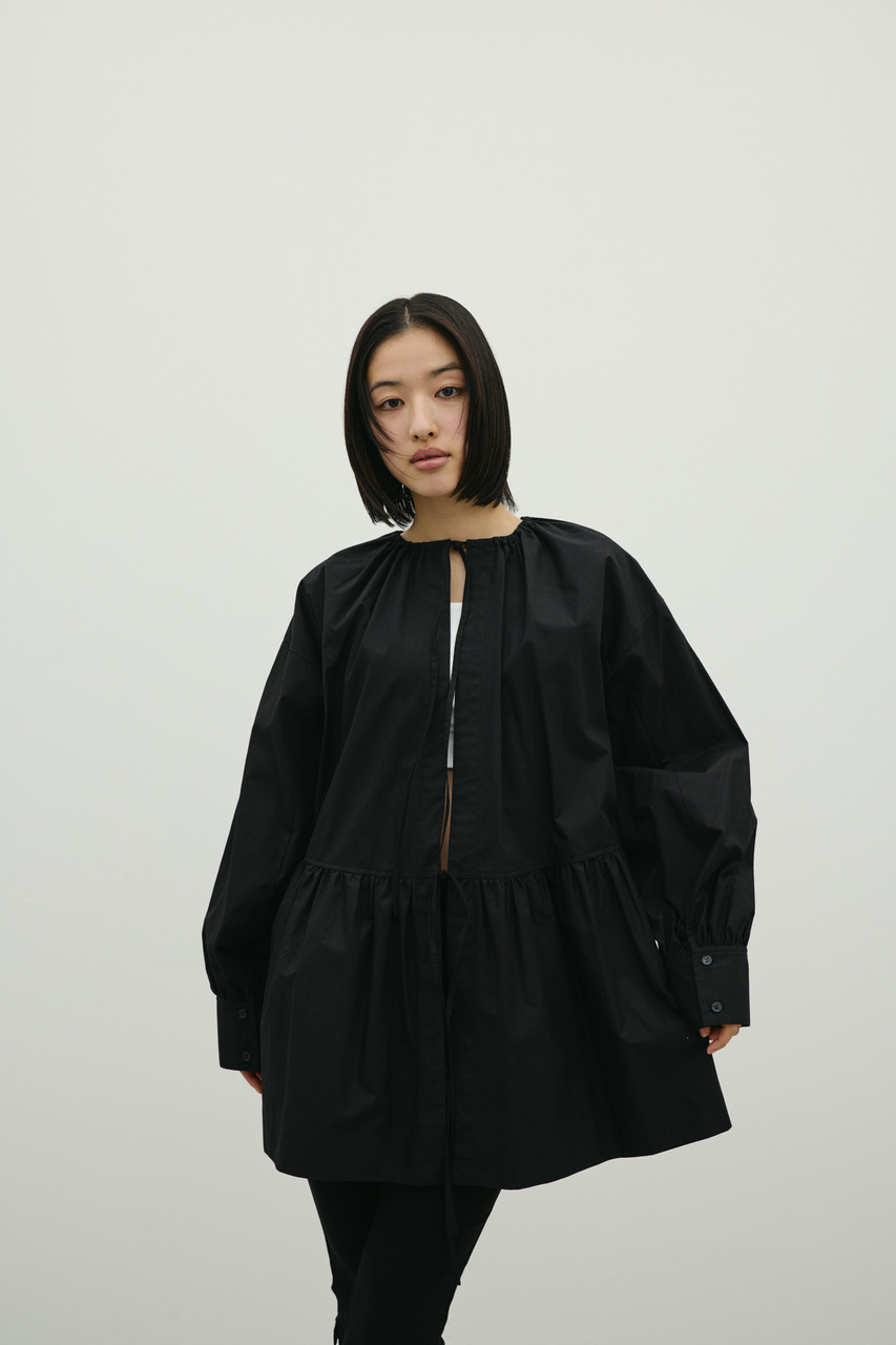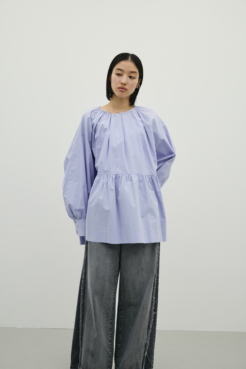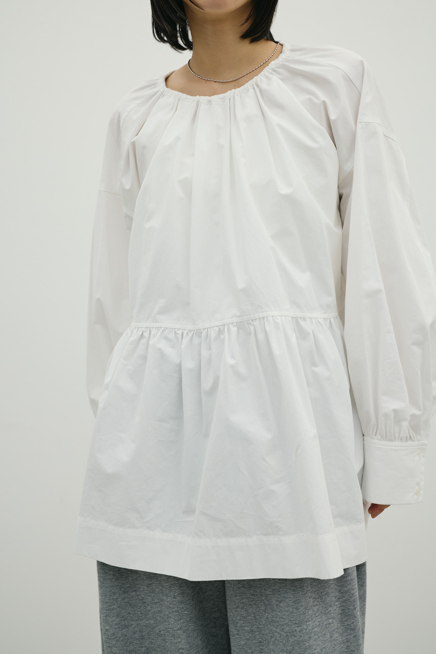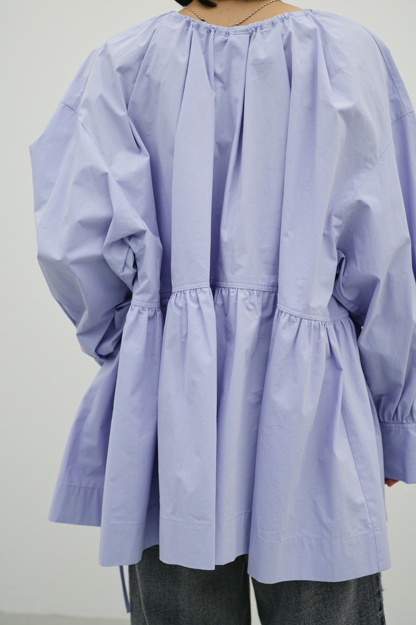 動いた時のフレアシルエットが美しくエアリー感のあるギャザーをたっぷりと寄せたコットンシャツ。前立ては共地リボン開き仕様になっており、前後2WAYで着用可能。衿ぐりの共地リボンは調整可能なため、お好みのネックの開き具合で着用いただけます。袖口はカフス仕様なので、たくしあげてパフっと着用するのがおすすめです。ハリのあるコットンを使用。透け感WHTややあり、ストレッチなし。
