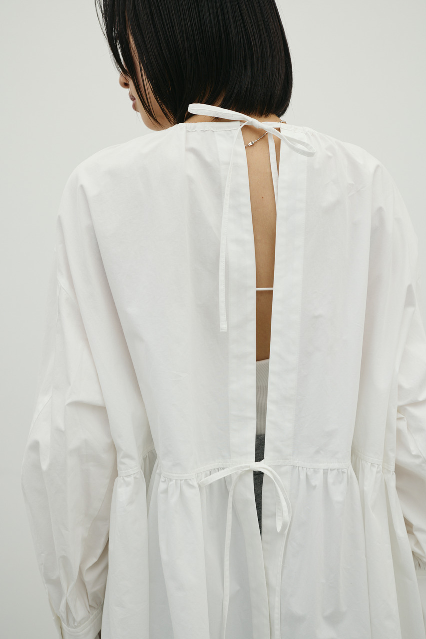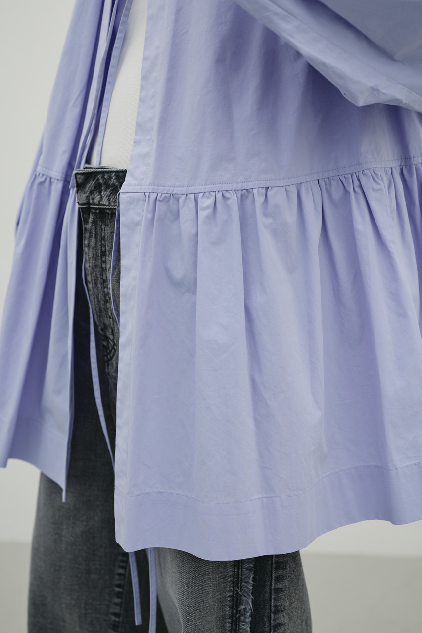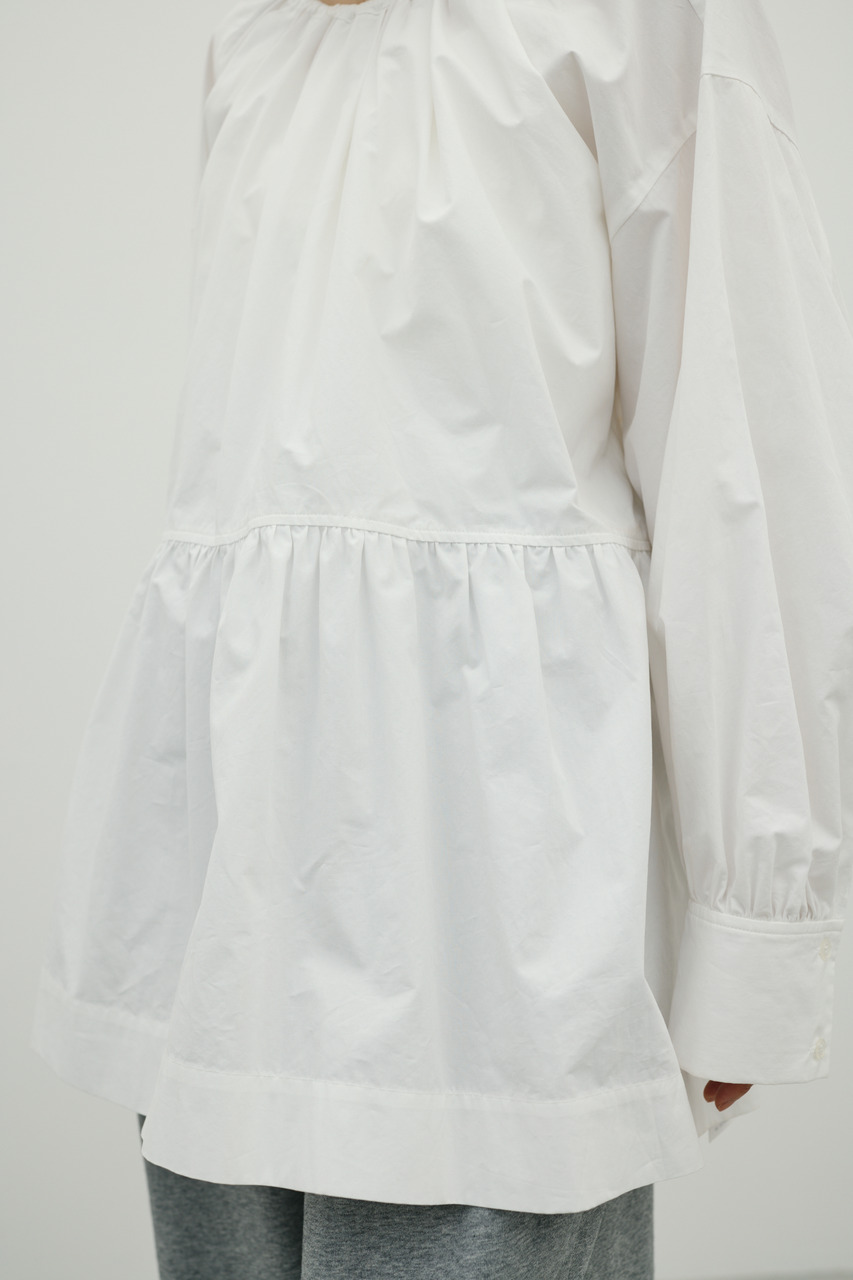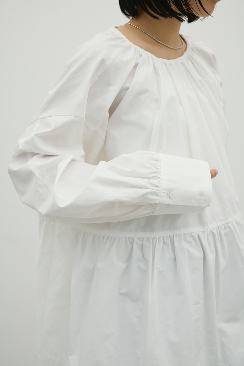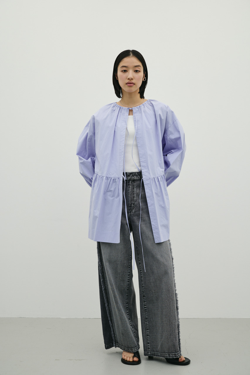 動いた時のフレアシルエットが美しくエアリー感のあるギャザーをたっぷりと寄せたコットンシャツ。前立ては共地リボン開き仕様になっており、前後2WAYで着用可能。衿ぐりの共地リボンは調整可能なため、お好みのネックの開き具合で着用いただけます。袖口はカフス仕様なので、たくしあげてパフっと着用するのがおすすめです。ハリのあるコットンを使用。透け感WHTややあり、ストレッチなし。