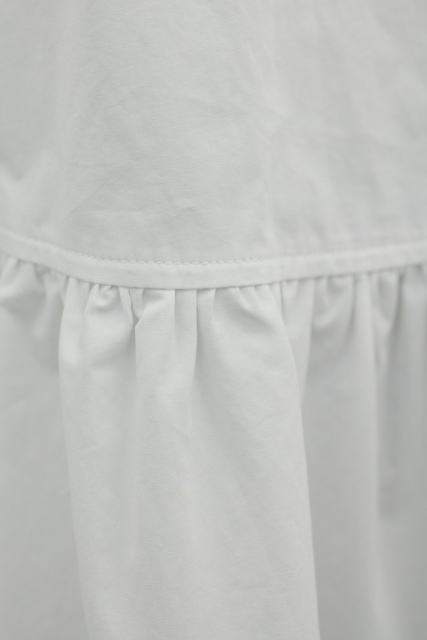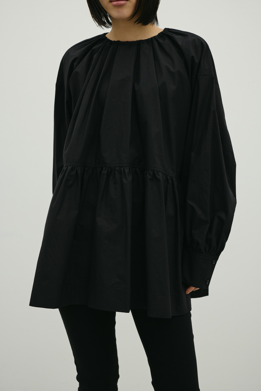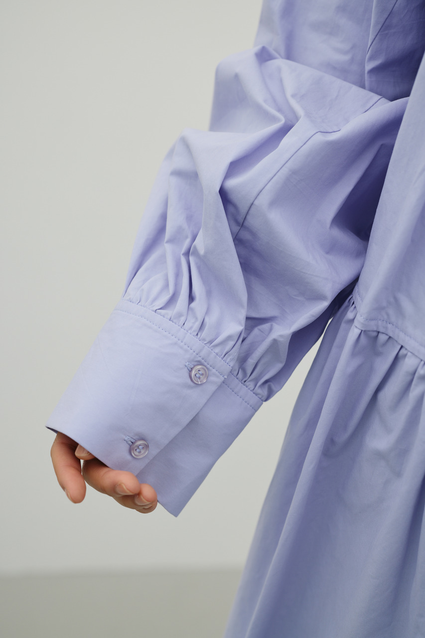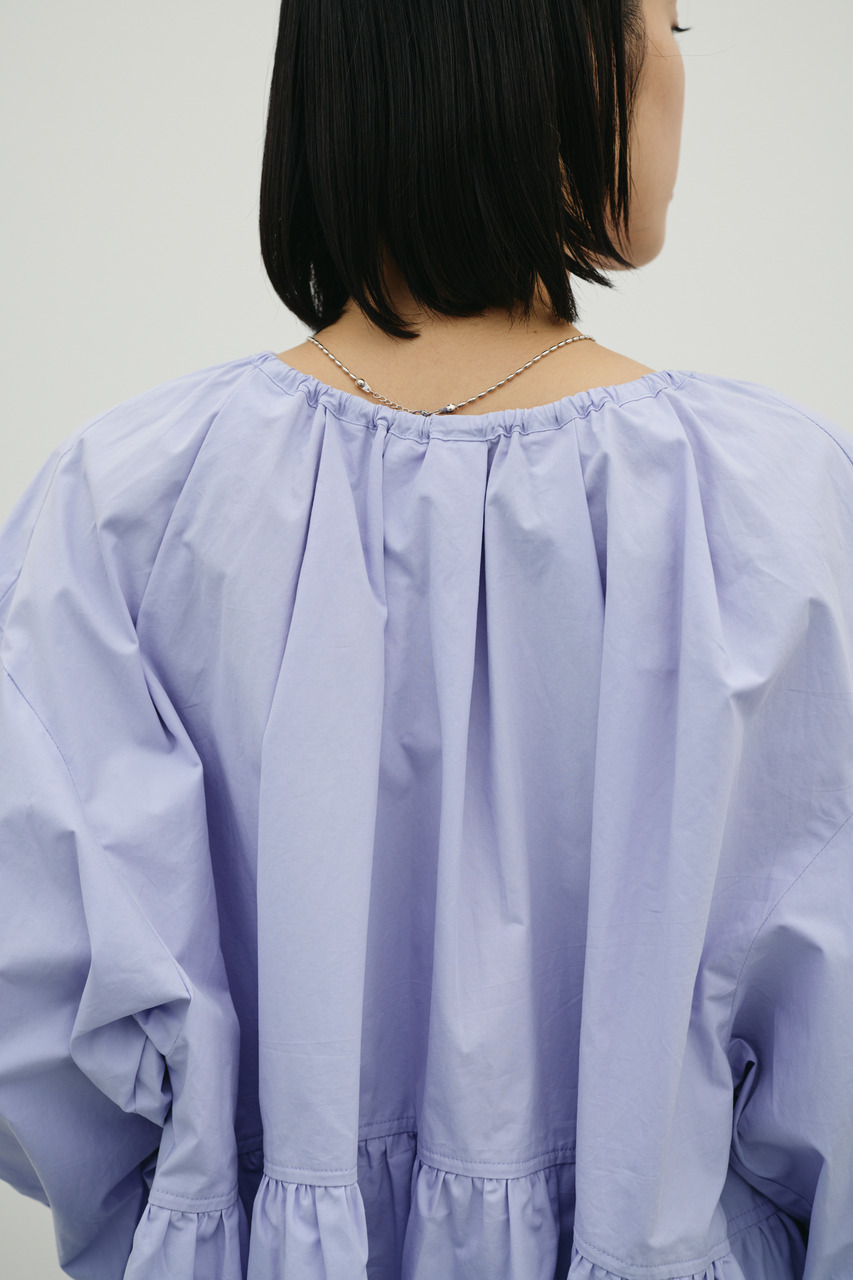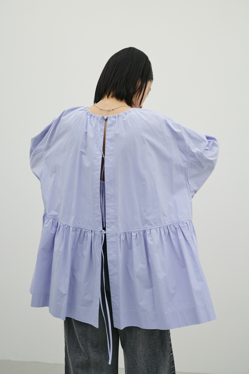動いた時のフレアシルエットが美しくエアリー感のあるギャザーをたっぷりと寄せたコットンシャツ。前立ては共地リボン開き仕様になっており、前後2WAYで着用可能。衿ぐりの共地リボンは調整可能なため、お好みのネックの開き具合で着用いただけます。袖口はカフス仕様なので、たくしあげてパフっと着用するのがおすすめです。ハリのあるコットンを使用。透け感WHTややあり、ストレッチなし。
