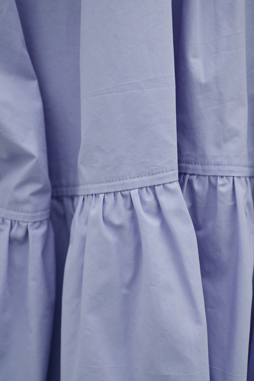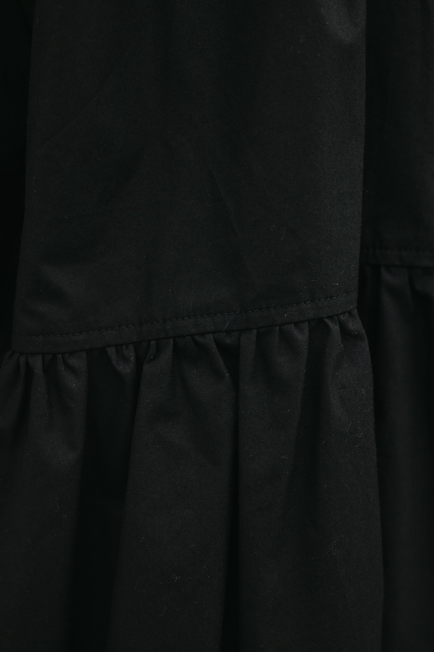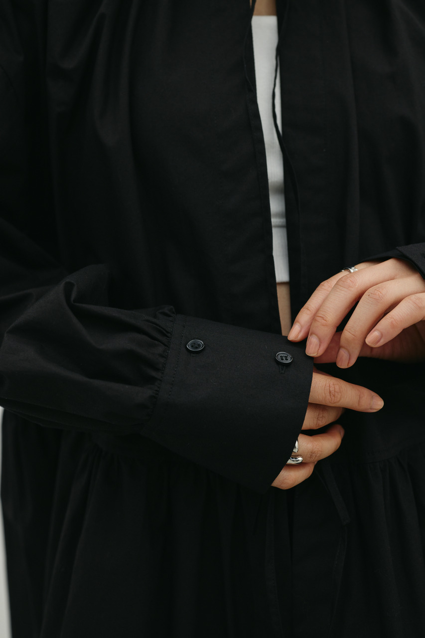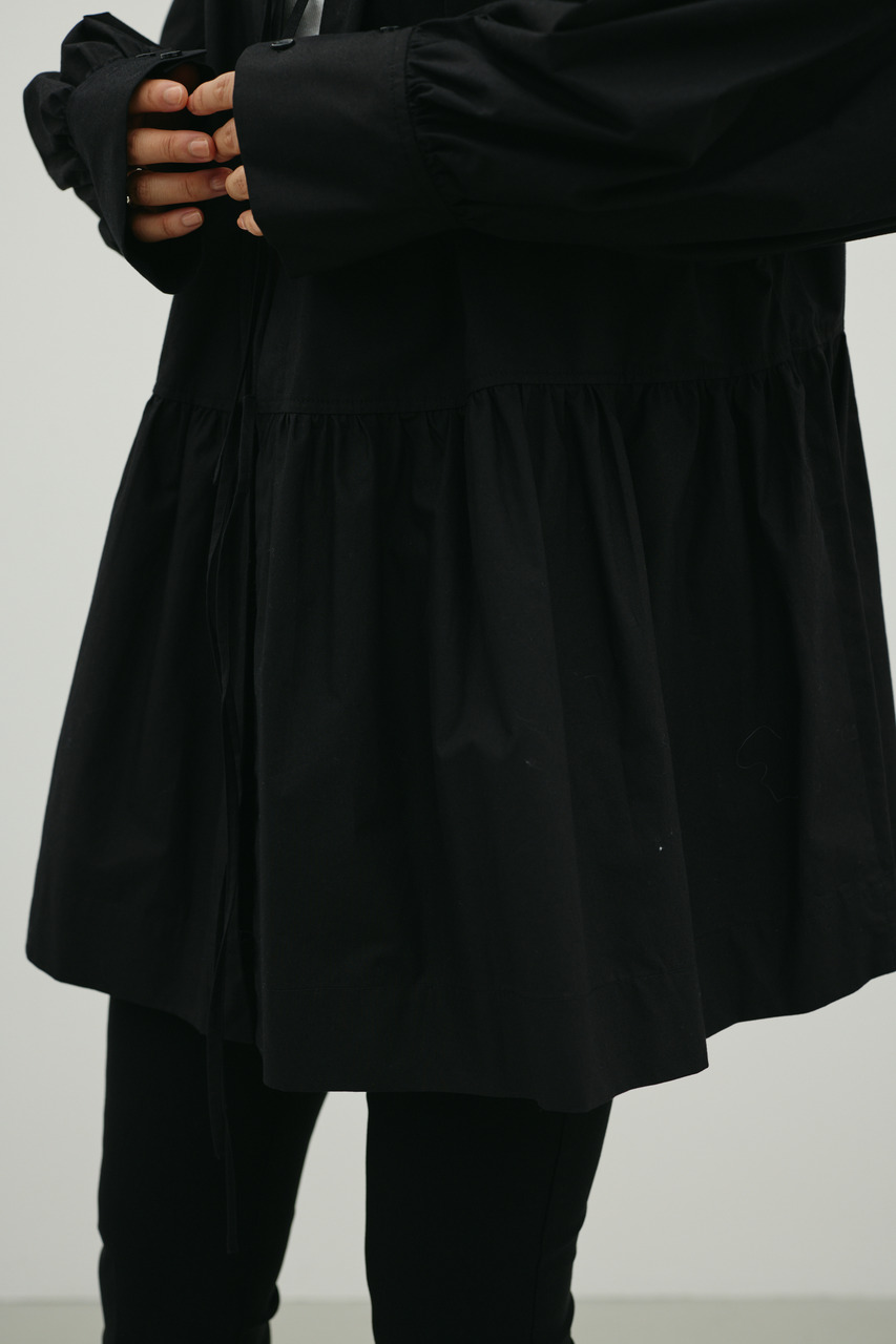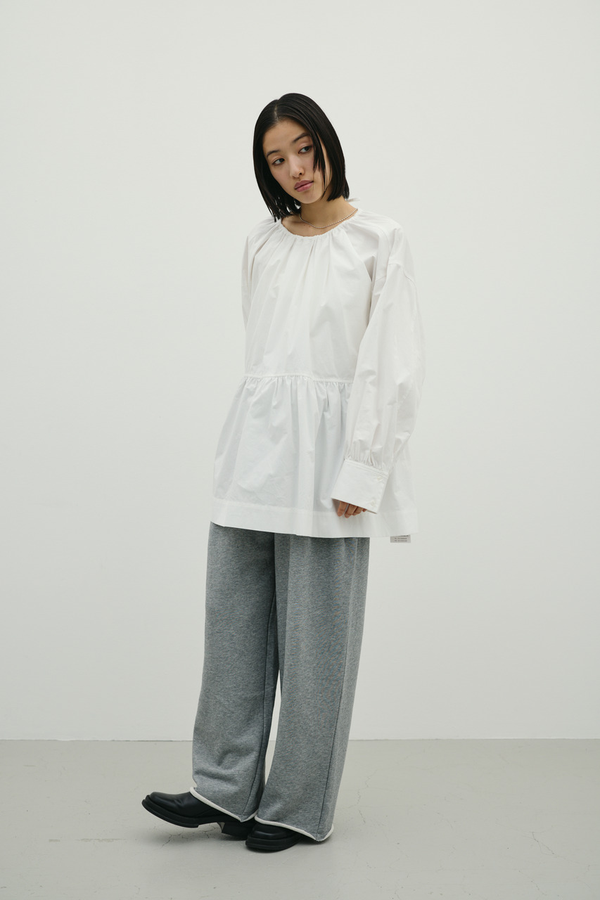 動いた時のフレアシルエットが美しくエアリー感のあるギャザーをたっぷりと寄せたコットンシャツ。前立ては共地リボン開き仕様になっており、前後2WAYで着用可能。衿ぐりの共地リボンは調整可能なため、お好みのネックの開き具合で着用いただけます。袖口はカフス仕様なので、たくしあげてパフっと着用するのがおすすめです。ハリのあるコットンを使用。透け感WHTややあり、ストレッチなし。