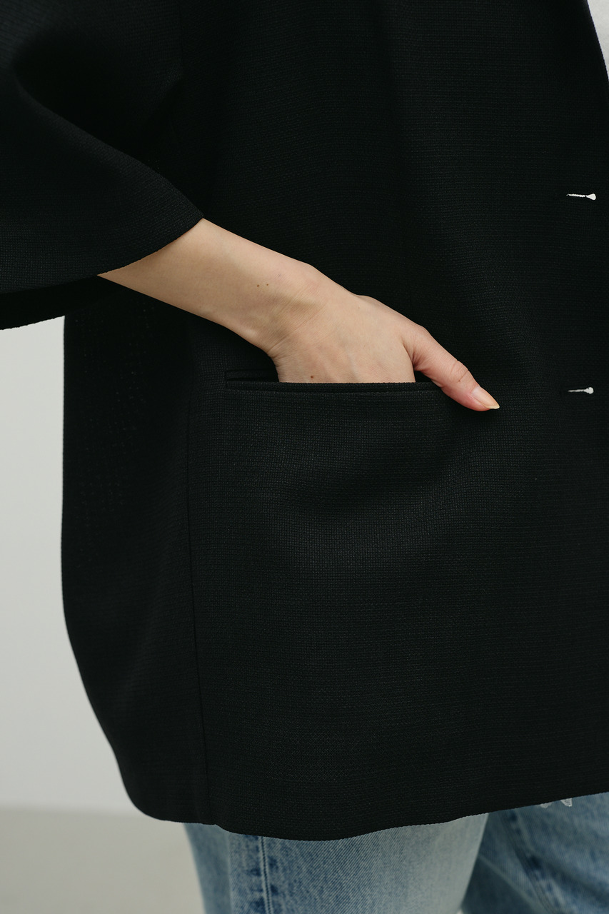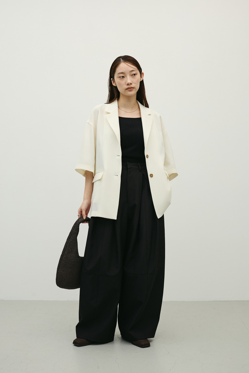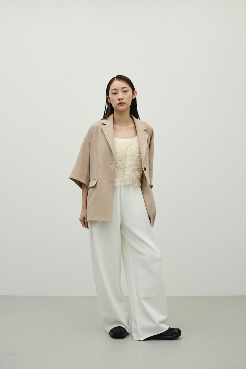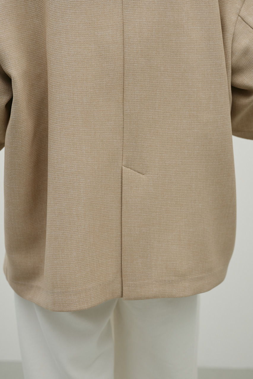 ざっくりとした表情感のあるリネンライクな半袖テーラージャケット。ナチュラルなメランジ調カラーが上品な印象に導きます。マニッシュにもレディにも着こなせるこだわりぬいたサイズ感とカラー展開。シャツのようにラフにスタイリングできるように、裏地は付けずパイピングで軽く仕上げました。500JSB31-1651(リネンライクストレートスカート)とセットアップ着用可能。透け感なし、ストレッチなし。