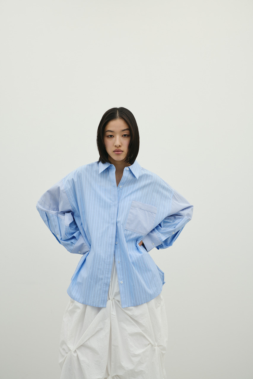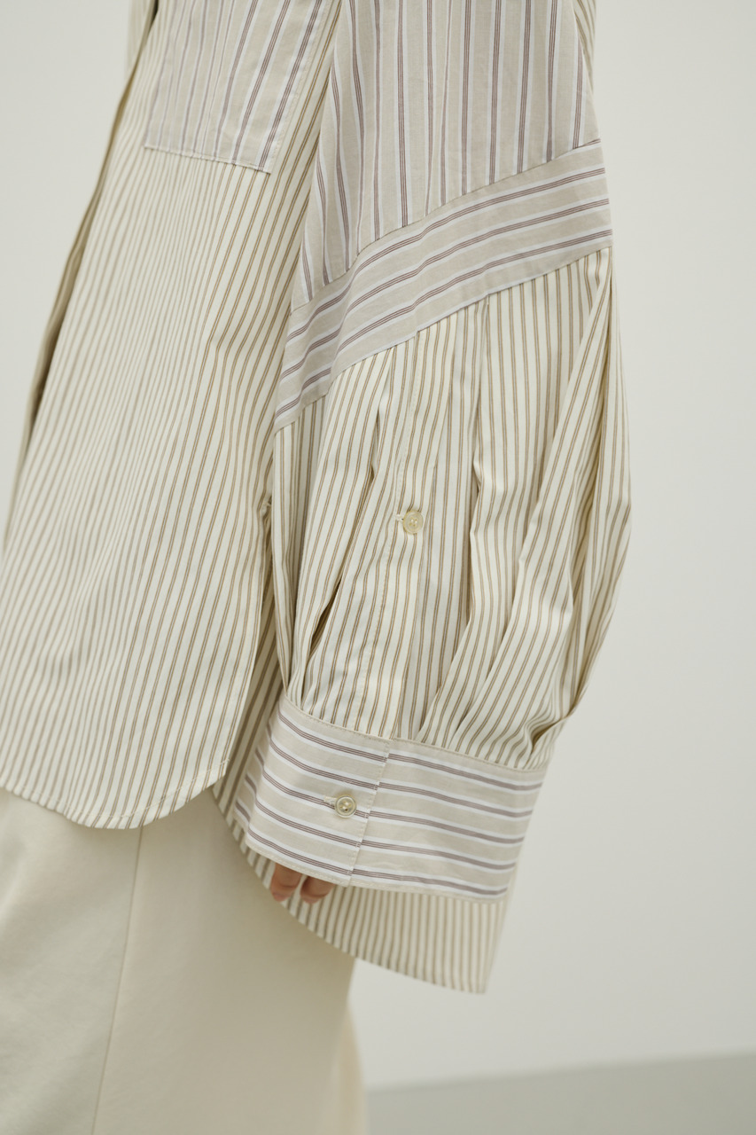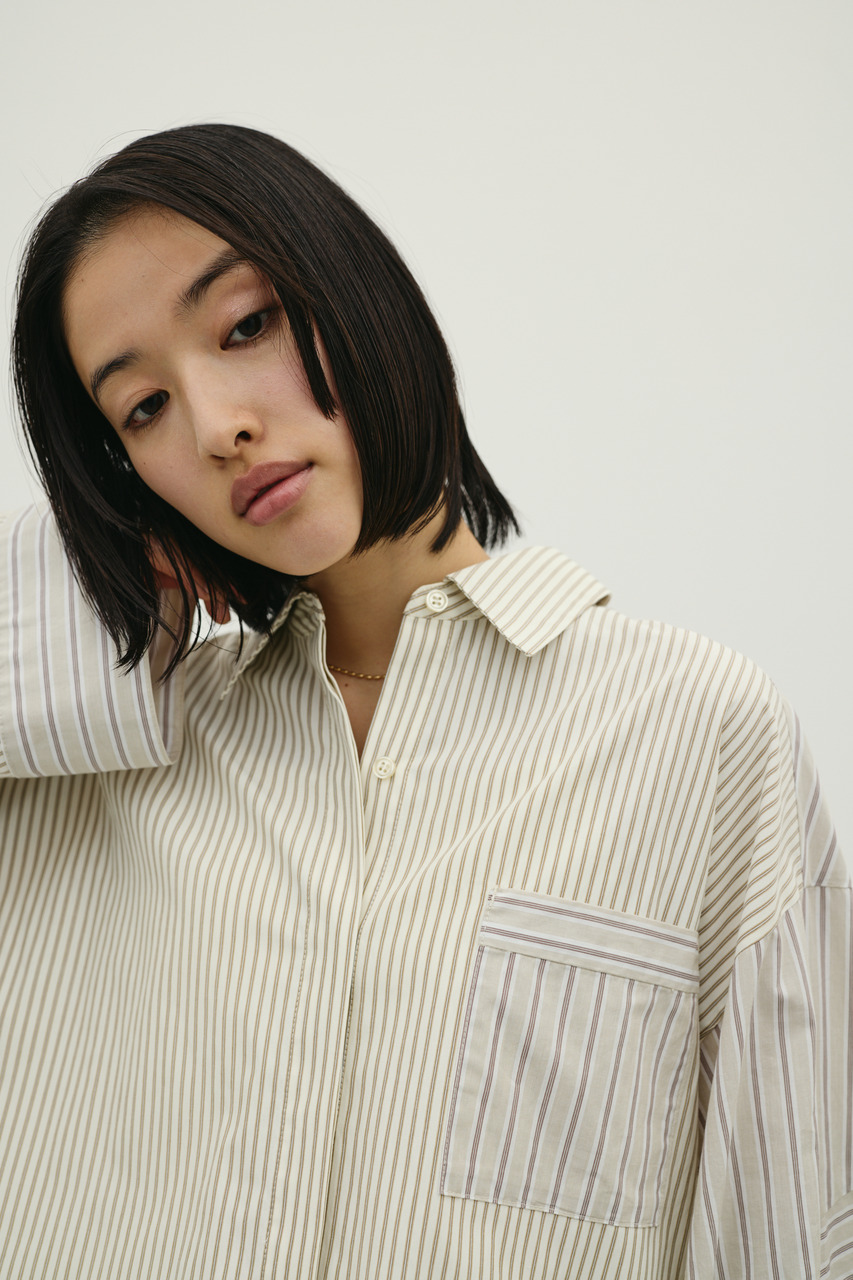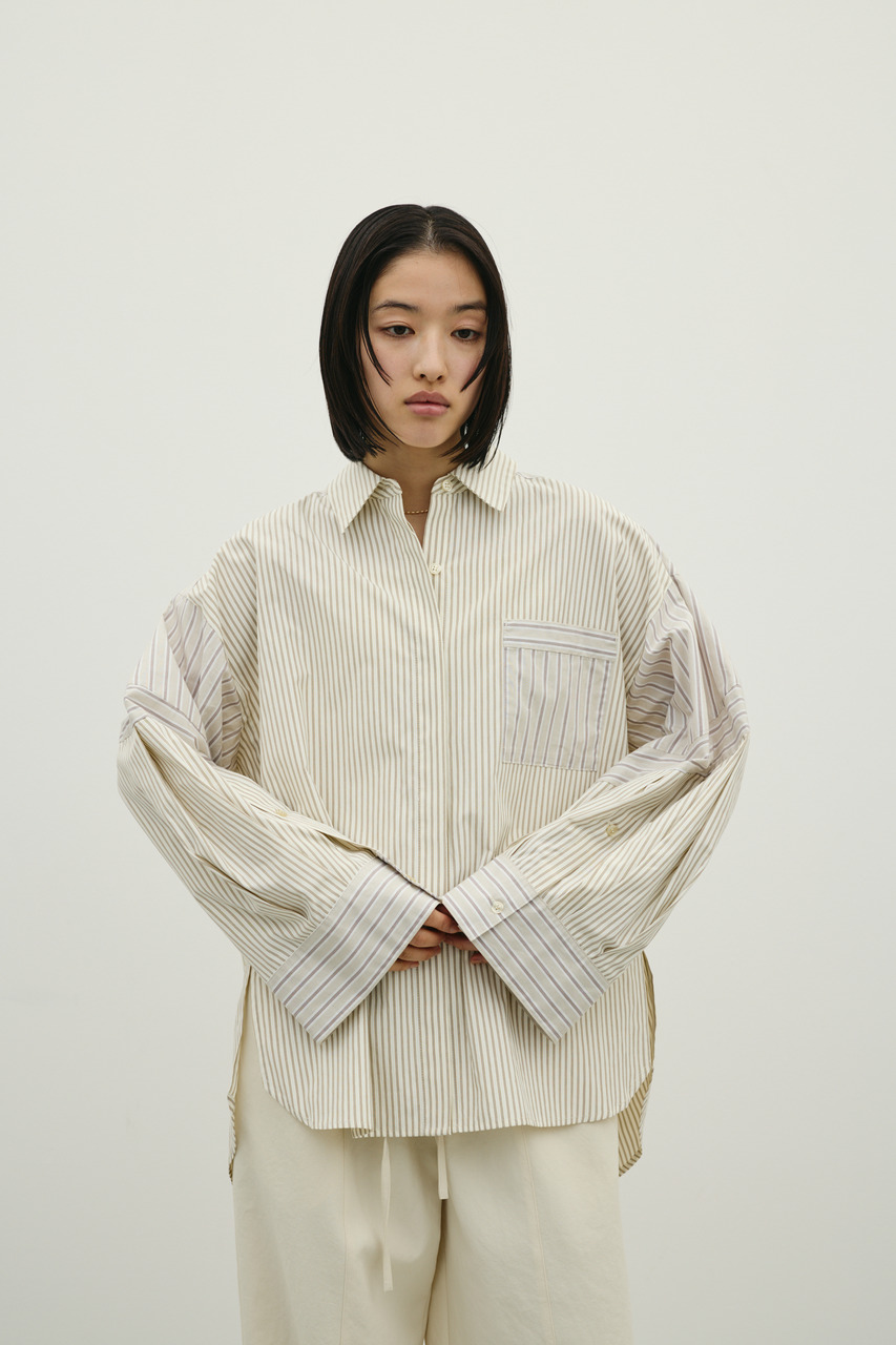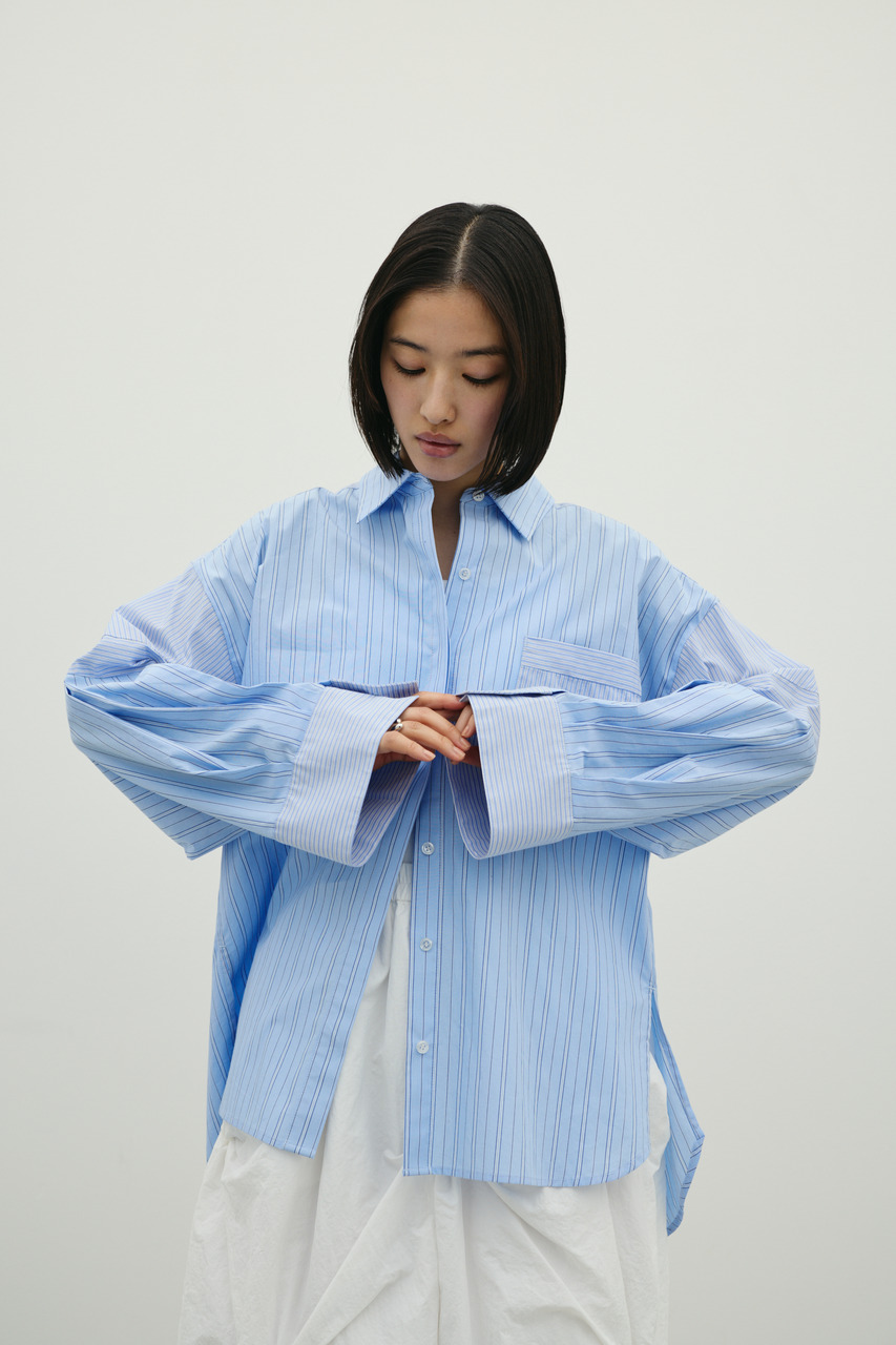 袖口のあきをあえて前側に振ることで、モード感をプラスしたオーバーサイズシャツ。身幅、袖ともに大きめサイズのメンズライクなシルエットで、一枚着としてはもちろん、羽織りとしても幅広いスタイリングが楽しめます。シンプルなホワイトと2種類のストライプを組み合わせた柄展開。細ピッチと太ピッチのストライプをパッチワークのように切り替え、遊び心あふれる他にはないデザインに仕上げました。ストレッチなし、透け感あり。