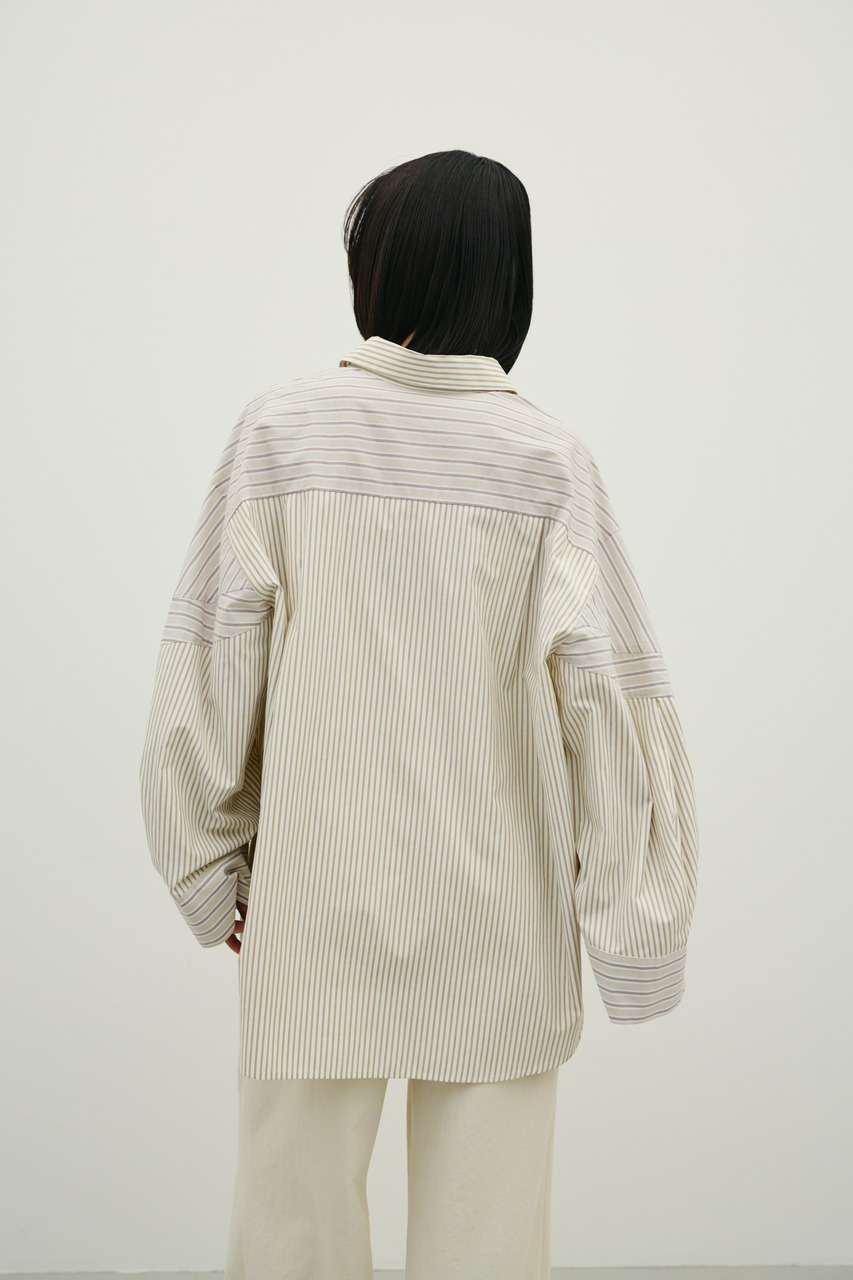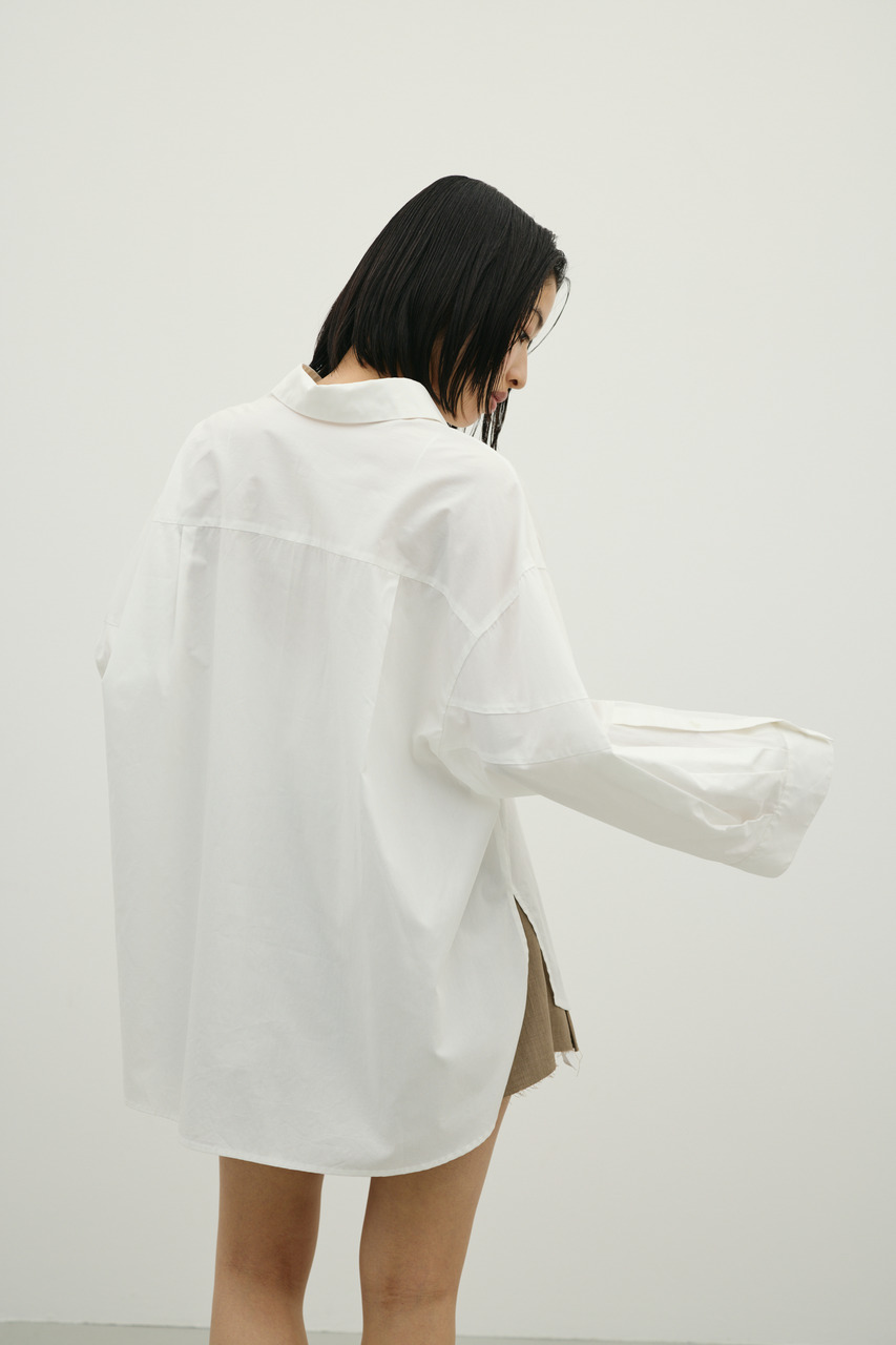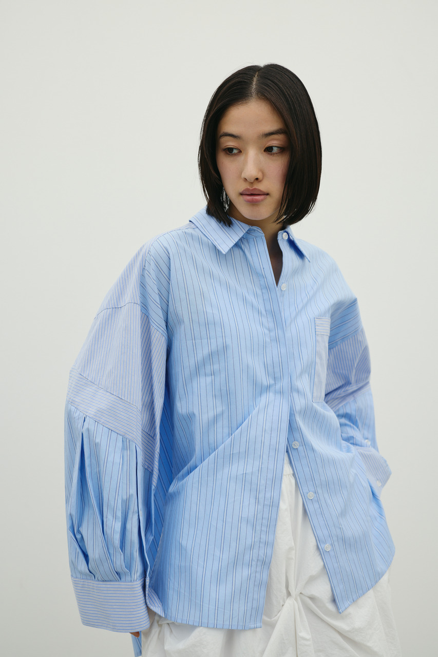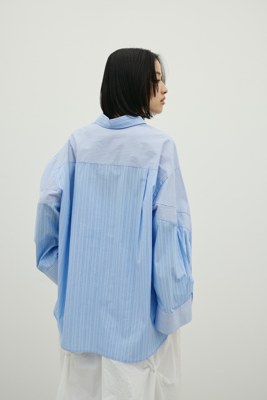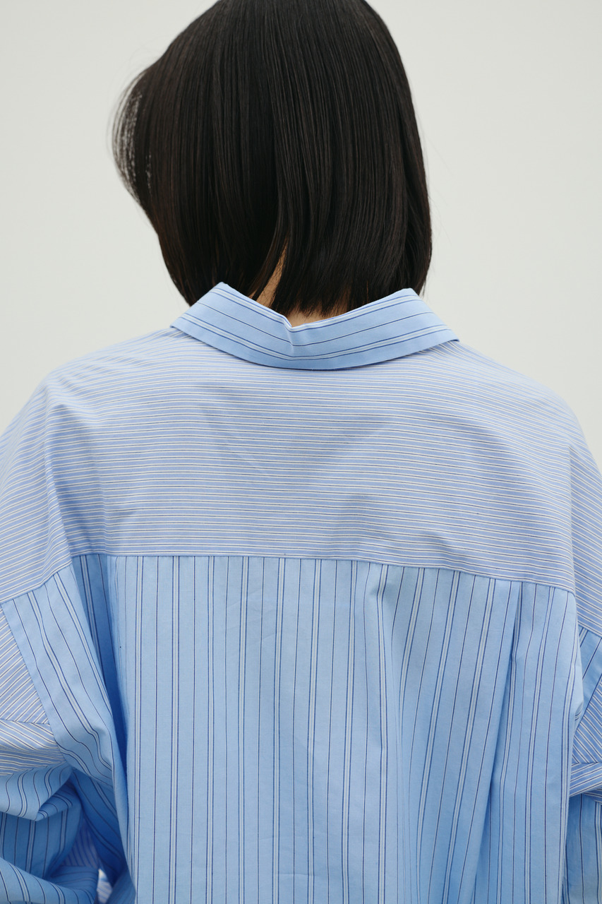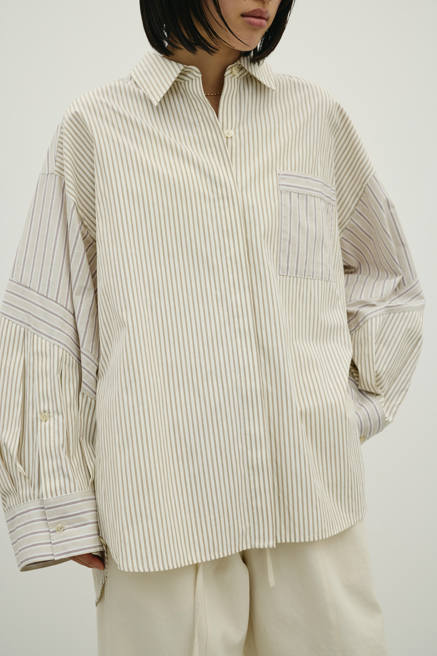 袖口のあきをあえて前側に振ることで、モード感をプラスしたオーバーサイズシャツ。身幅、袖ともに大きめサイズのメンズライクなシルエットで、一枚着としてはもちろん、羽織りとしても幅広いスタイリングが楽しめます。シンプルなホワイトと2種類のストライプを組み合わせた柄展開。細ピッチと太ピッチのストライプをパッチワークのように切り替え、遊び心あふれる他にはないデザインに仕上げました。ストレッチなし、透け感あり。